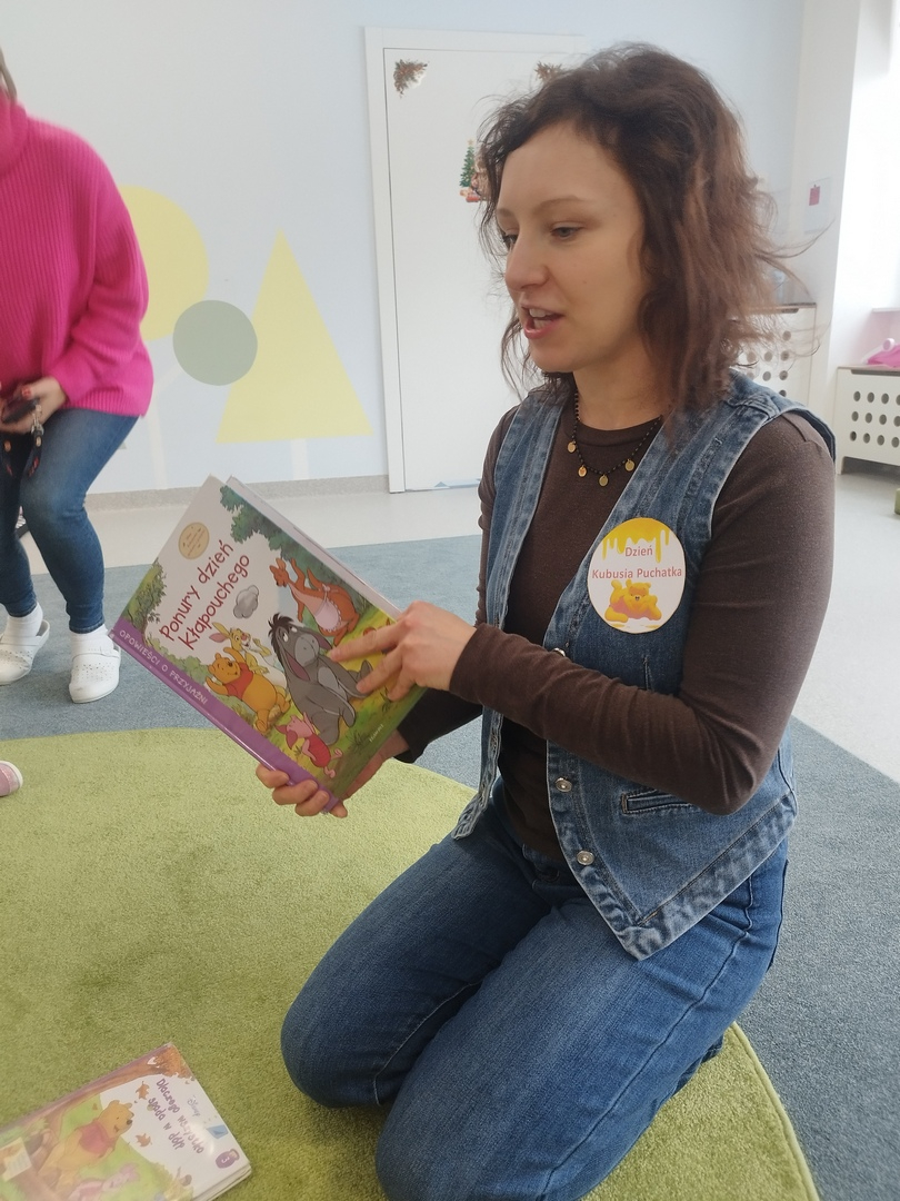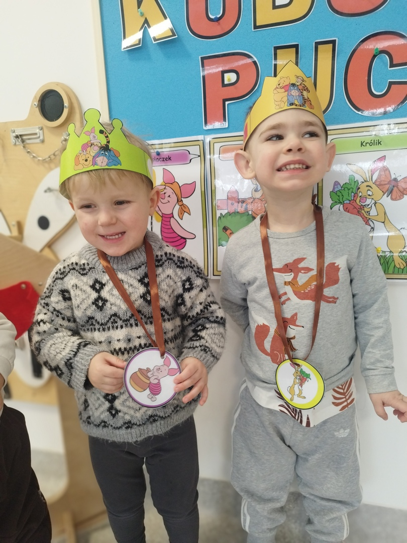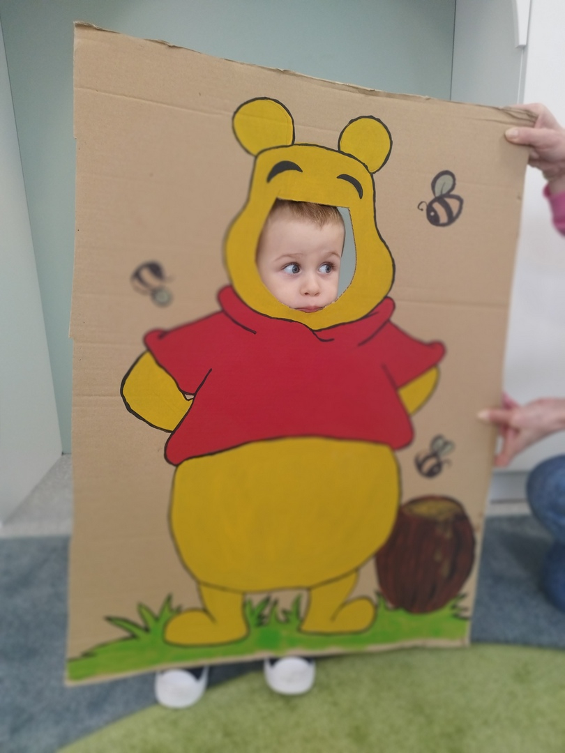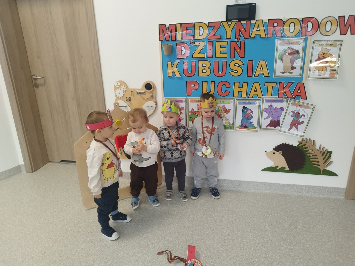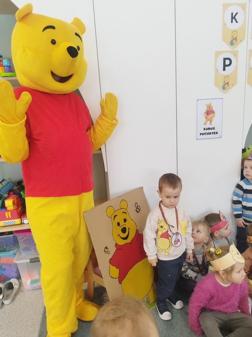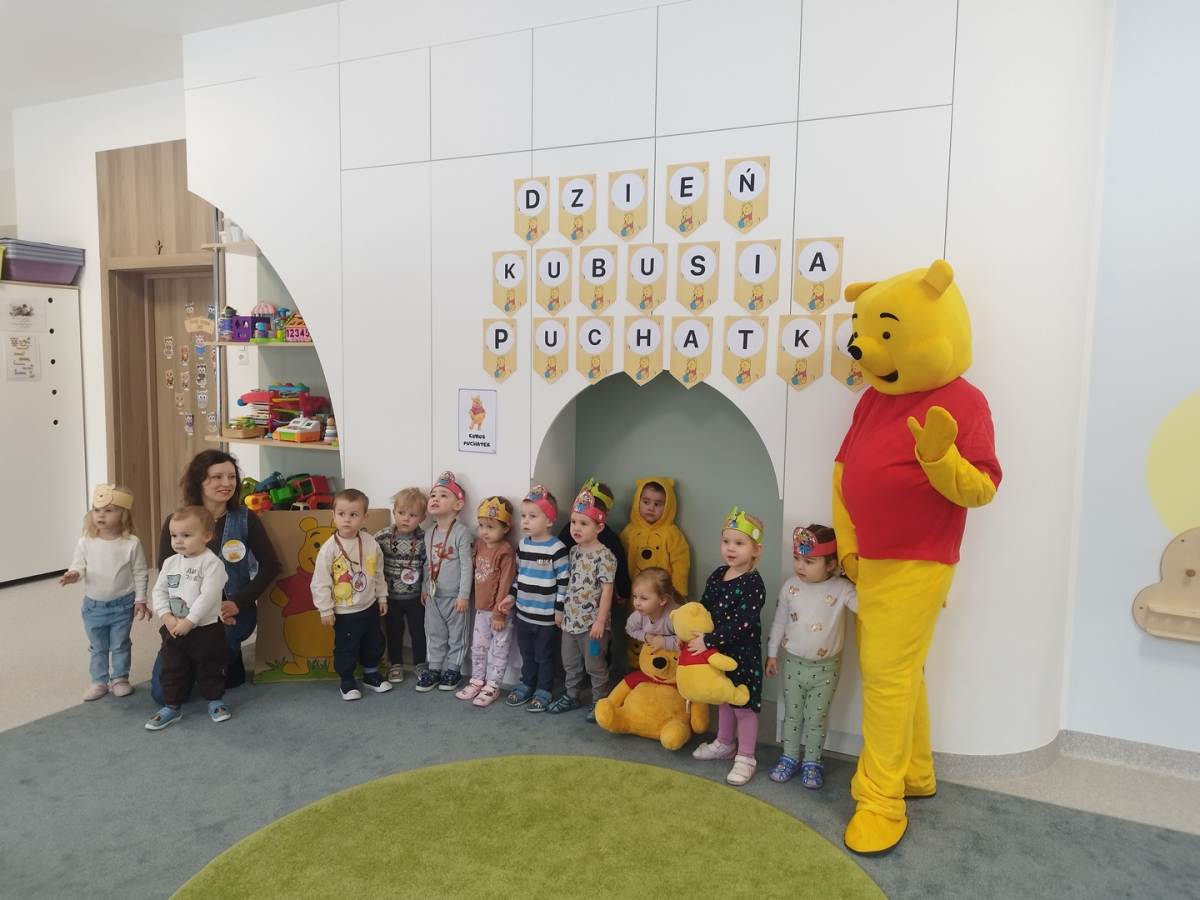 Dzień Kubusia Puchatka w żłobku był bardzo wesoły i pełen przygód. Rano dzieci powitały Kubusia Puchatka i zaczęły wspólne świętowanie. Czytaliśmy książeczki o jego przygodach w Stumilowym Lesie i z zainteresowaniem słuchaliśmy historii o Kubusiu oraz jego przyjaciołach. Poznawaliśmy bohaterów z bajki – Prosiaczka, Tygryska, Kłapouchego i Królika. Rozmawialiśmy o tym, jacy są i co najbardziej lubią robić. Dzieci chętnie dzieliły się swoimi spostrzeżeniami i uczyły się, czym jest przyjaźń. Na zakończenie czekała na nas słodka niespodzianka – jedliśmy miodek, tak jak lubi to Kubuś Puchatek. To był radosny dzień pełen uśmiechów, zabawy i wspólnego odkrywania bajkowego świata.