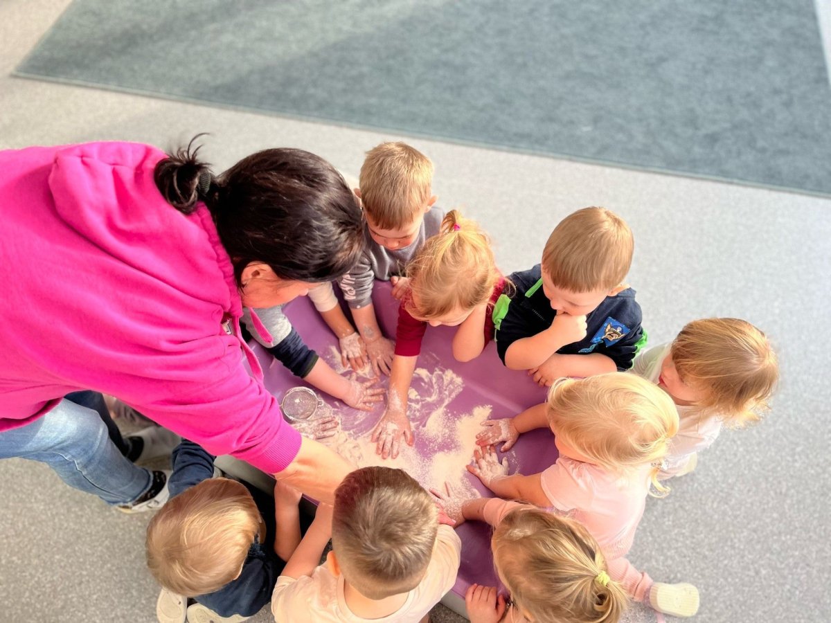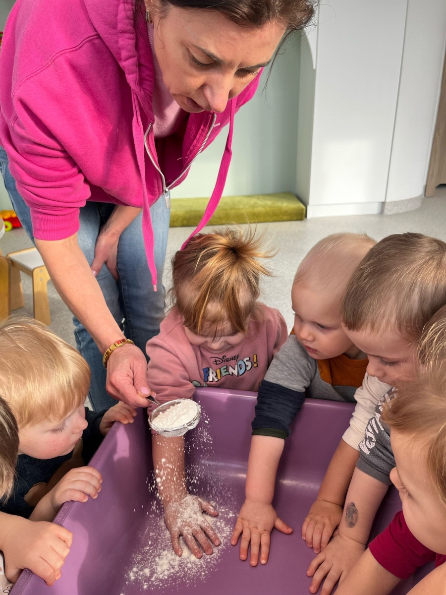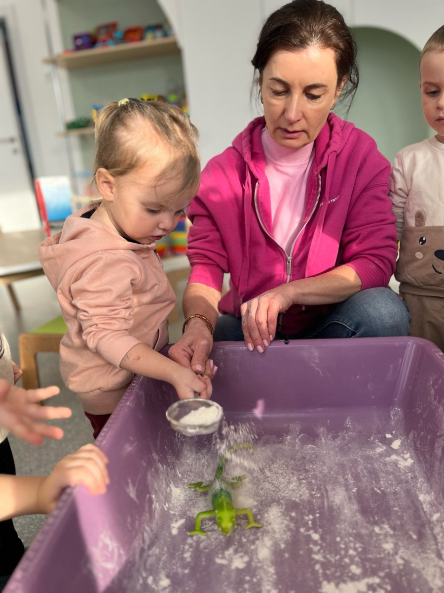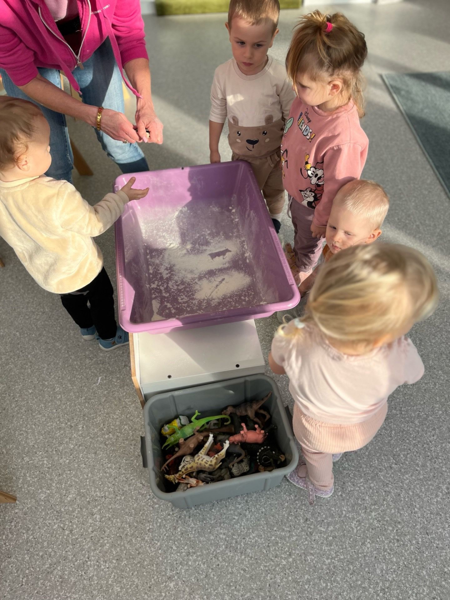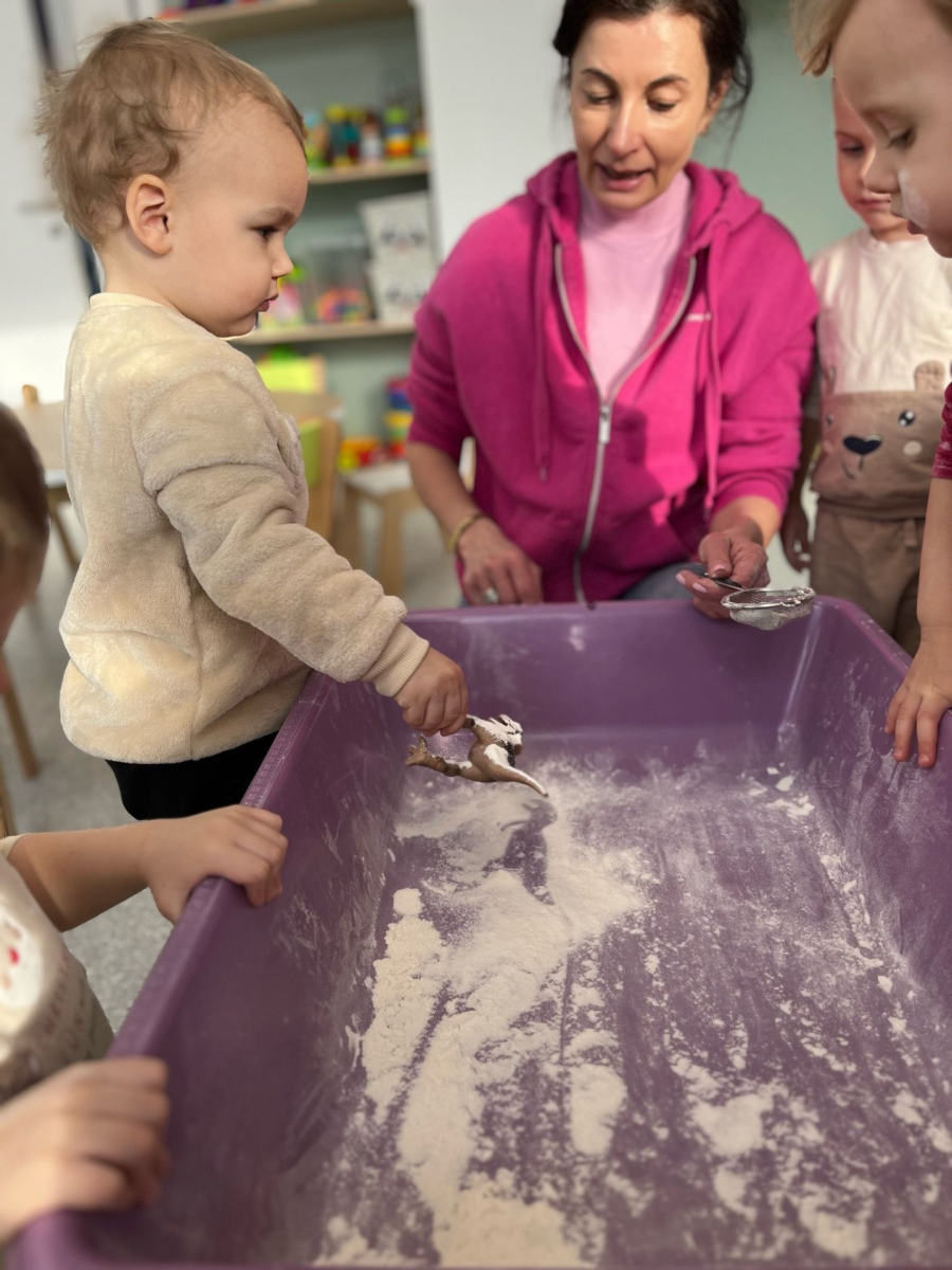 Biedroneczki dzisiaj poczuły spadający śnieg na rączkach. Z wykorzystaniem mąki i sitka przeniosły się do krainy dinozaurów gdzie odbijały ich cienie tworząc własne historię. W ten sposób rozwijały zmysły dotyku, koordynację oko- ręka oraz wyobraźnię i kreatywność.