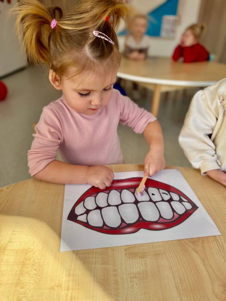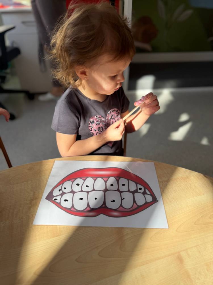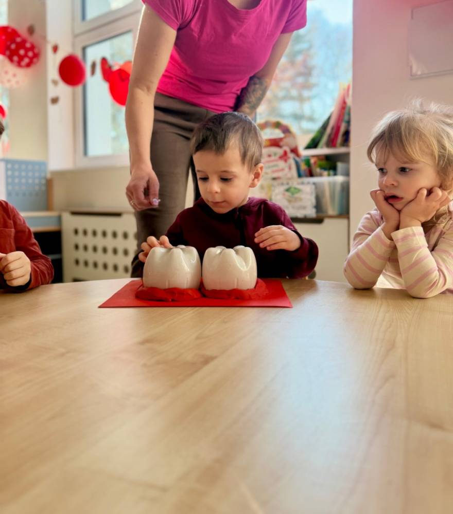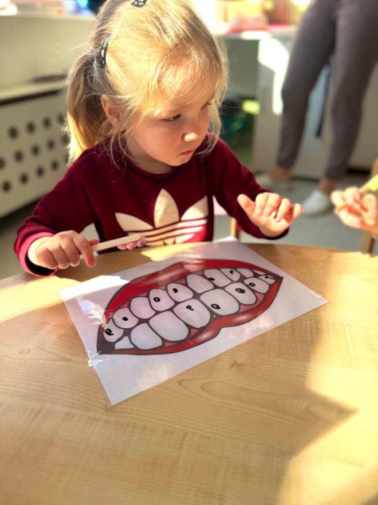 Dziś w grupie Elfy obchodziliśmy Dzień Dentysty. Podczas zajęć dzieci poznały budowę zęba – dowiedziały się, czym jest szkliwo, co kryje się w jego środku i dlaczego ząbki są takie twarde. Rozmawialiśmy także o tym, co im szkodzi, a co pomaga zachować je zdrowe i mocne.
