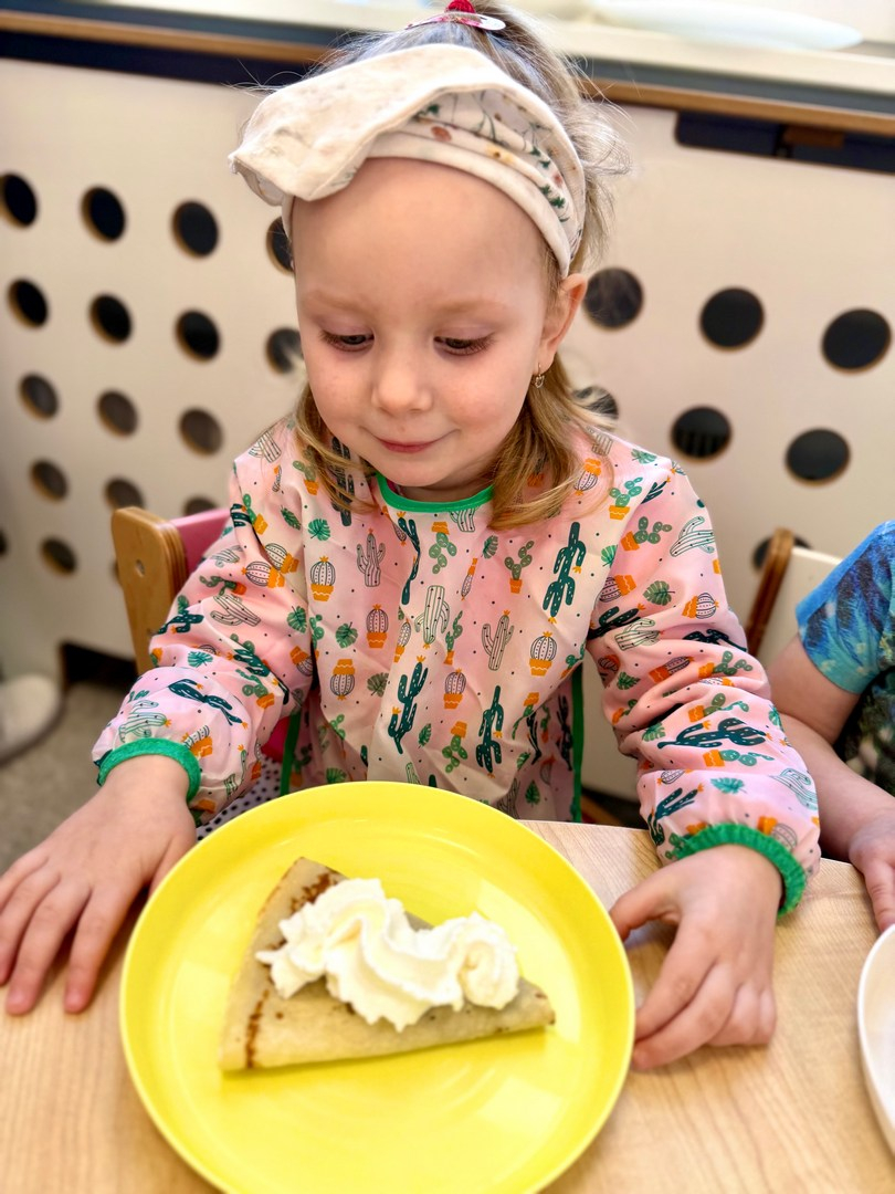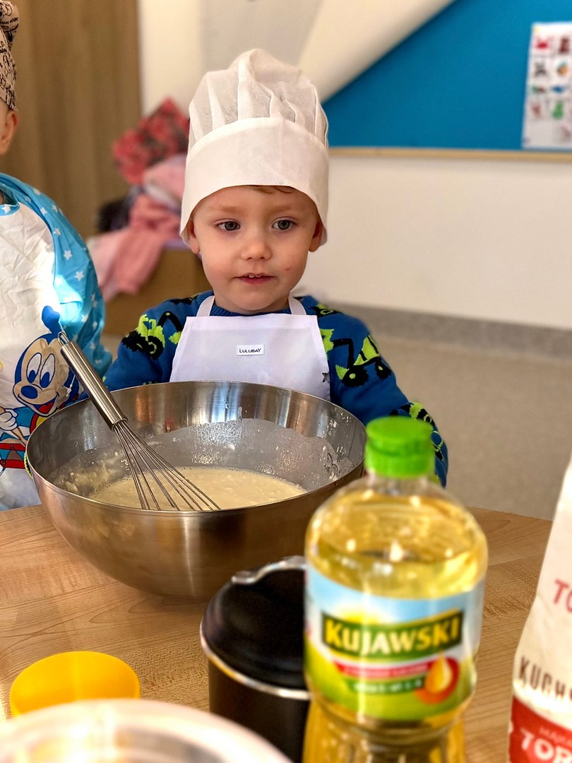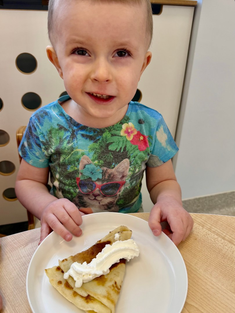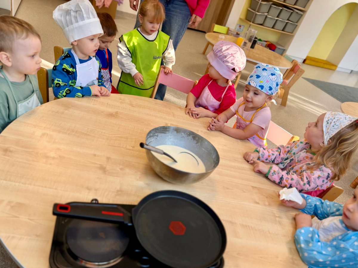 Pewnego dnia w naszym żłobku zrobiło się pachnąco, wesoło i bardzo… naleśnikowo! Dzieci świętowały Dzień Naleśnika, biorąc udział w kulinarnych warsztatach. Mali kucharze dowiedzieli się, z jakich składników powstają naleśniki oraz krok po kroku poznali sposób ich przygotowania. Następnie, wspólnie z ciociami, zabrali się do działania i własnoręcznie przygotowali to przepyszne danie. Na koniec nie mogło zabraknąć degustacji— naleśniki znikały z talerzy w mgnieniu oka!