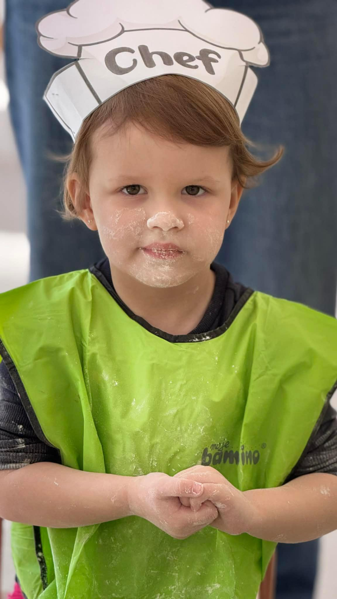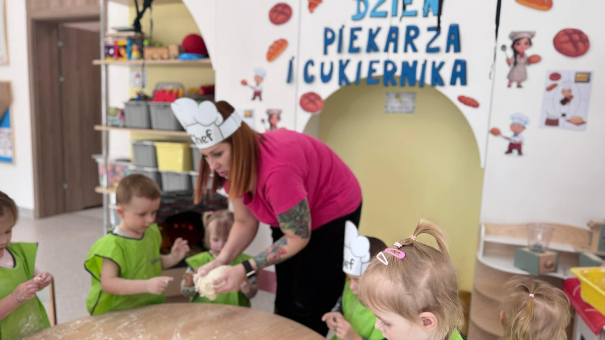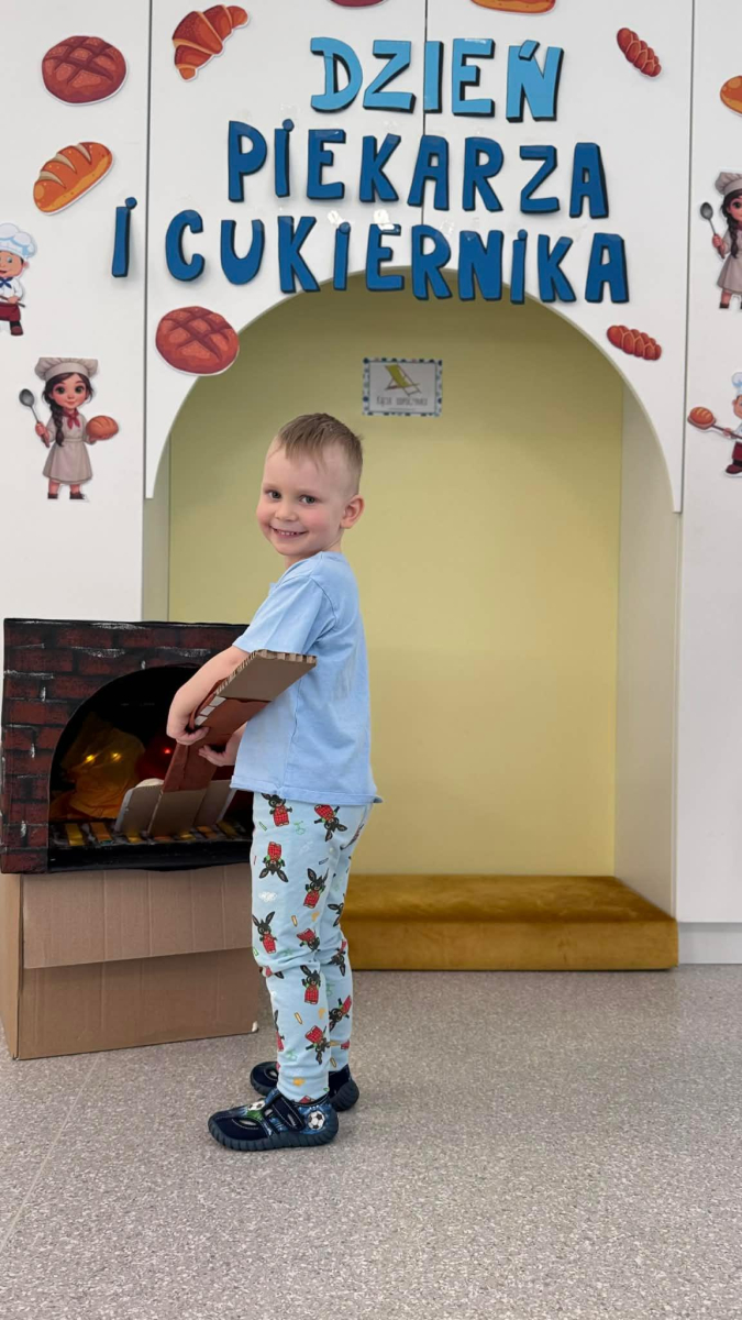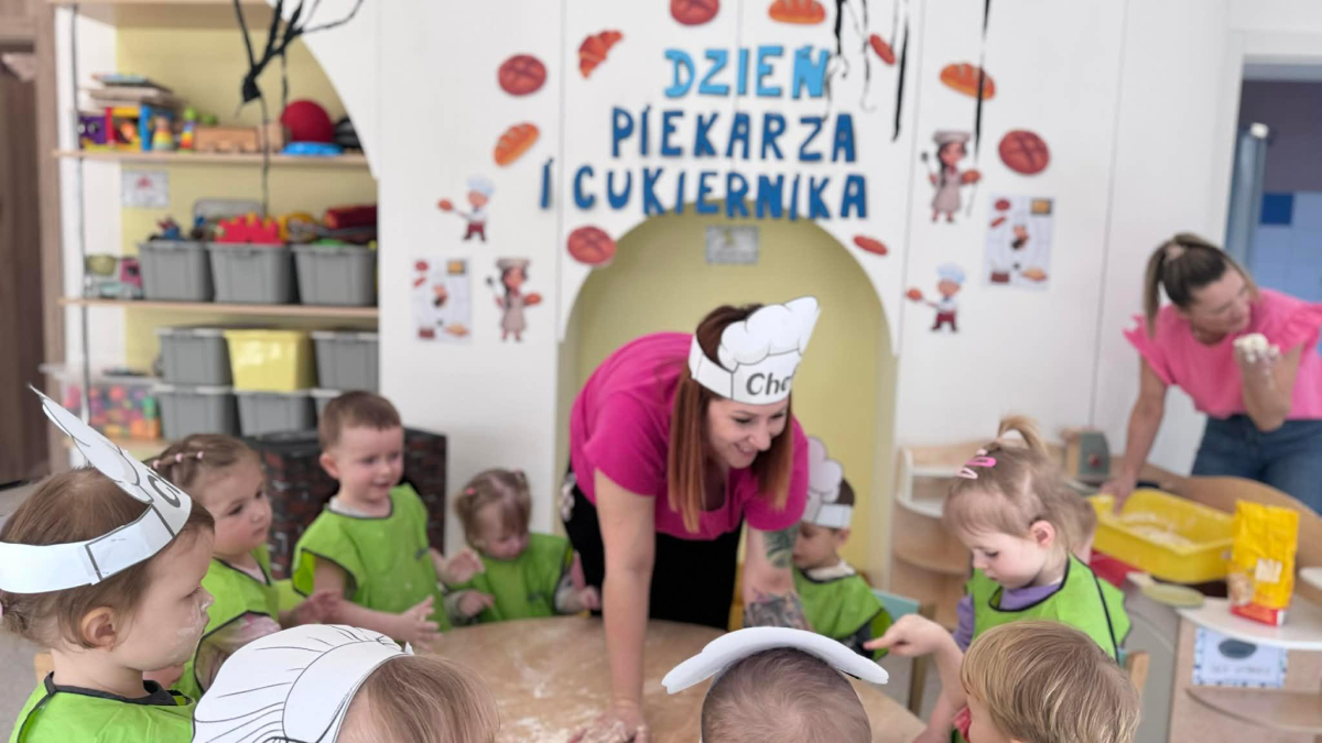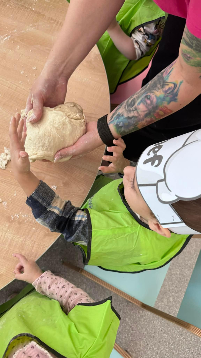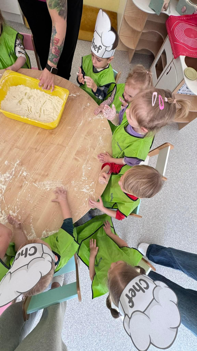 Dzień Piekarza i Cukiernika to doskonała okazja do zabaw sensorycznych, które dzieci uwielbiają! Maluchy miały okazję poznać mąkę – określiły ją jako mięciutki puch, który przyjemnie przesypywał się między paluszkami. Wspólne wyrabianie i ugniatanie ciasta było nie tylko świetną zabawą, ale także doskonałym ćwiczeniem motoryki małej, siły dłoni oraz kreatywności. Dzieci z ogromnym zaangażowaniem mieszały, ugniatały i formowały swoje małe wypieki, rozwijając przy tym wyobraźnię i sprawność rączek.To był dzień pełen nowych doświadczeń, radości i sensorycznych odkryć!