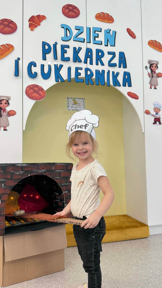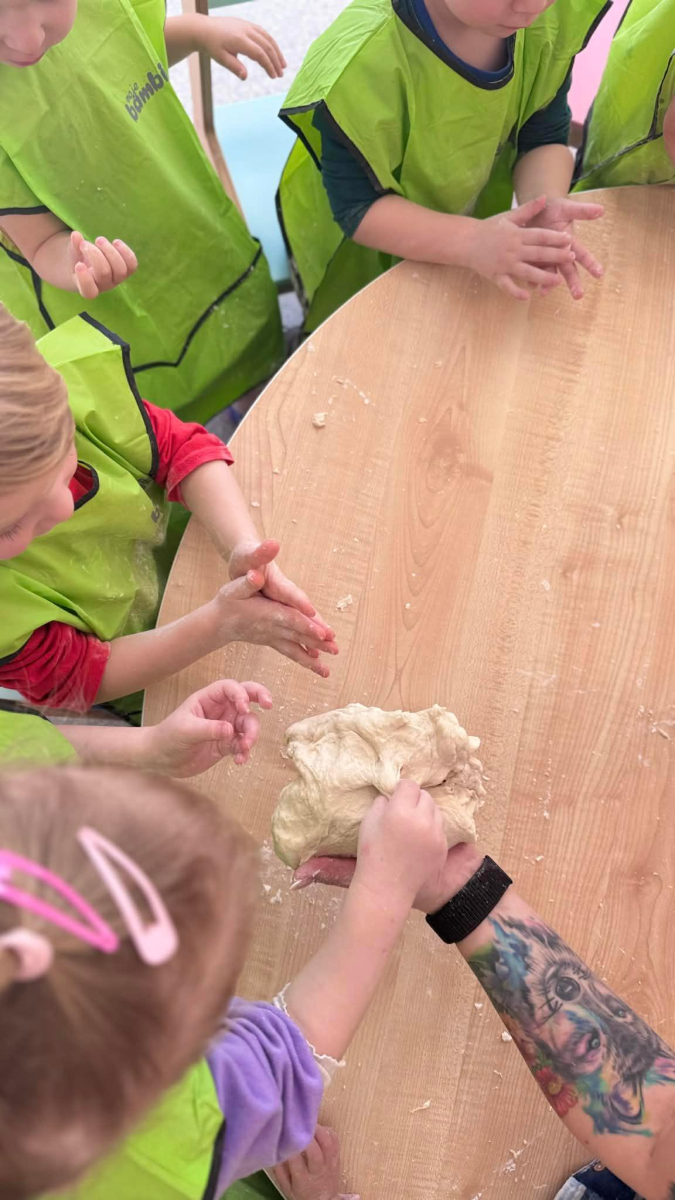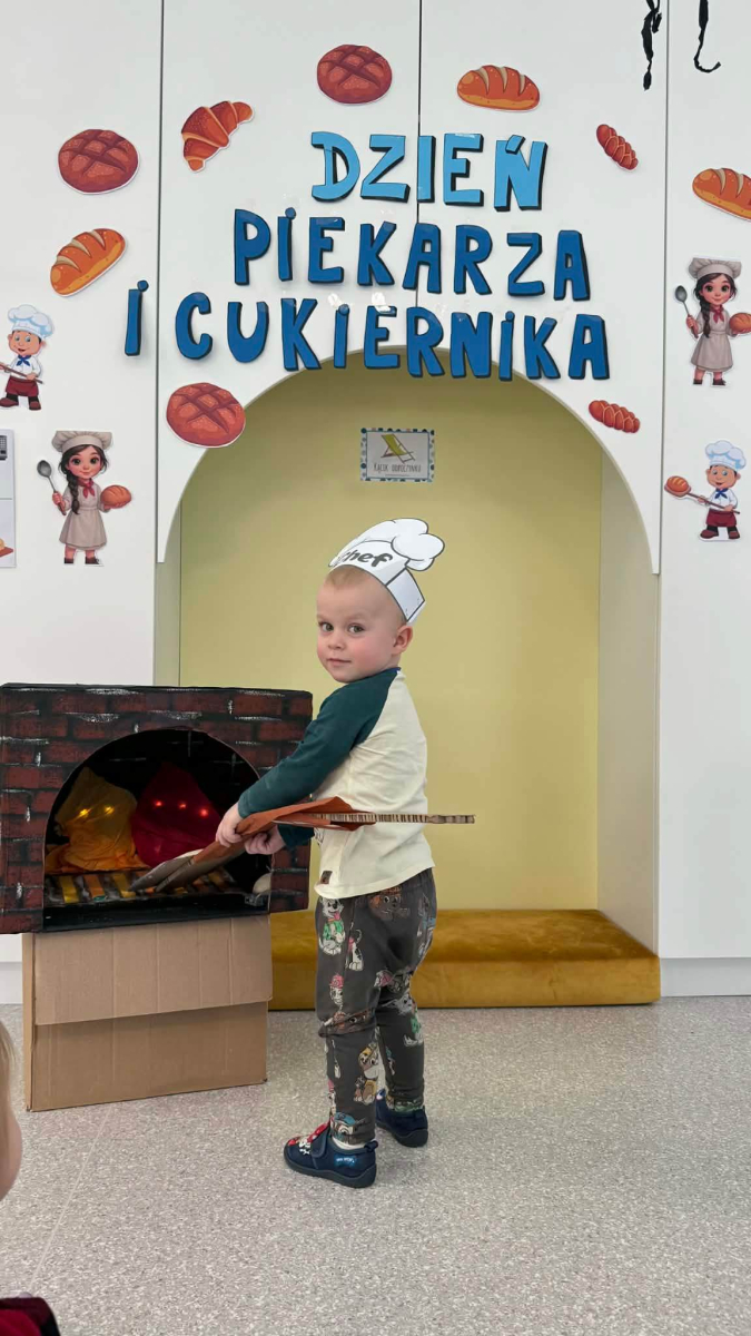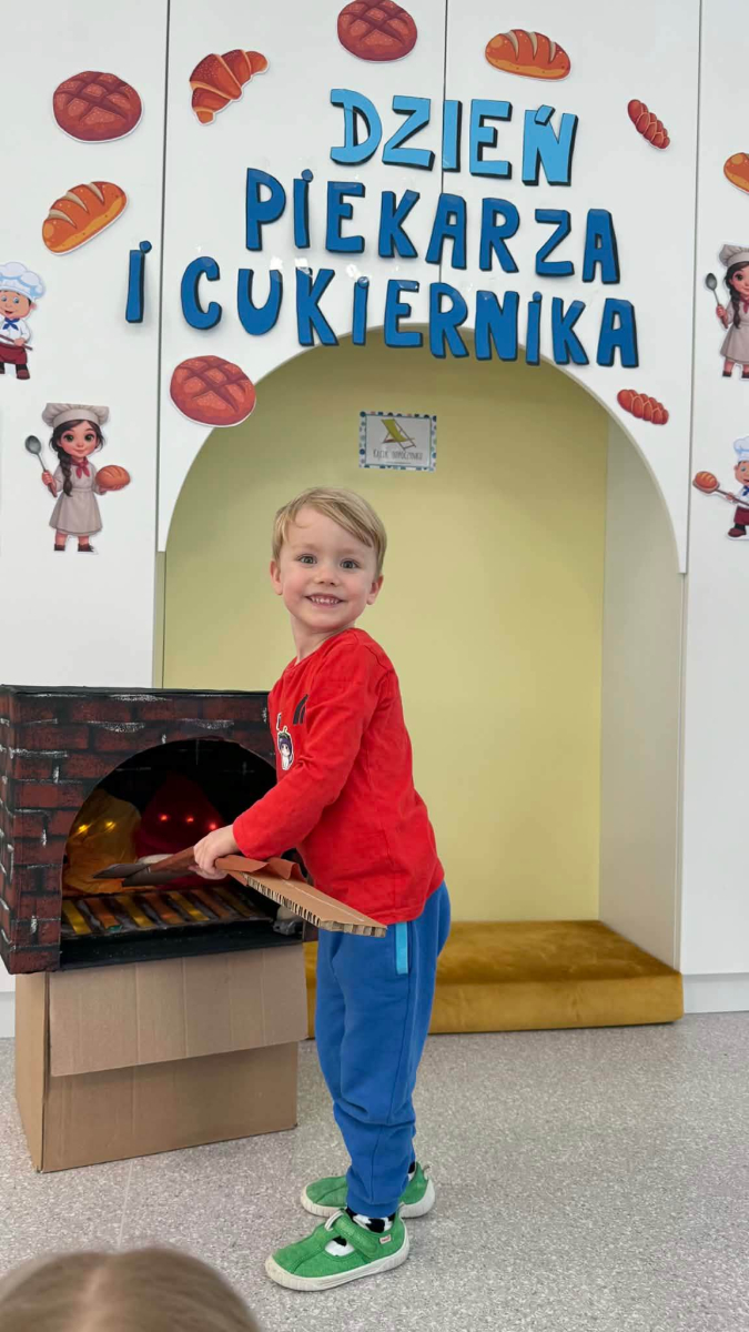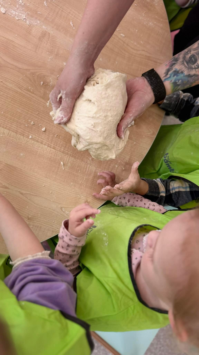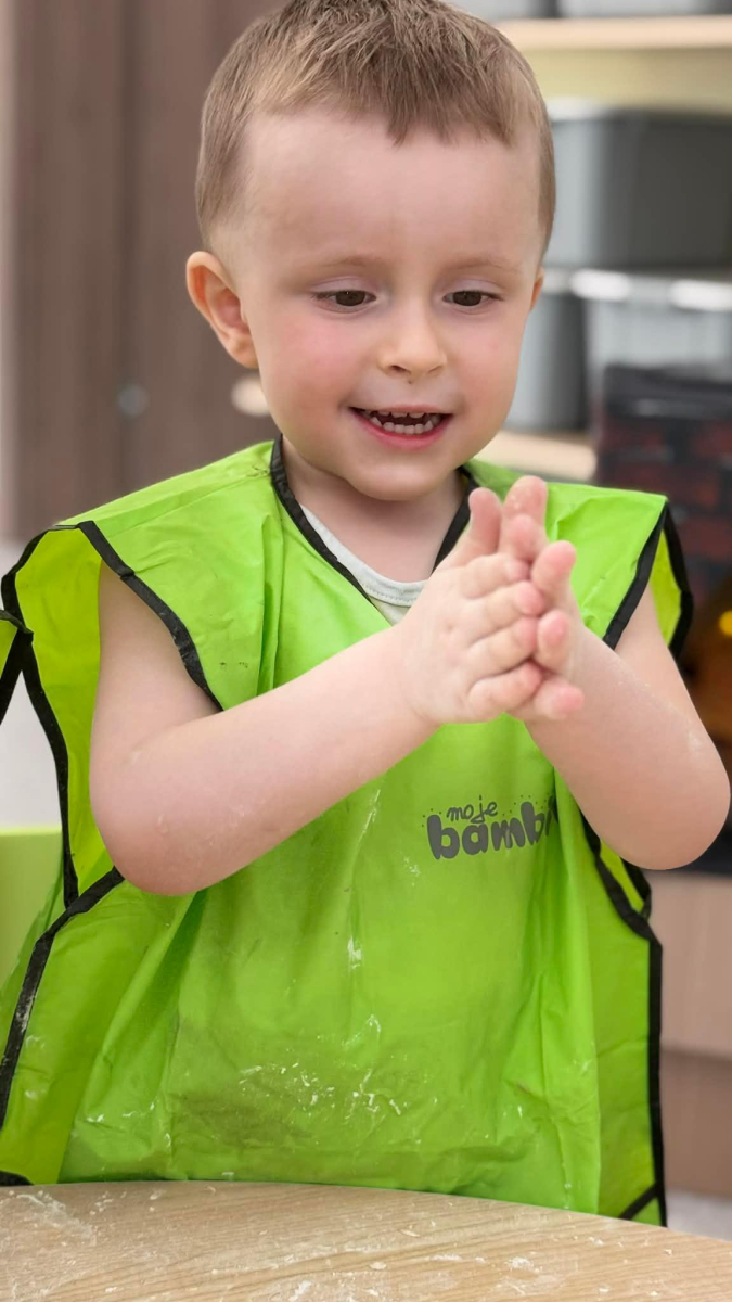Dzień Piekarza i Cukiernika to doskonała okazja do zabaw sensorycznych, które dzieci uwielbiają! Maluchy miały okazję poznać mąkę – określiły ją jako mięciutki puch, który przyjemnie przesypywał się między paluszkami. Wspólne wyrabianie i ugniatanie ciasta było nie tylko świetną zabawą, ale także doskonałym ćwiczeniem motoryki małej, siły dłoni oraz kreatywności. Dzieci z ogromnym zaangażowaniem mieszały, ugniatały i formowały swoje małe wypieki, rozwijając przy tym wyobraźnię i sprawność rączek.To był dzień pełen nowych doświadczeń, radości i sensorycznych odkryć!