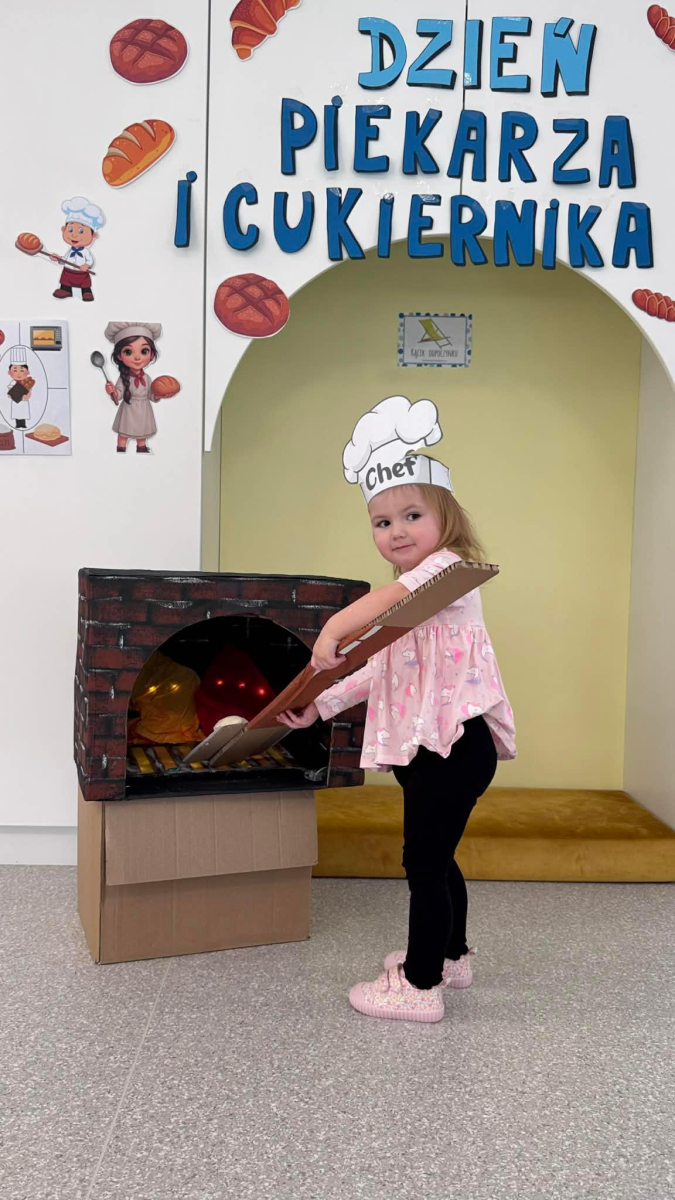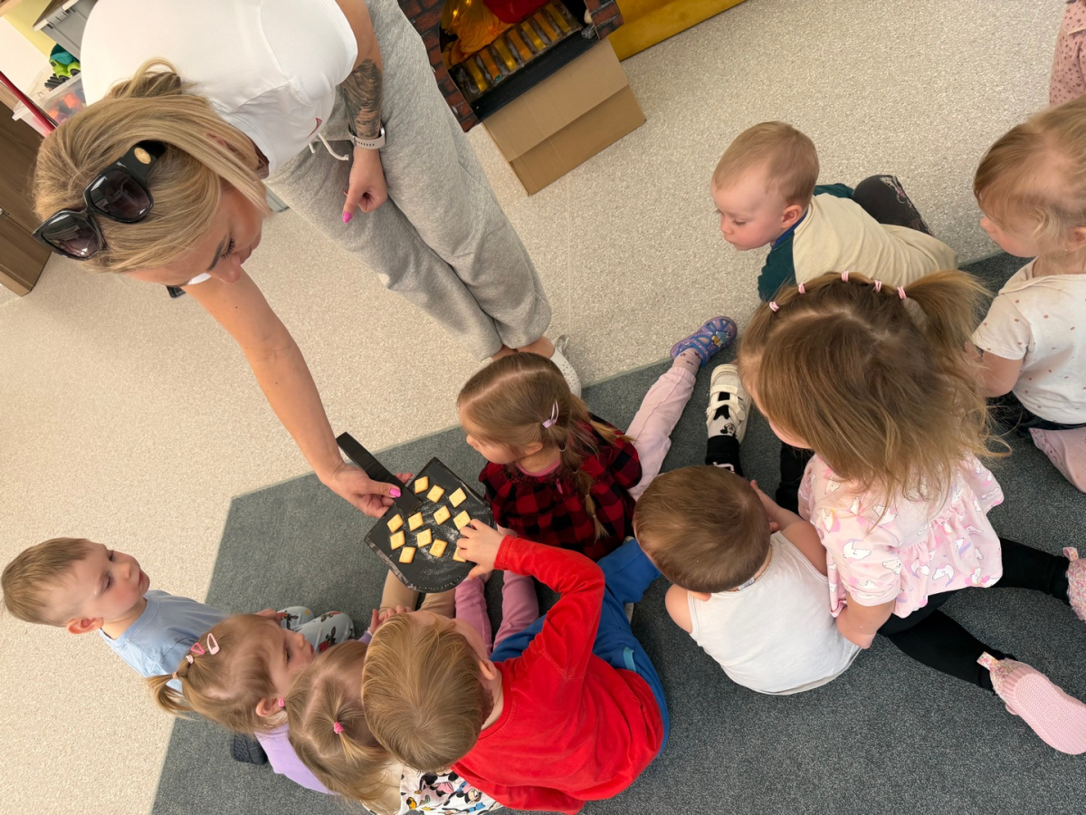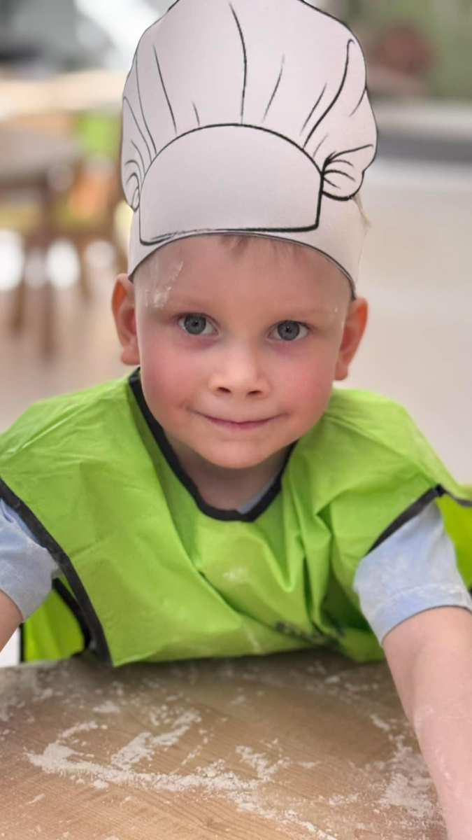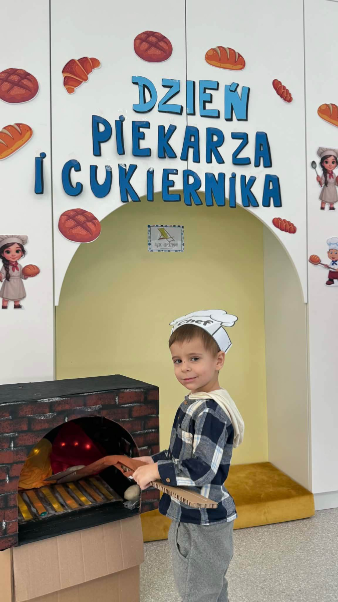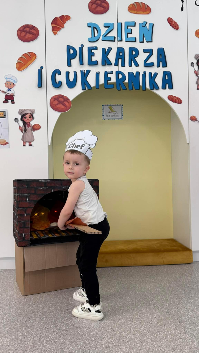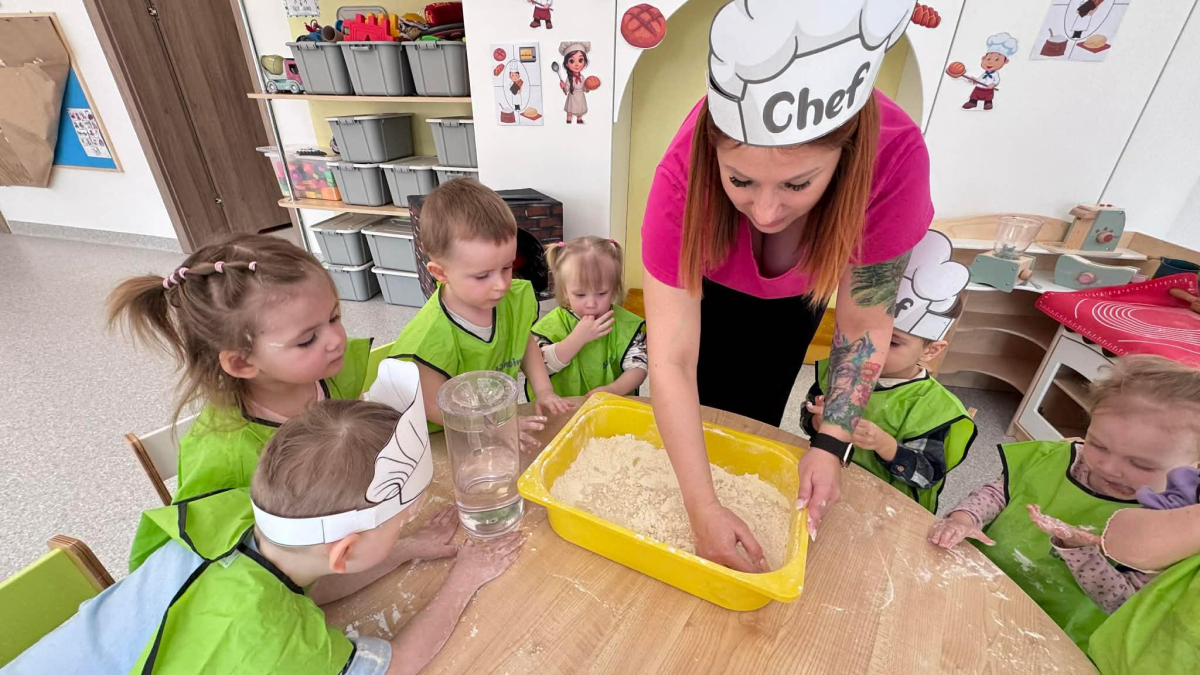 Dzień Piekarza i Cukiernika to doskonała okazja do zabaw sensorycznych, które dzieci uwielbiają! Maluchy miały okazję poznać mąkę – określiły ją jako mięciutki puch, który przyjemnie przesypywał się między paluszkami. Wspólne wyrabianie i ugniatanie ciasta było nie tylko świetną zabawą, ale także doskonałym ćwiczeniem motoryki małej, siły dłoni oraz kreatywności. Dzieci z ogromnym zaangażowaniem mieszały, ugniatały i formowały swoje małe wypieki, rozwijając przy tym wyobraźnię i sprawność rączek.To był dzień pełen nowych doświadczeń, radości i sensorycznych odkryć!