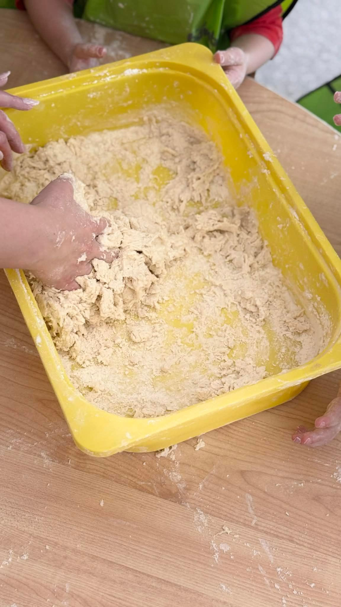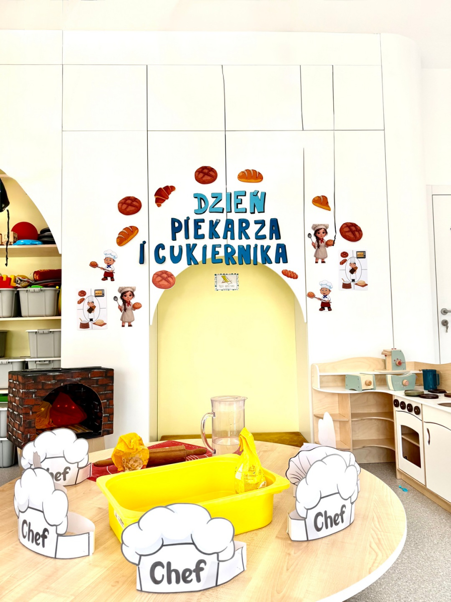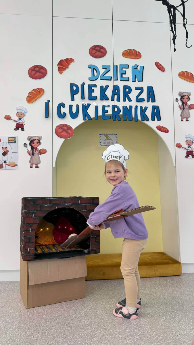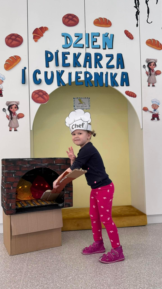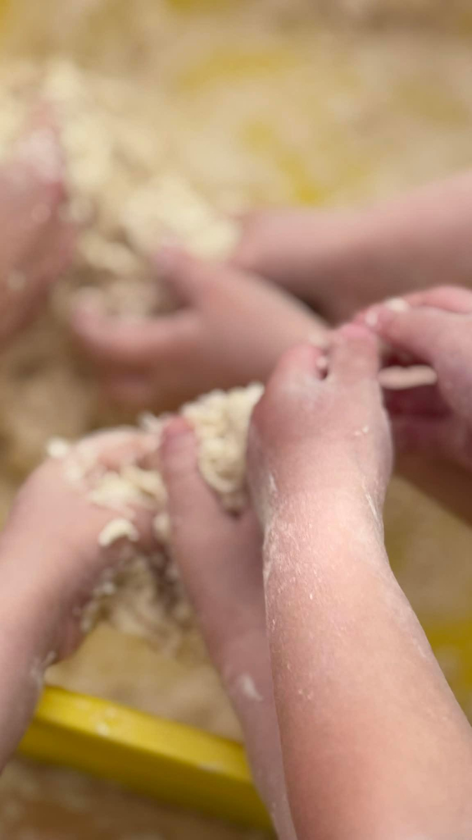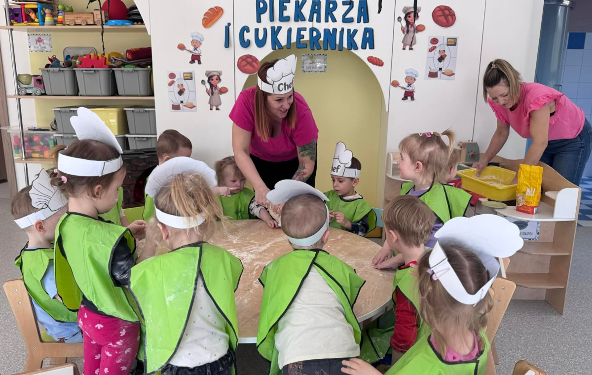 Dzień Piekarza i Cukiernika to doskonała okazja do zabaw sensorycznych, które dzieci uwielbiają! Maluchy miały okazję poznać mąkę – określiły ją jako mięciutki puch, który przyjemnie przesypywał się między paluszkami. Wspólne wyrabianie i ugniatanie ciasta było nie tylko świetną zabawą, ale także doskonałym ćwiczeniem motoryki małej, siły dłoni oraz kreatywności. Dzieci z ogromnym zaangażowaniem mieszały, ugniatały i formowały swoje małe wypieki, rozwijając przy tym wyobraźnię i sprawność rączek.To był dzień pełen nowych doświadczeń, radości i sensorycznych odkryć!