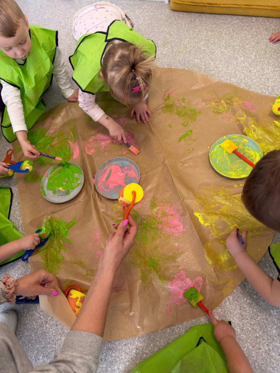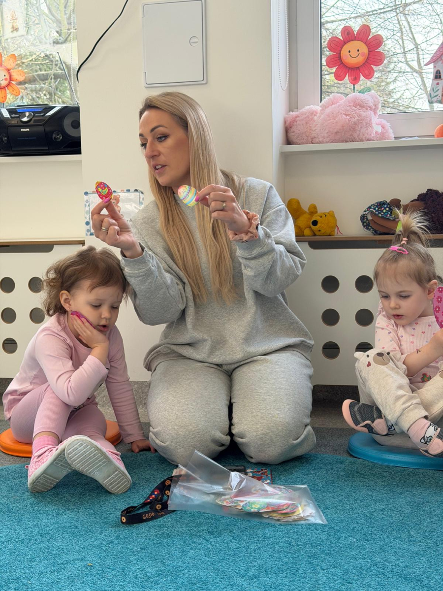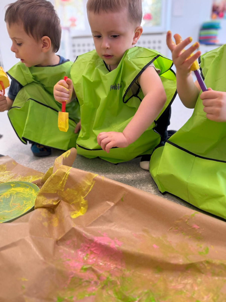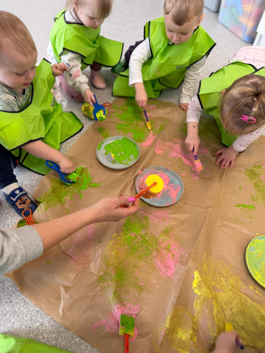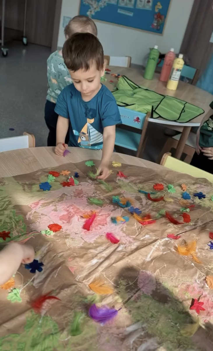 Dzień w grupie Elfy upłynął w wyjątkowo radosnej, wiosenno-świątecznej atmosferze. Nasze małe Elfy z ogromnym zaangażowaniem uczyły się piosenki o pisankach, przygotowując się do zbliżających się Świąt Wielkanocnych. Było też dużo ruchu i wspólnego muzykowania. Następnie dzieci wcieliły się w małych artystów i stworzyły własną „Panią Wiosnę”. Malowały ją wałeczkami oraz stemplowały gąbeczkami, rozwijając przy tym swoją kreatywność i sprawność manualną. Gdy farba wyschła, przyszedł czas na dekorowanie – pojawiły się kolorowe kwiatuszki i mięciutkie piórka, które dodały pracy wyjątkowego uroku. To był dzień pełen twórczej ekspresji, radości i pierwszych wielkanocnych inspiracji.