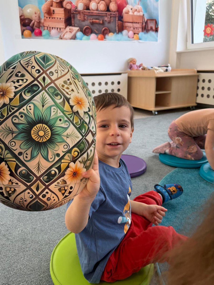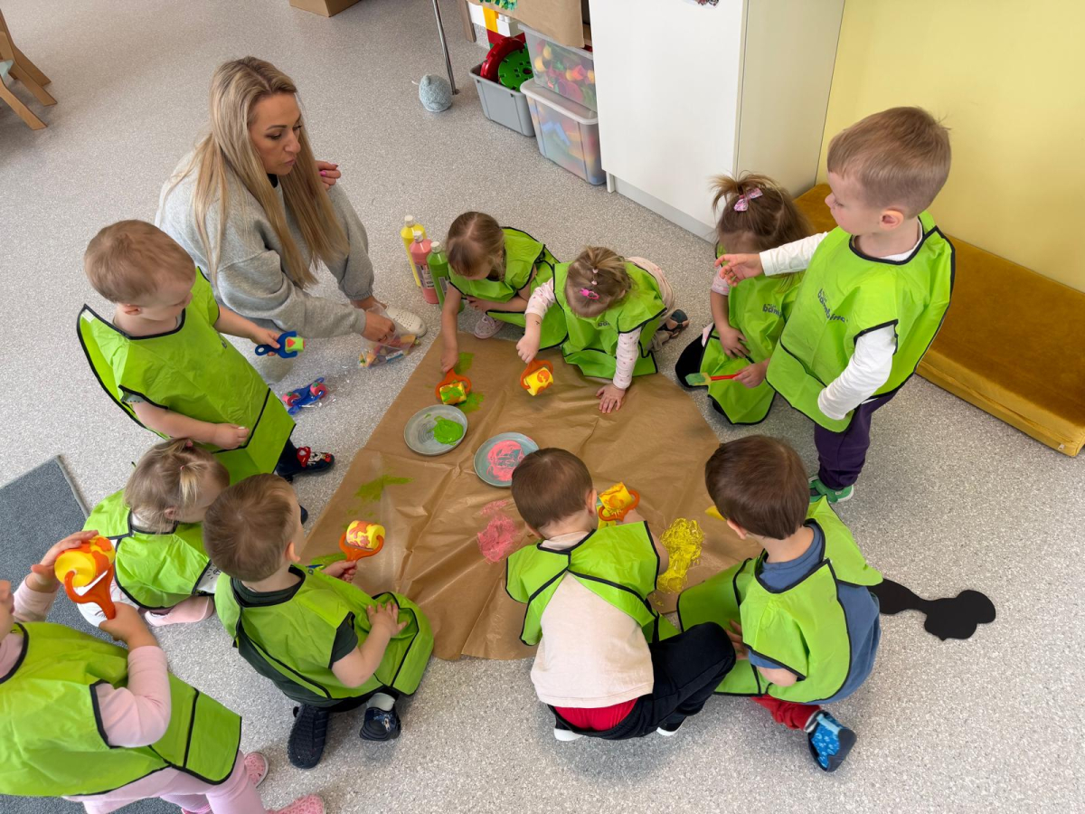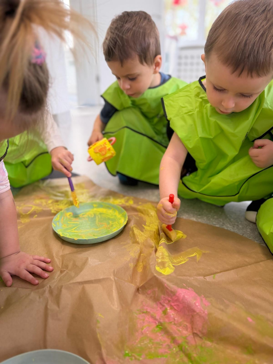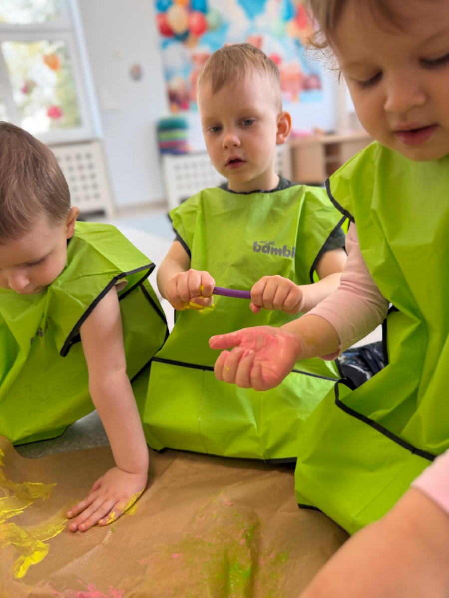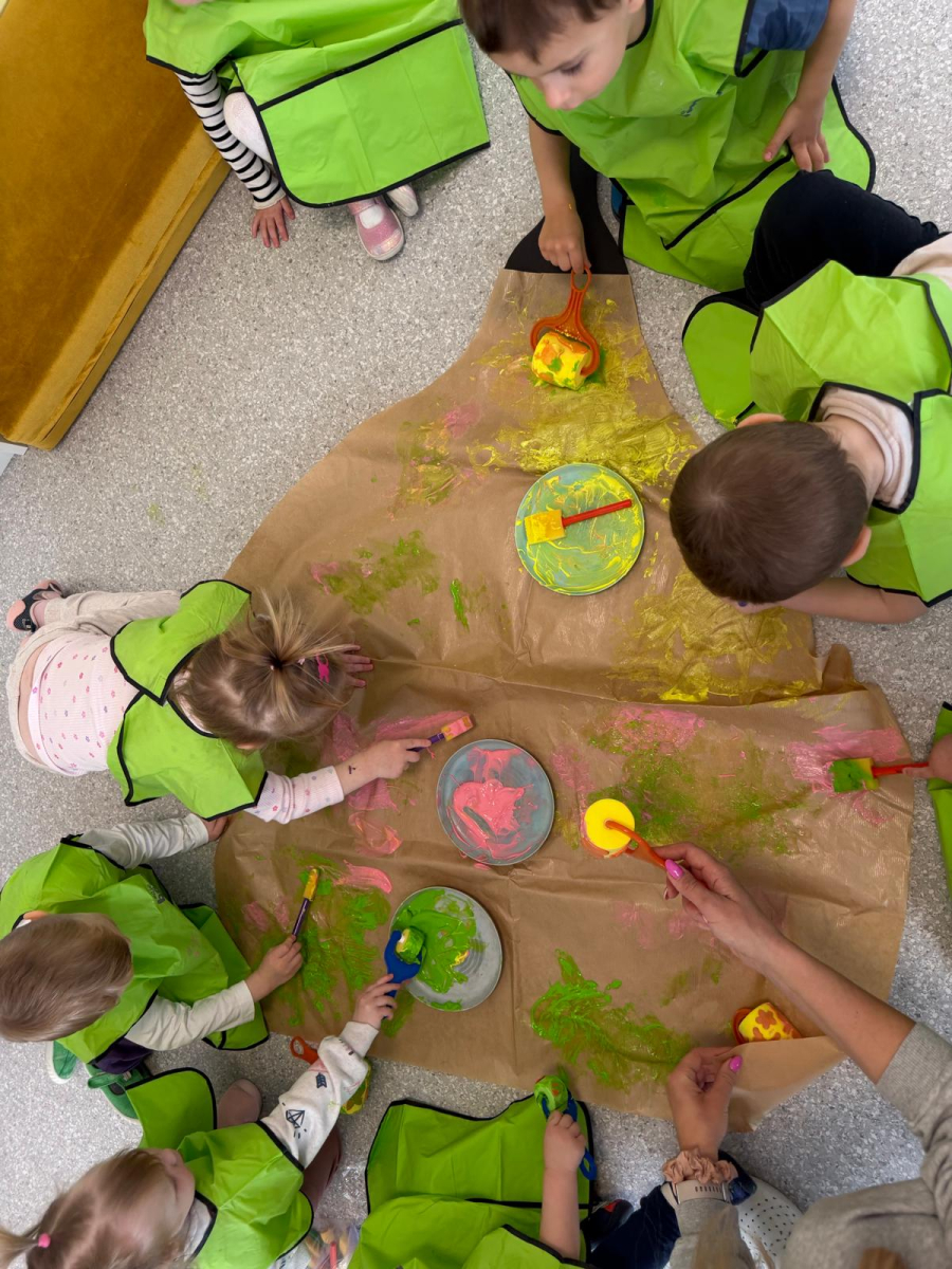 Dzień w grupie Elfy upłynął w wyjątkowo radosnej, wiosenno-świątecznej atmosferze. Nasze małe Elfy z ogromnym zaangażowaniem uczyły się piosenki o pisankach, przygotowując się do zbliżających się Świąt Wielkanocnych. Było też dużo ruchu i wspólnego muzykowania. Następnie dzieci wcieliły się w małych artystów i stworzyły własną „Panią Wiosnę”. Malowały ją wałeczkami oraz stemplowały gąbeczkami, rozwijając przy tym swoją kreatywność i sprawność manualną. Gdy farba wyschła, przyszedł czas na dekorowanie – pojawiły się kolorowe kwiatuszki i mięciutkie piórka, które dodały pracy wyjątkowego uroku. To był dzień pełen twórczej ekspresji, radości i pierwszych wielkanocnych inspiracji.