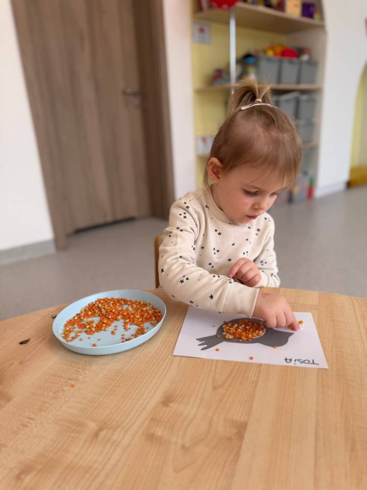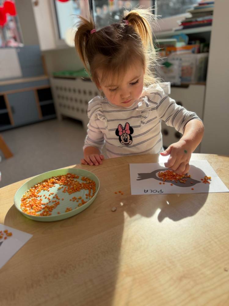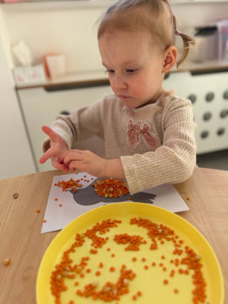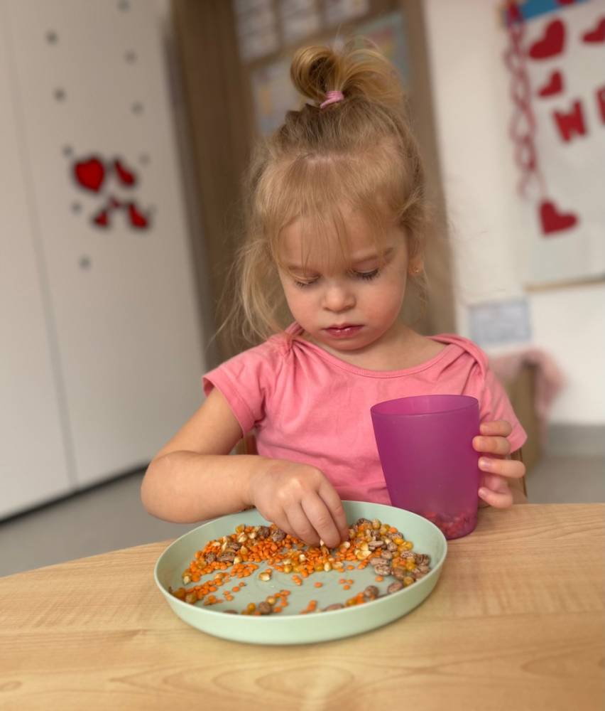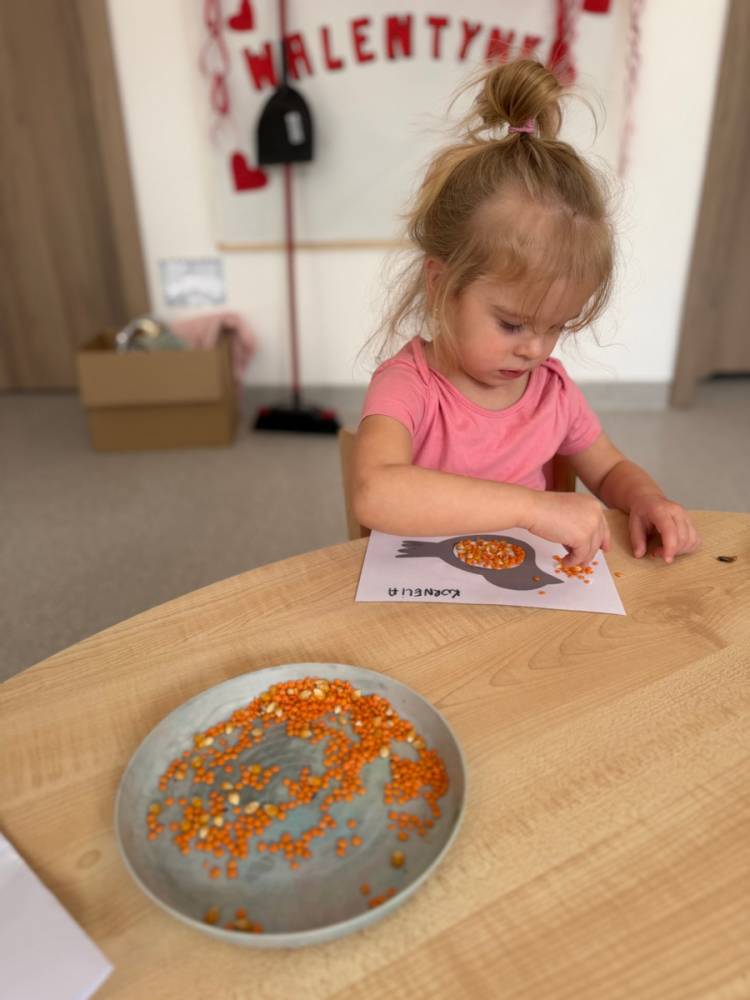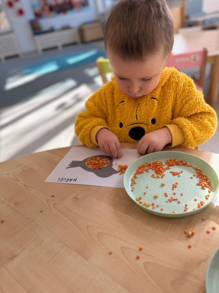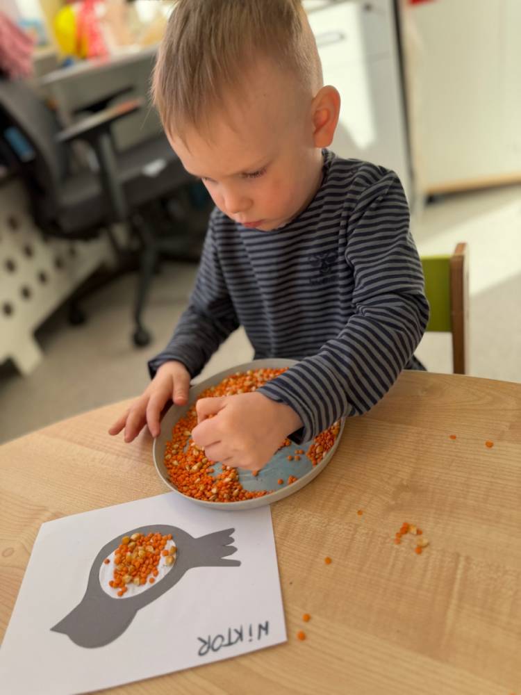 Dzisiejszy dzień w grupie Elfów upłynął pod znakiem skrzydlatych przyjaciół. Dzieci miały do wykonania dwa ważne zadania. Najpierw ćwiczyły motorykę małą oraz chwyt szczypcowy, segregując ziarenka, fasolki, soczewicę i kukurydzę. To było prawdziwe wyzwanie dla małych paluszków, ale Elfy poradziły sobie doskonale!