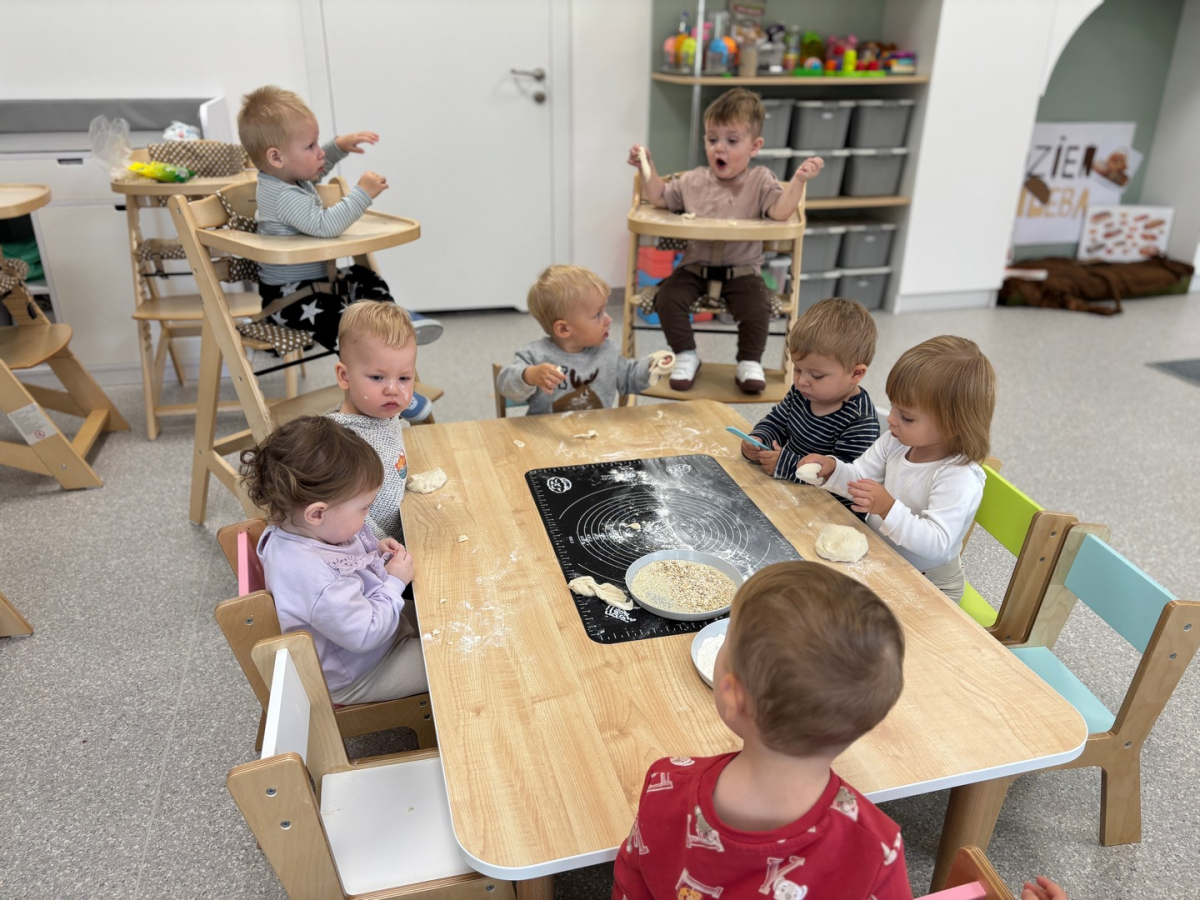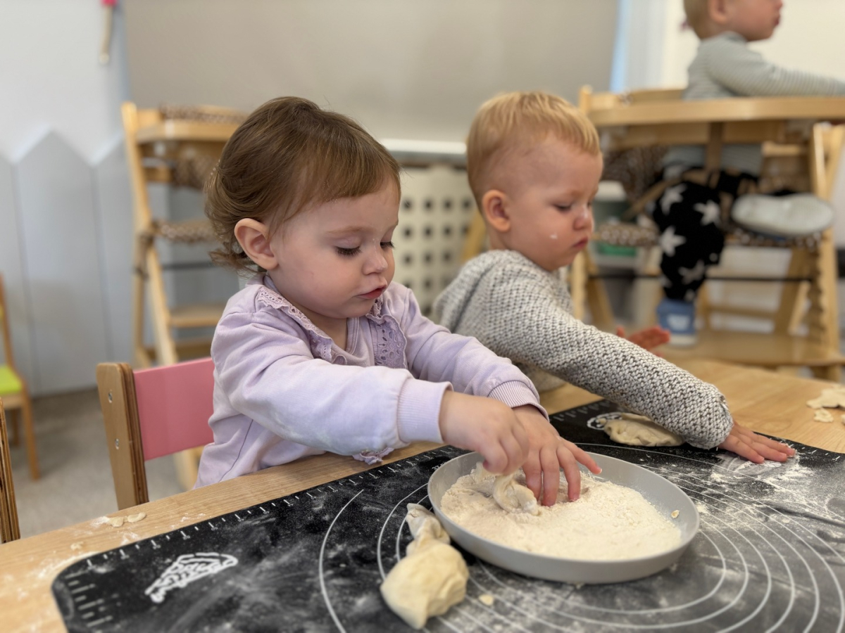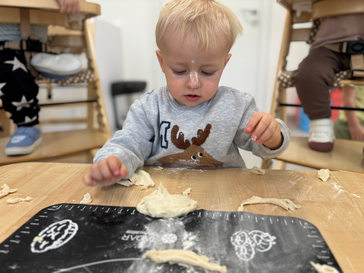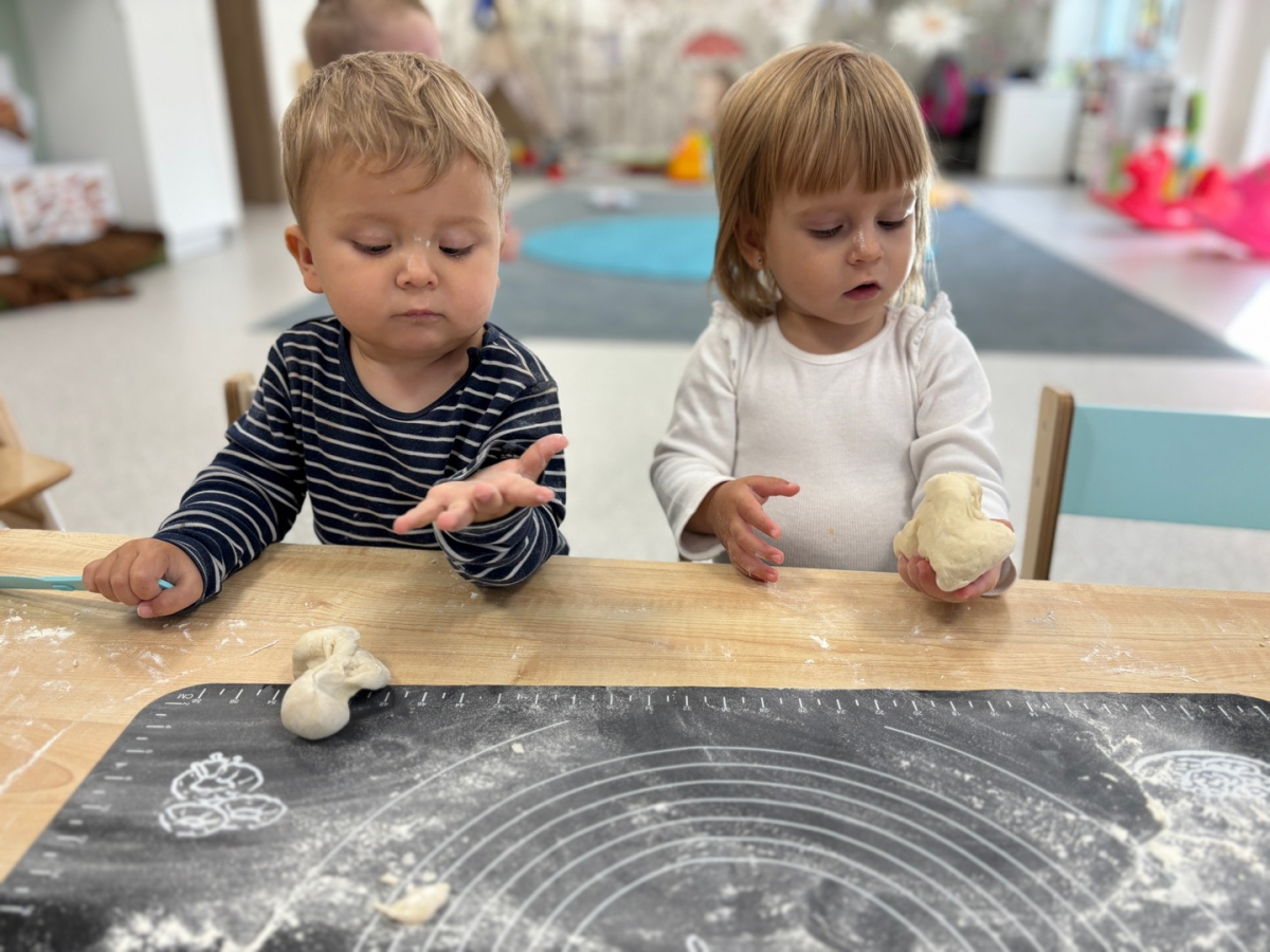 Dzieci samodzielnie ugniatały ciasto i formowały swoje małe chlebki. To wspaniała zabawa, która rozwija motorykę małą, kreatywność oraz uczy cierpliwości i radości z własnej pracy.