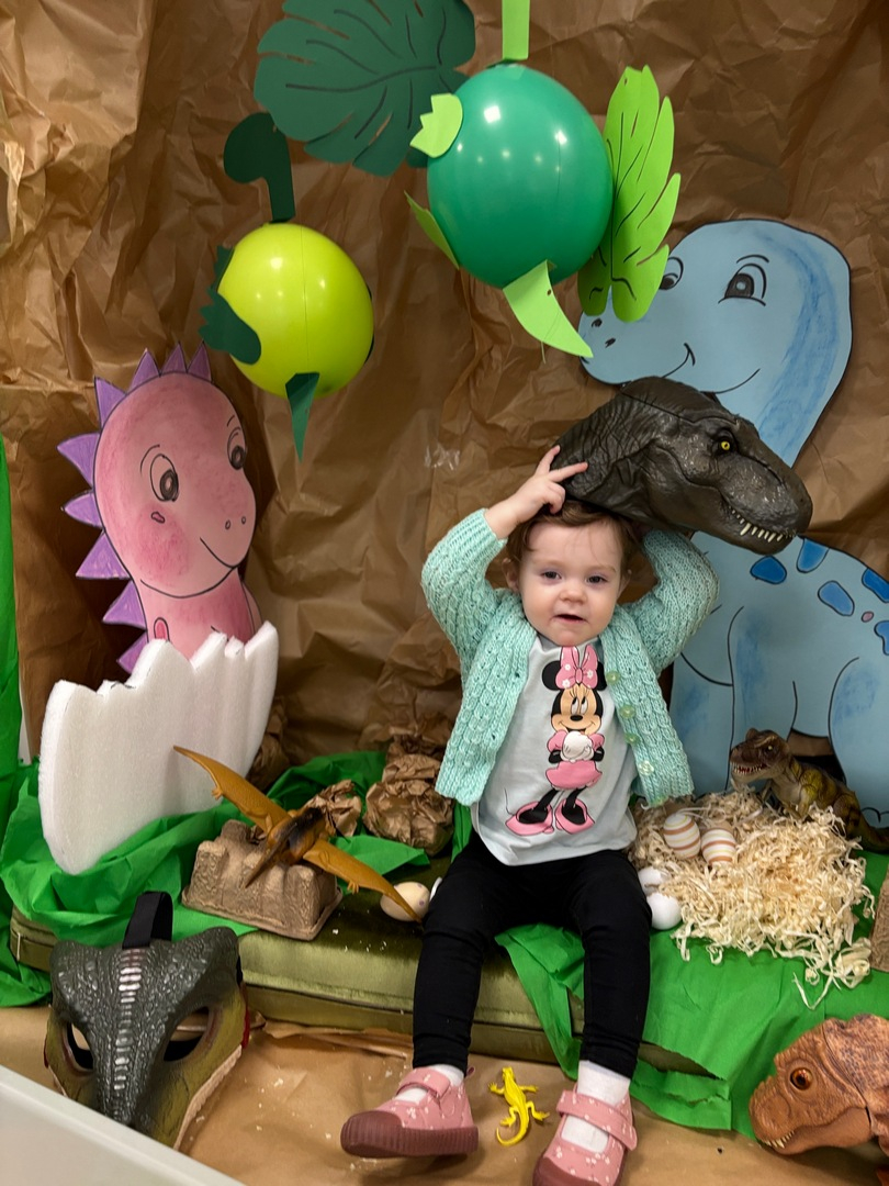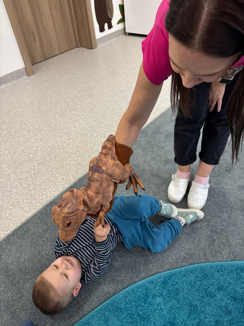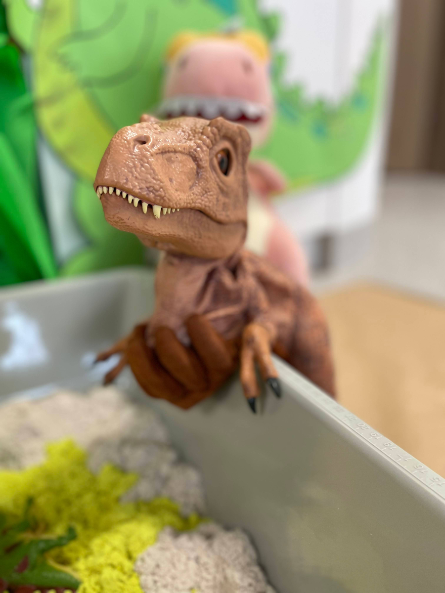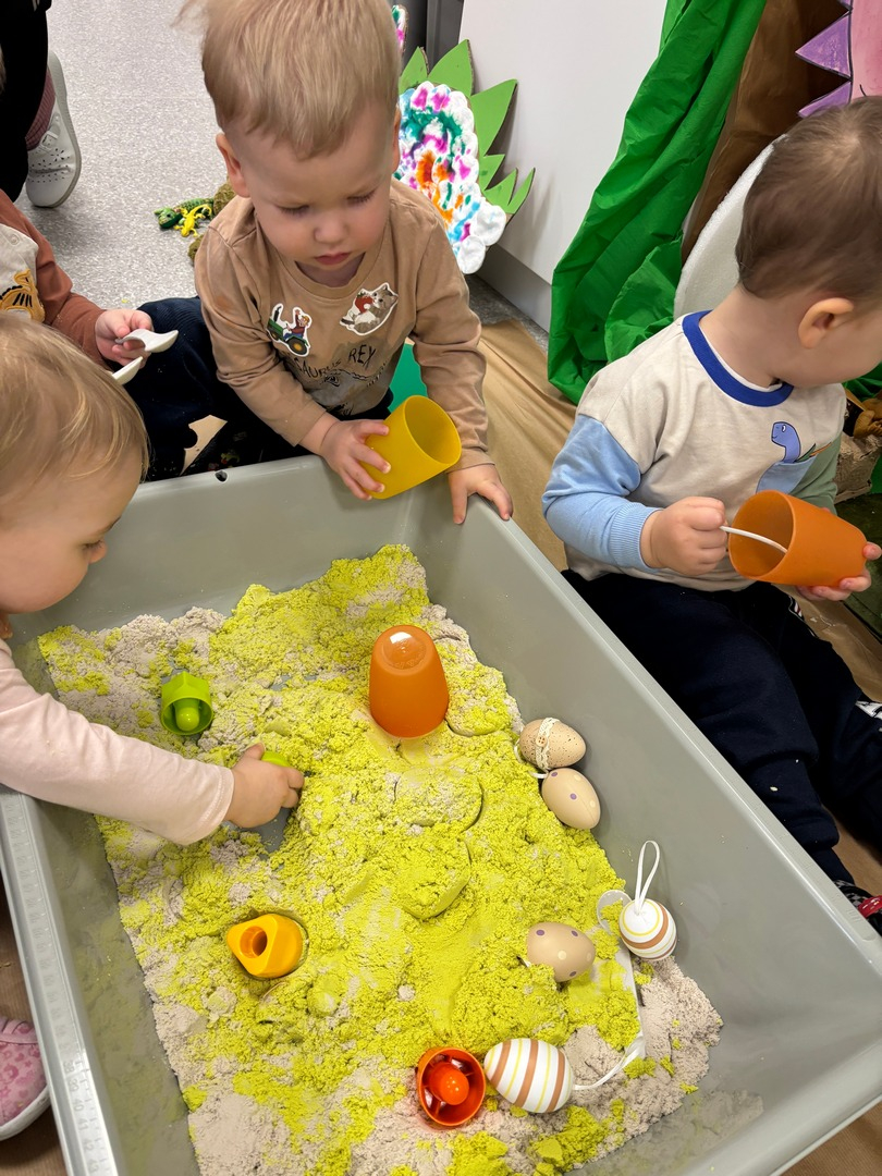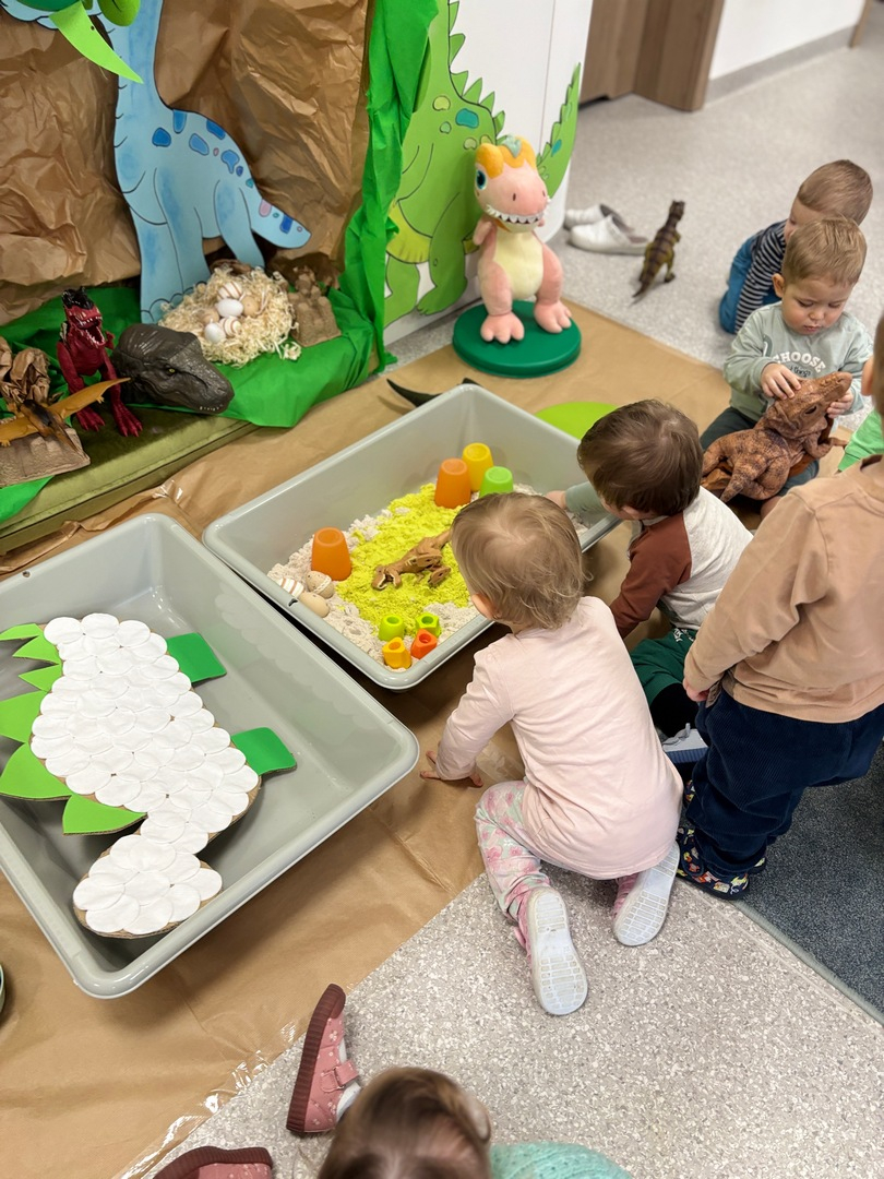 w sensorycznych zabawach, tworzyły kolorowe, dinozaurowe prace plastyczne oraz odkrywały „prehistoriczne” niespodzianki ukryte w piasku. Nie zabrakło także wyjątkowych gości, którzy sprawili maluchom mnóstwo radości
