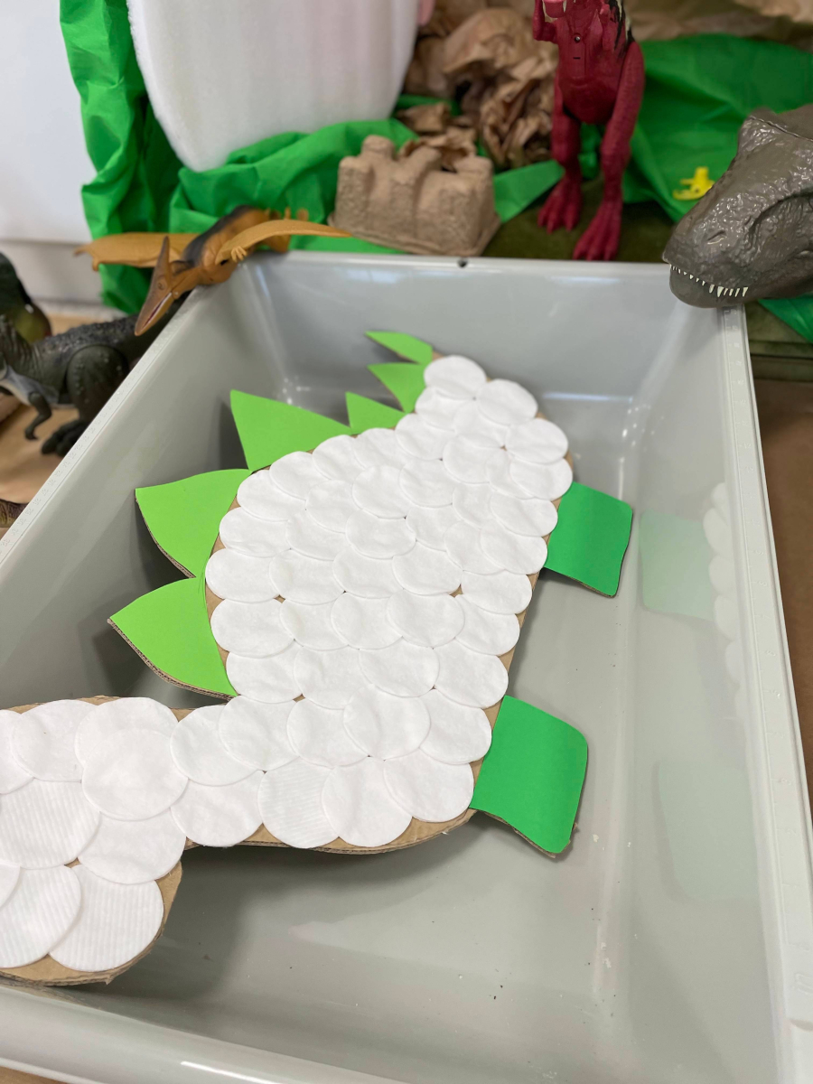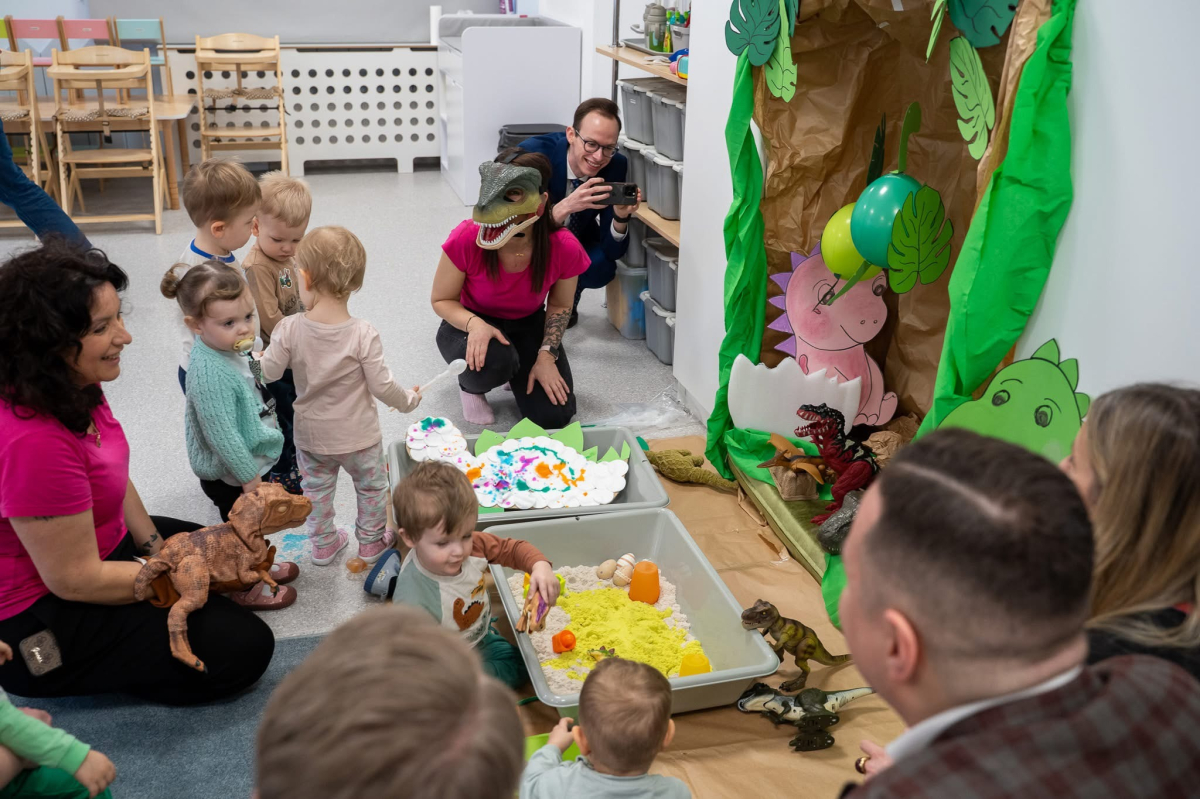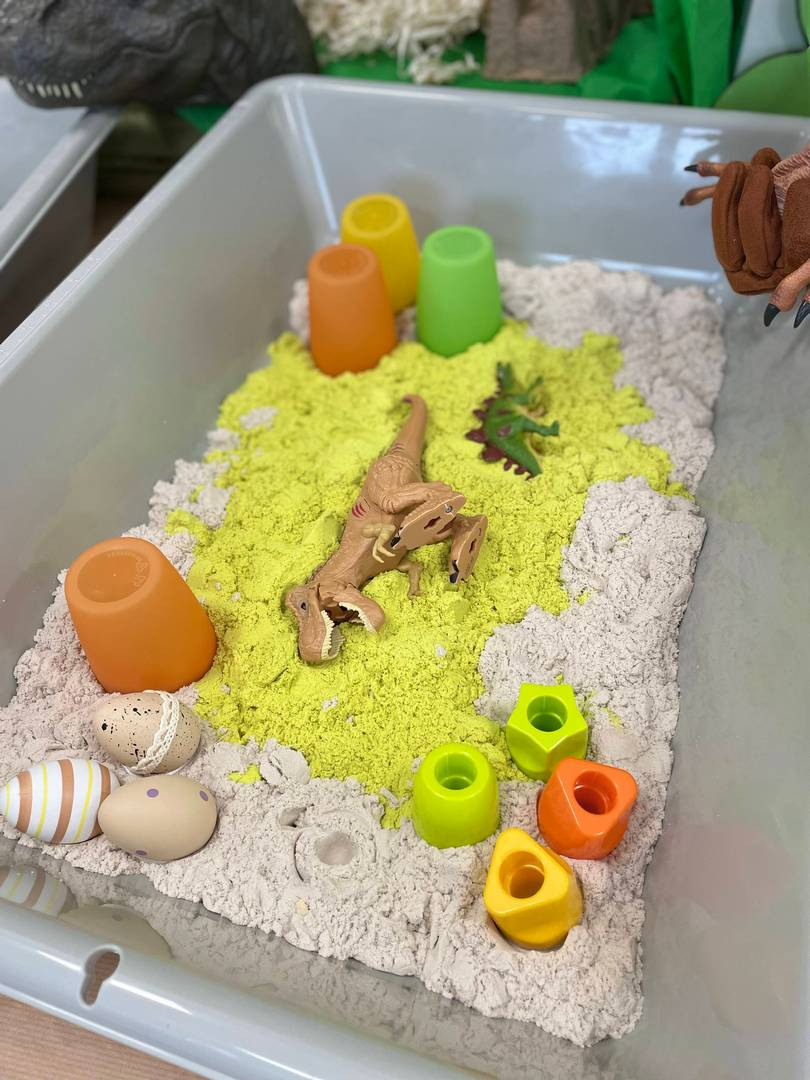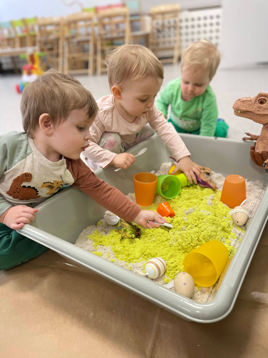 w sensorycznych zabawach, tworzyły kolorowe, dinozaurowe prace plastyczne oraz odkrywały „prehistoriczne” niespodzianki ukryte w piasku. Nie zabrakło także wyjątkowych gości, którzy sprawili maluchom mnóstwo radości