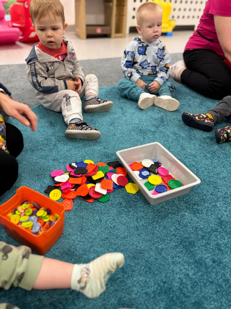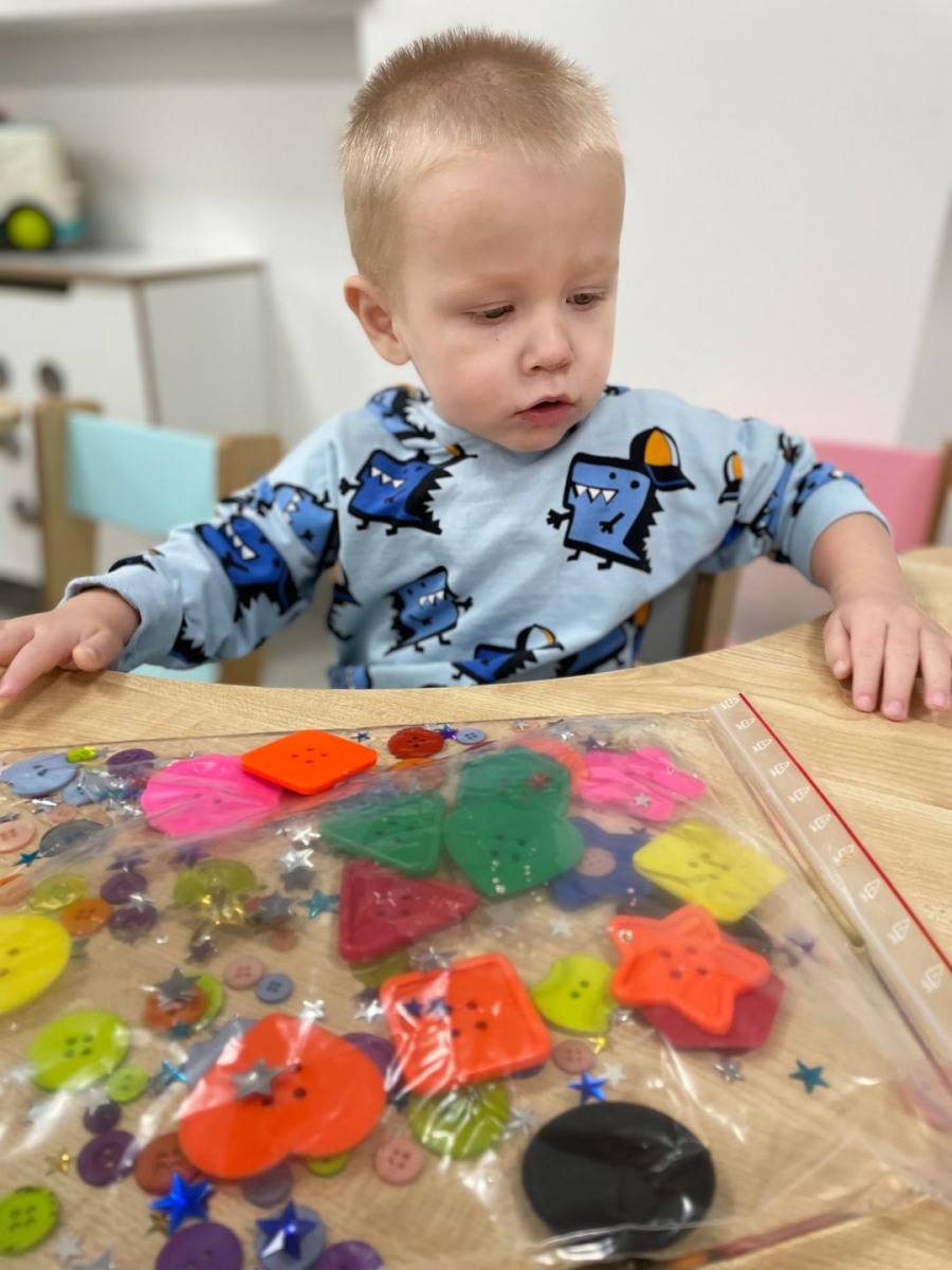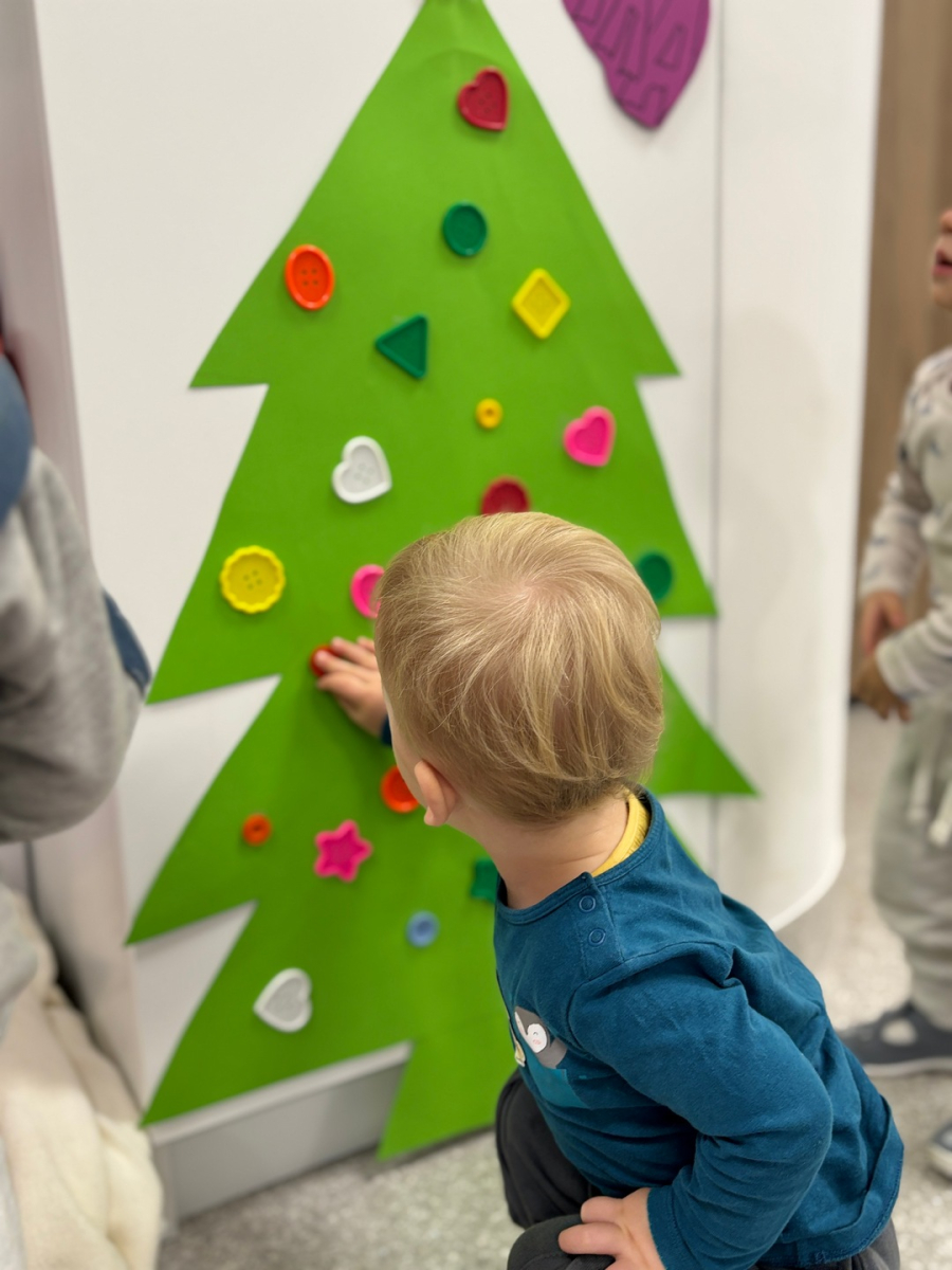 Podczas Dnia Guzika dzieci badały kolorowe guziki w woreczku sensorycznym z wodą, a następnie wspólnie ozdobiły choinkę guzikami, ćwicząc kreatywność i sprawność małych rączek.