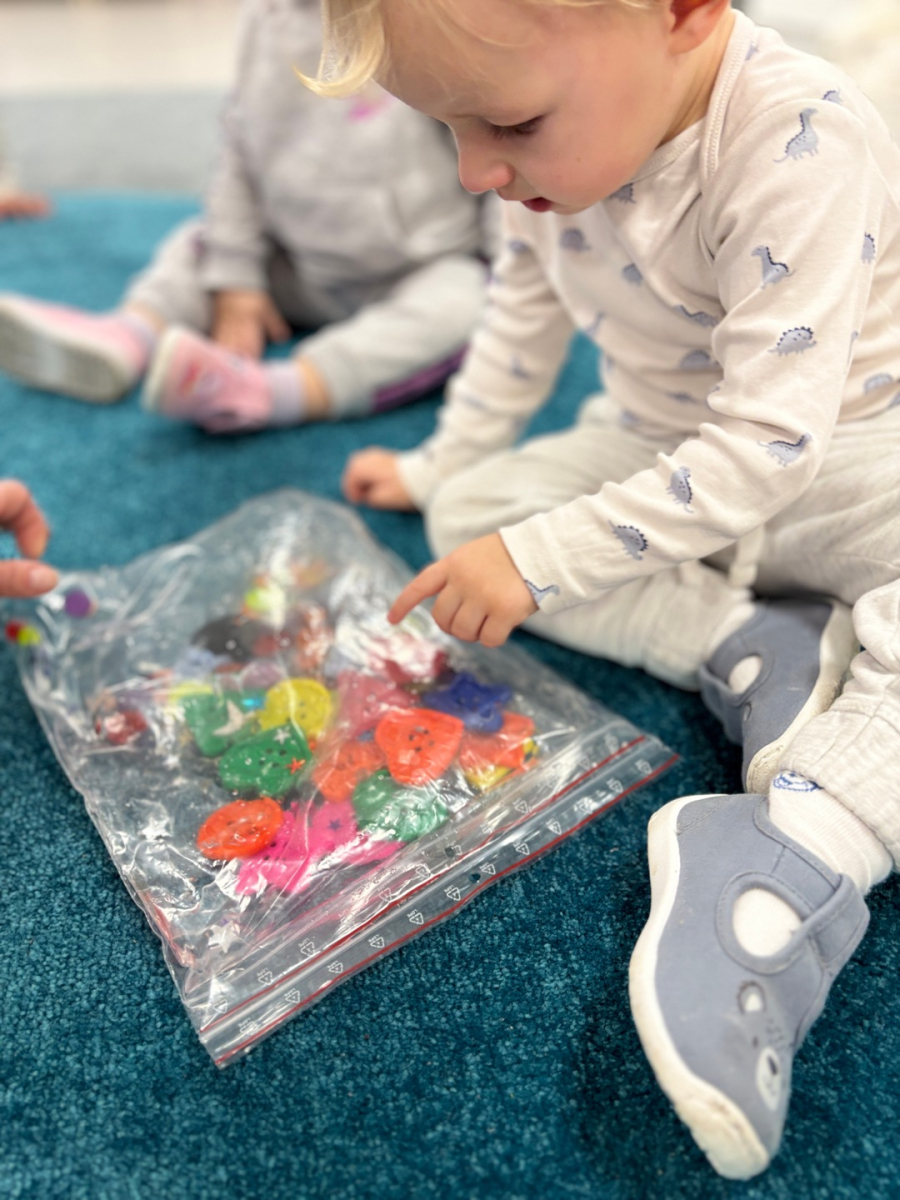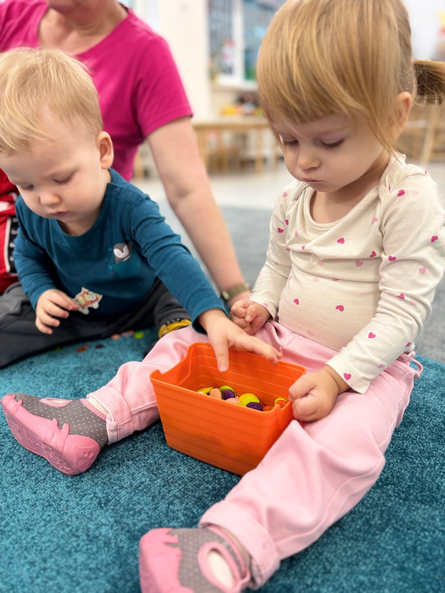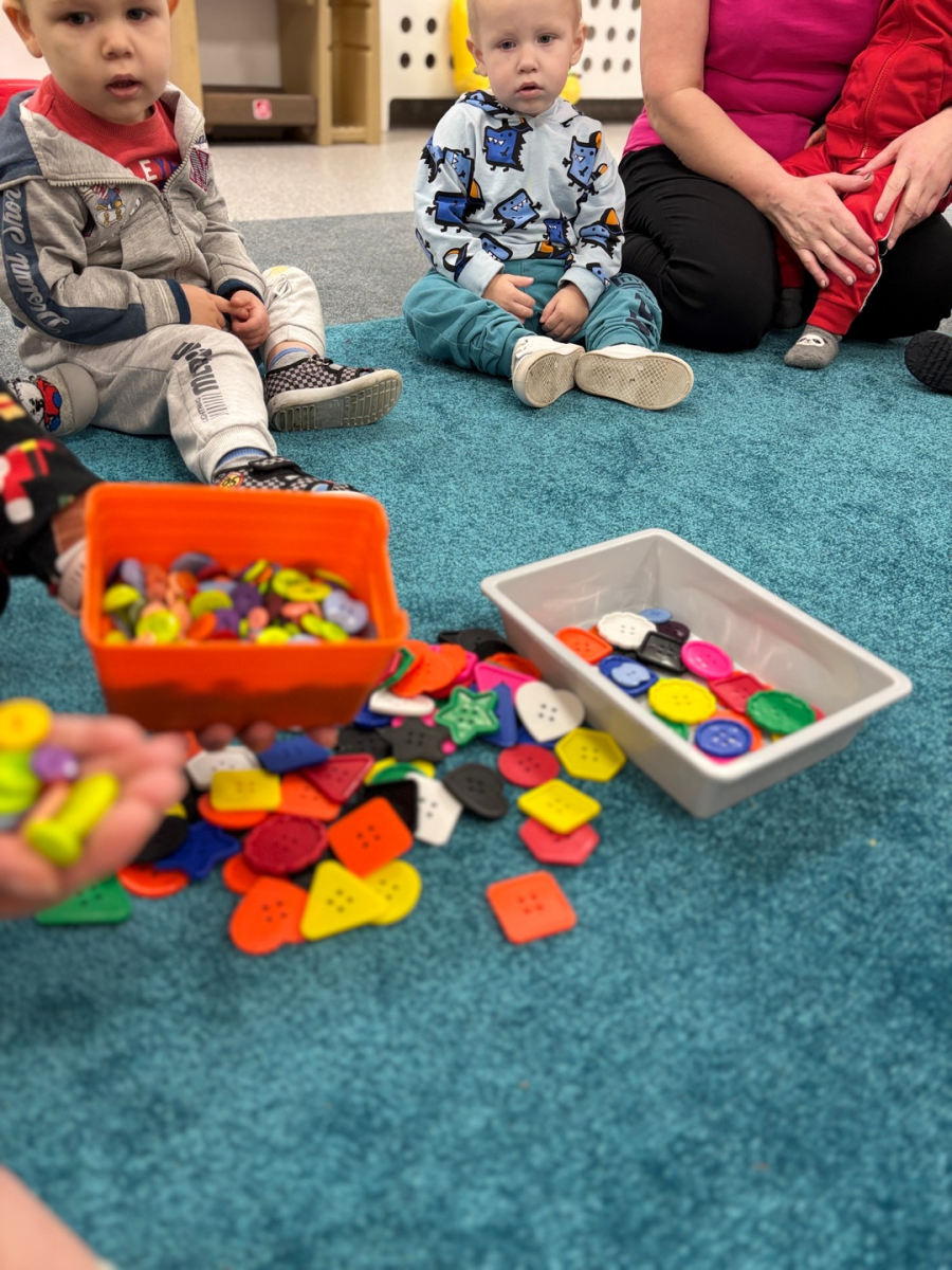 Podczas Dnia Guzika dzieci badały kolorowe guziki w woreczku sensorycznym z wodą, a następnie wspólnie ozdobiły choinkę guzikami, ćwicząc kreatywność i sprawność małych rączek.