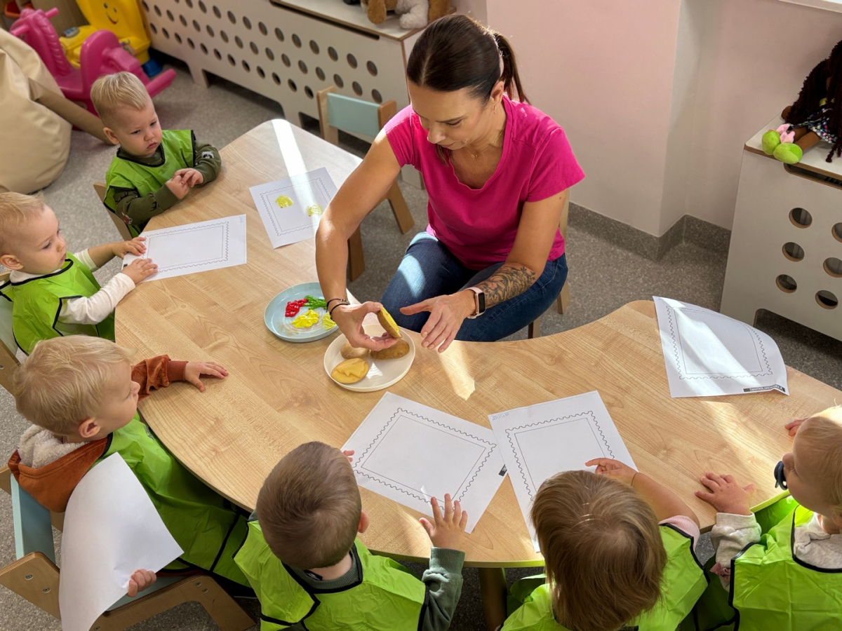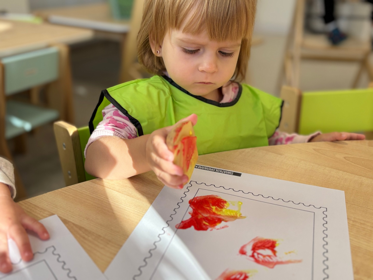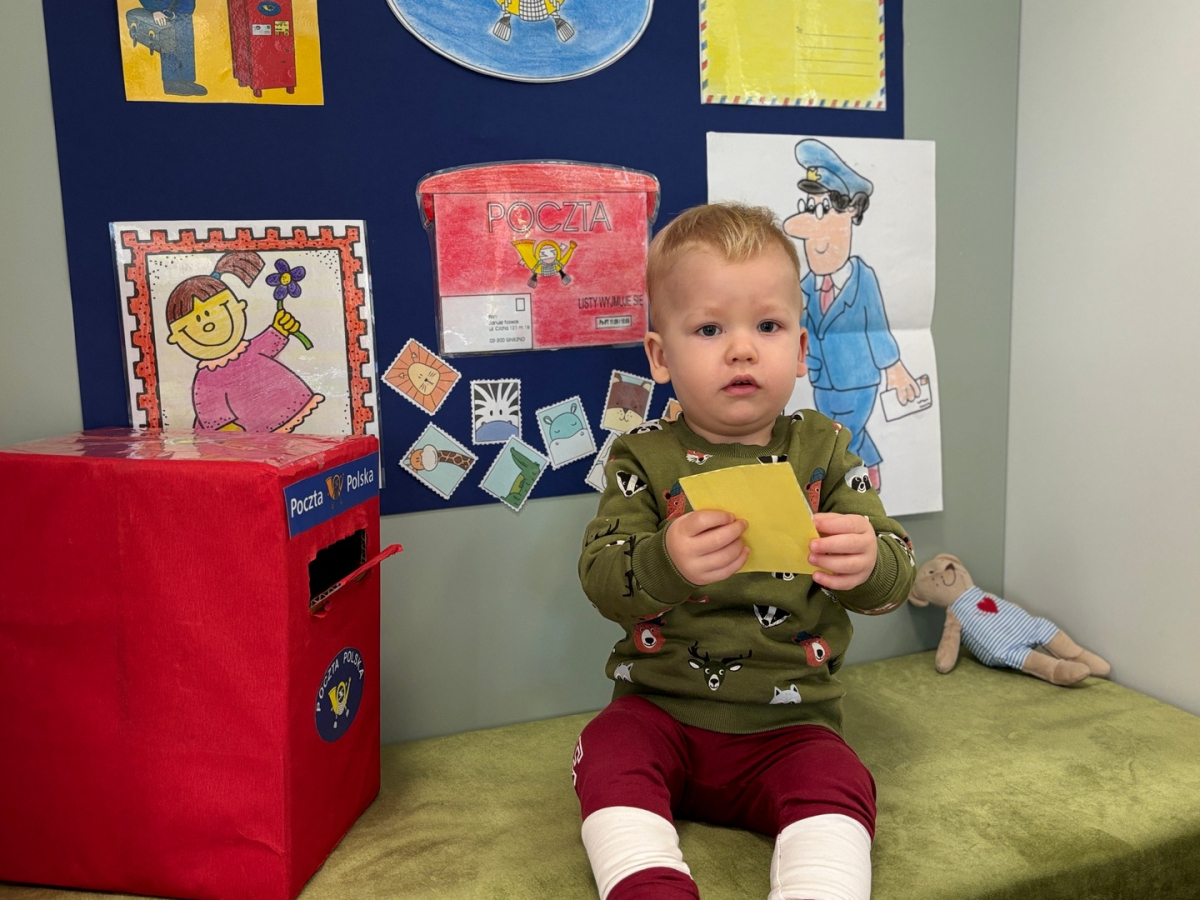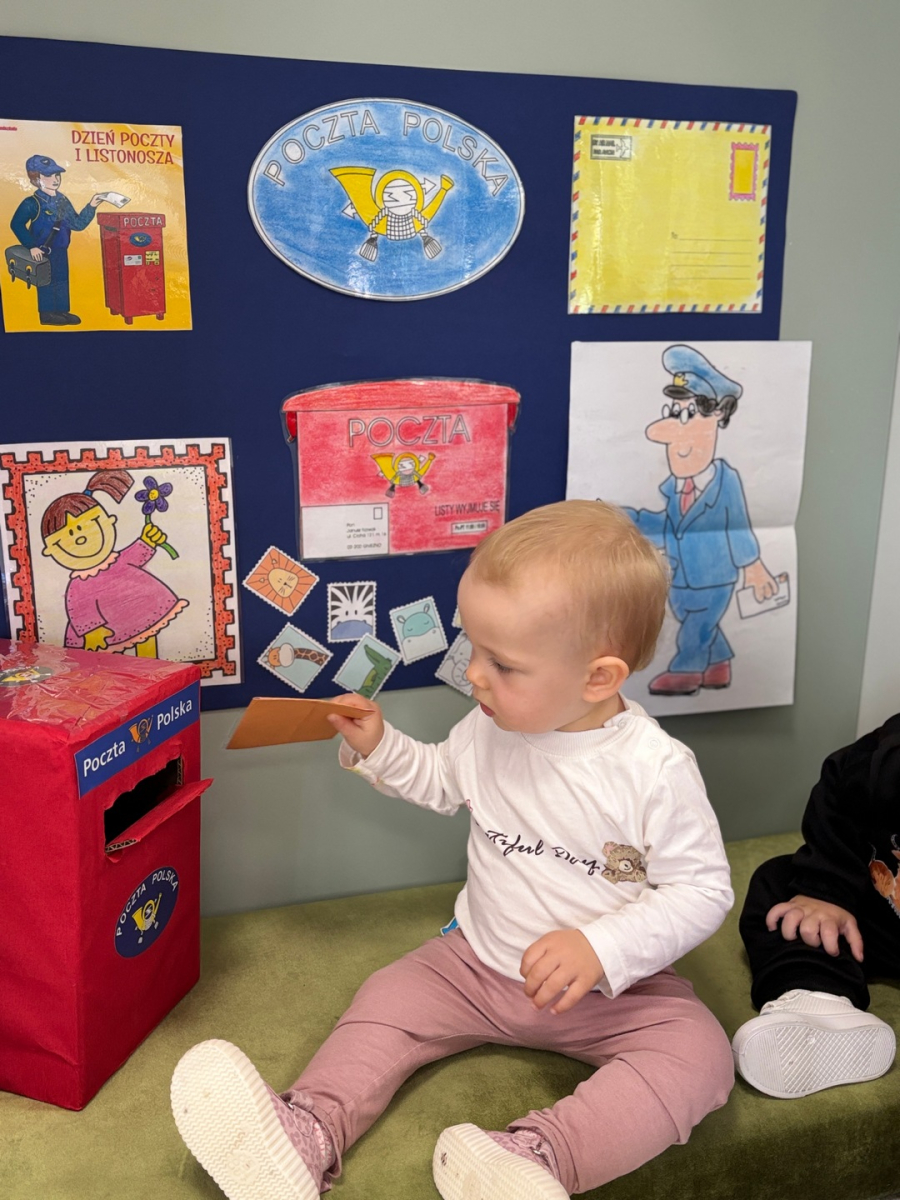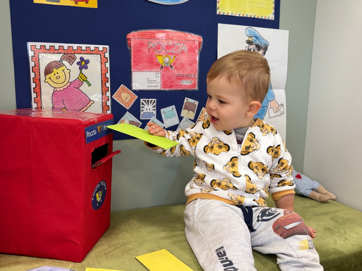Podczas zabawy maluszki tworzyły własne znaczki i listy, a następnie wrzucały je do skrzynki pocztowej. Takie zajęcia rozwijają ciekawość świata, zdolności manualne oraz uczą komunikacji i współpracy.