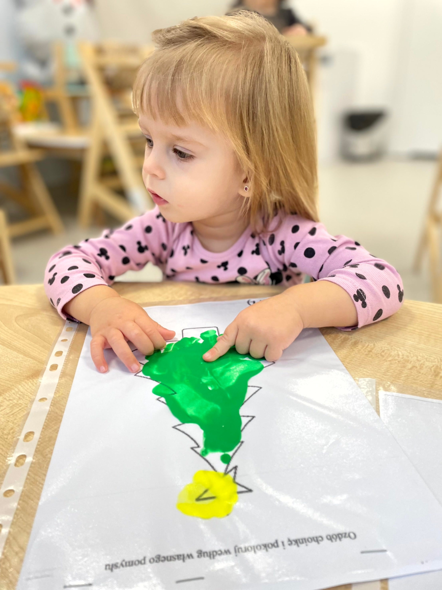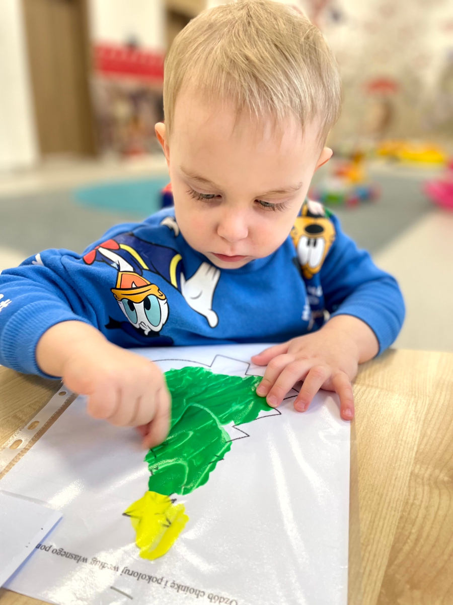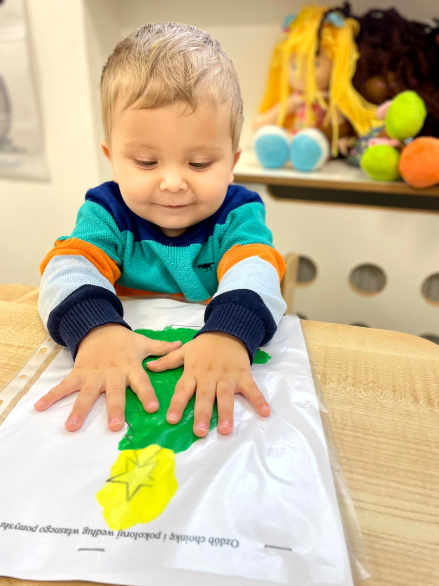 Dziś nasze maluchy wykonały wyjątkowe choinki – zamknięte w koszulkach z farbką w środku. Zadaniem dzieci było rozcieranie farby paluszkami, co sprawiło im mnóstwo radości, a przy okazji doskonale rozwijało motorykę małą, koordynację ręka–oko oraz zmysł dotyku. Kreatywna zabawa, świąteczna atmosfera i małe rączki w wielkim skupieniu – tak pracują Misie.