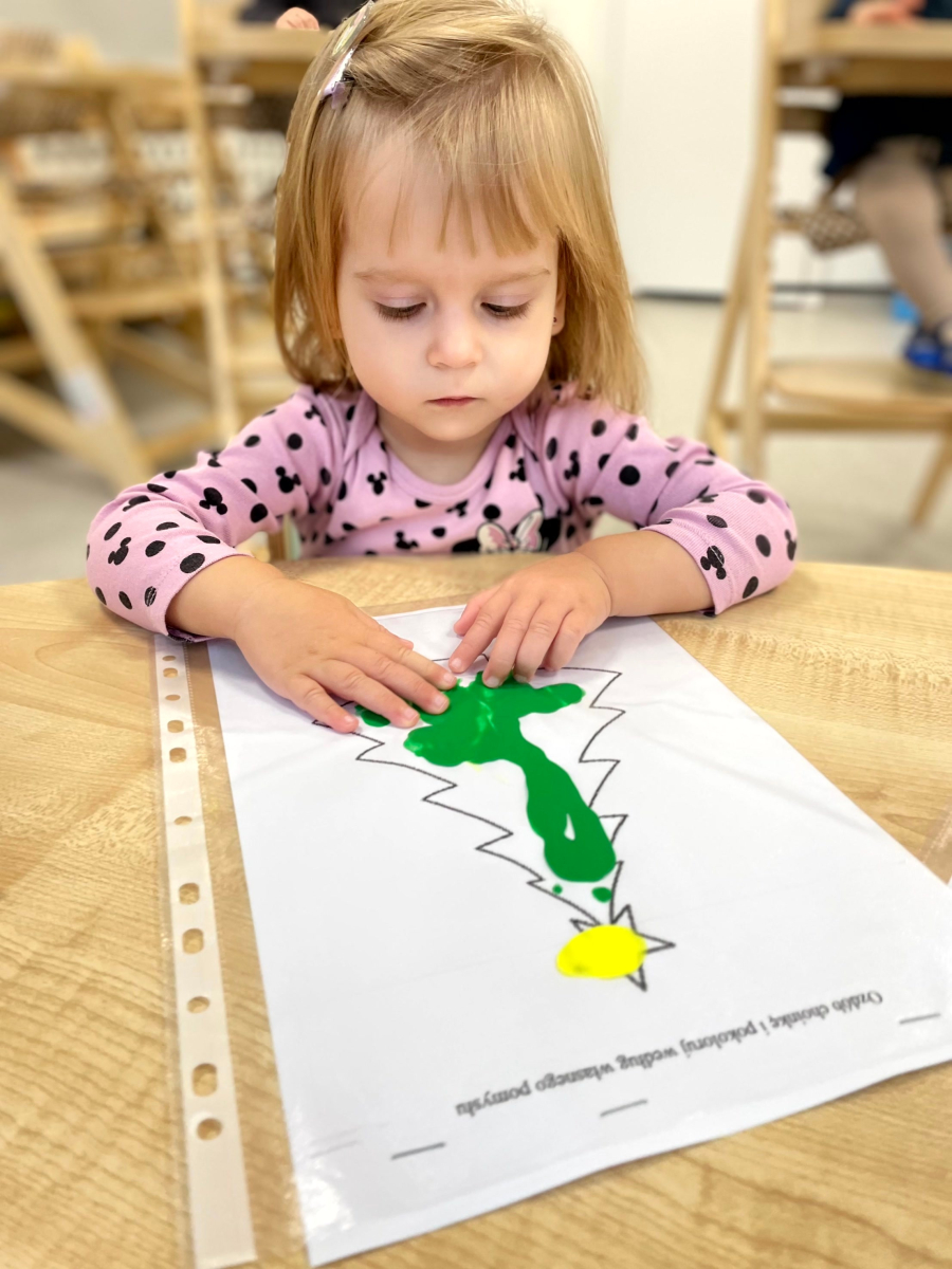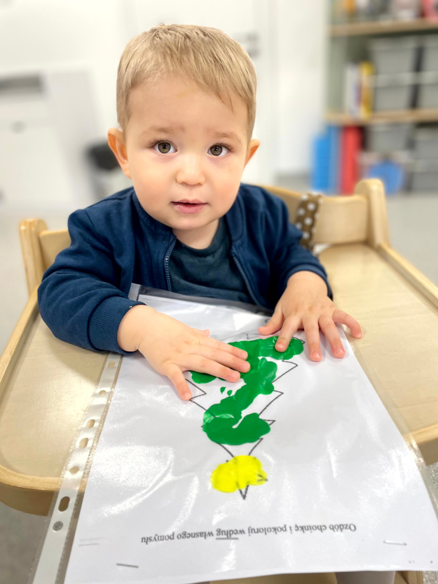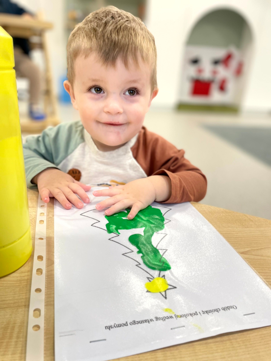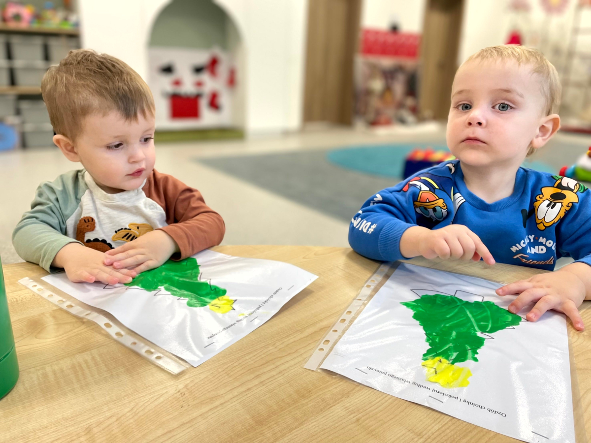 Dziś nasze maluchy wykonały wyjątkowe choinki – zamknięte w koszulkach z farbką w środku. Zadaniem dzieci było rozcieranie farby paluszkami, co sprawiło im mnóstwo radości, a przy okazji doskonale rozwijało motorykę małą, koordynację ręka–oko oraz zmysł dotyku. Kreatywna zabawa, świąteczna atmosfera i małe rączki w wielkim skupieniu – tak pracują Misie.