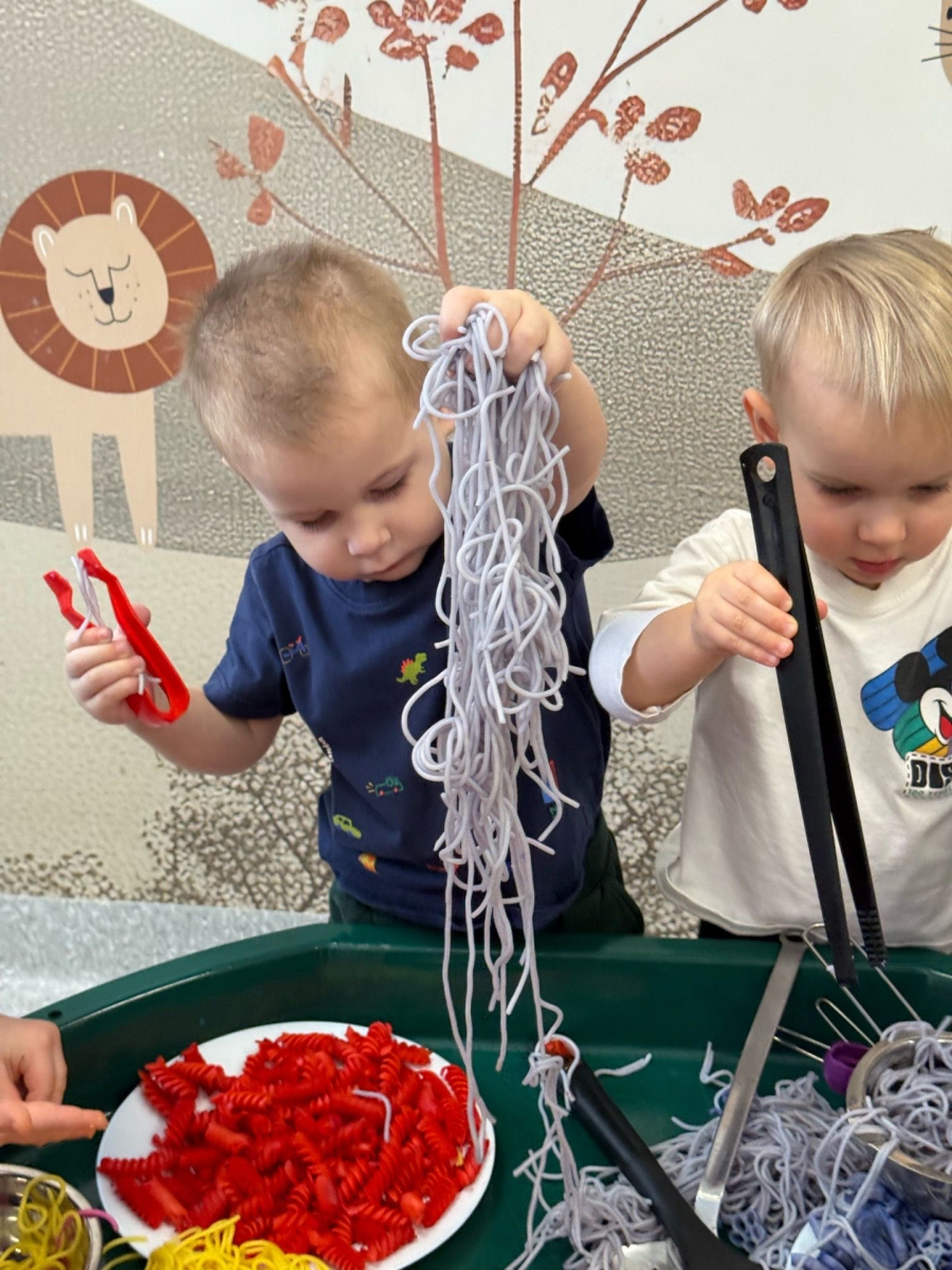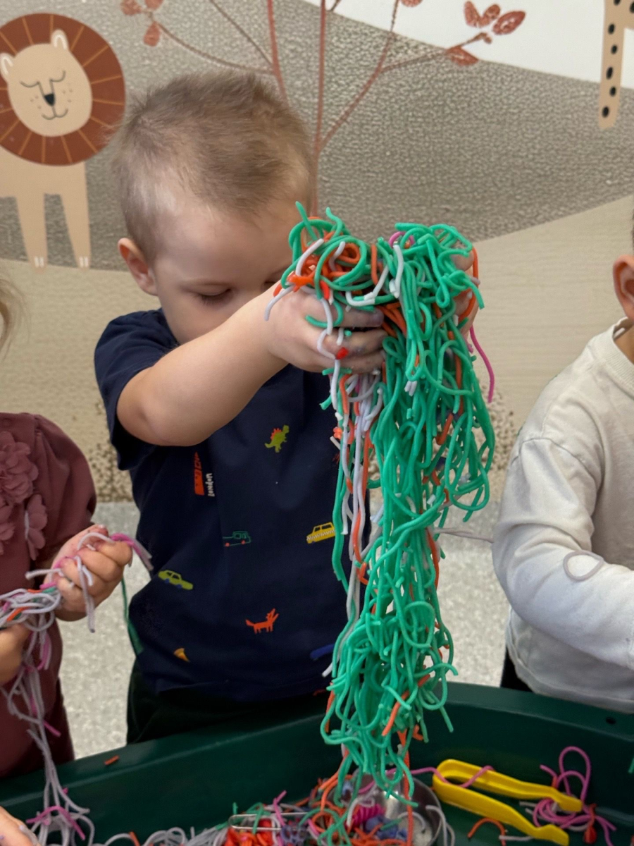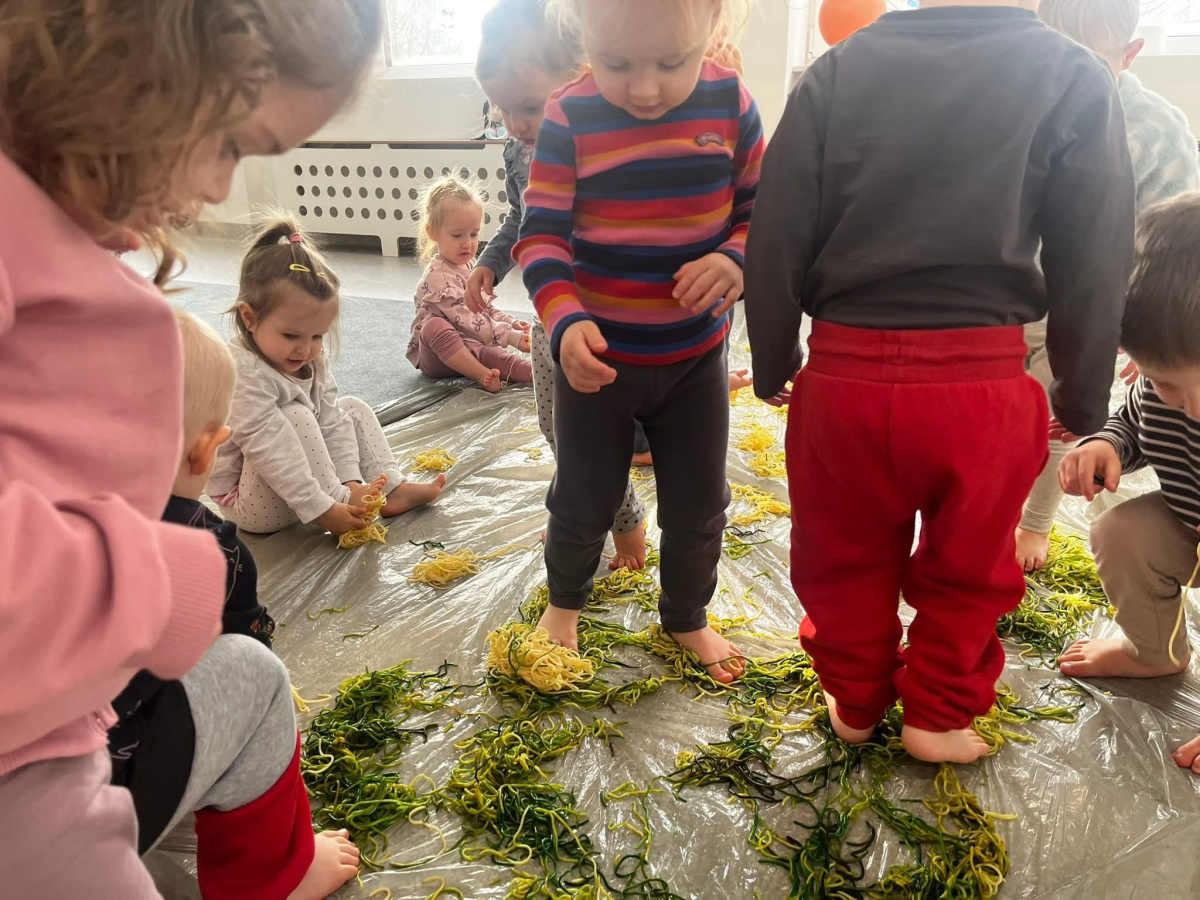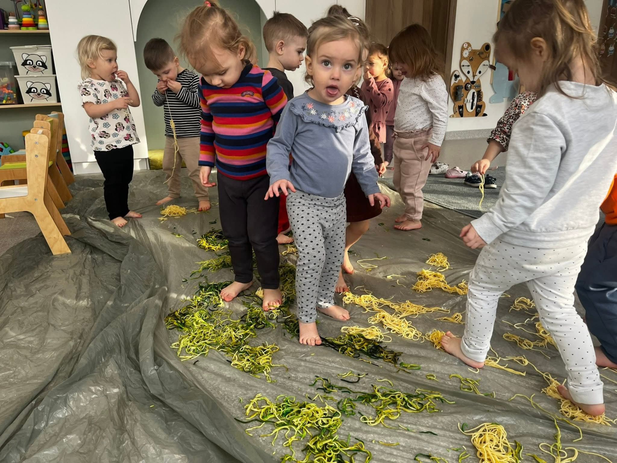 W naszym Żłobku królował makaron! Dzieci przeżyły wspaniałe chwile pełne radości i sensorycznych odkryć. Poznawały różne faktury i kolory makaronu, przesypywały go, chwytały szczypcami oraz korzystały z łyżek i sitek, rozwijając przy tym sprawność małych rączek i koordynację.