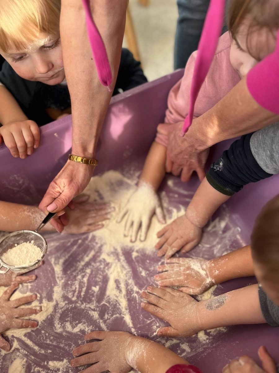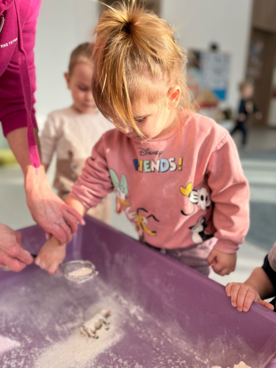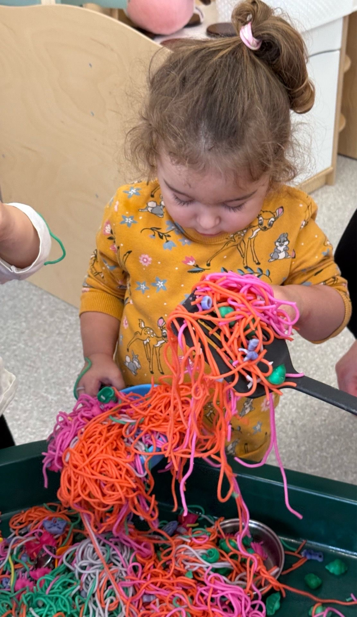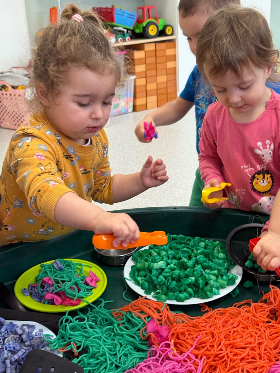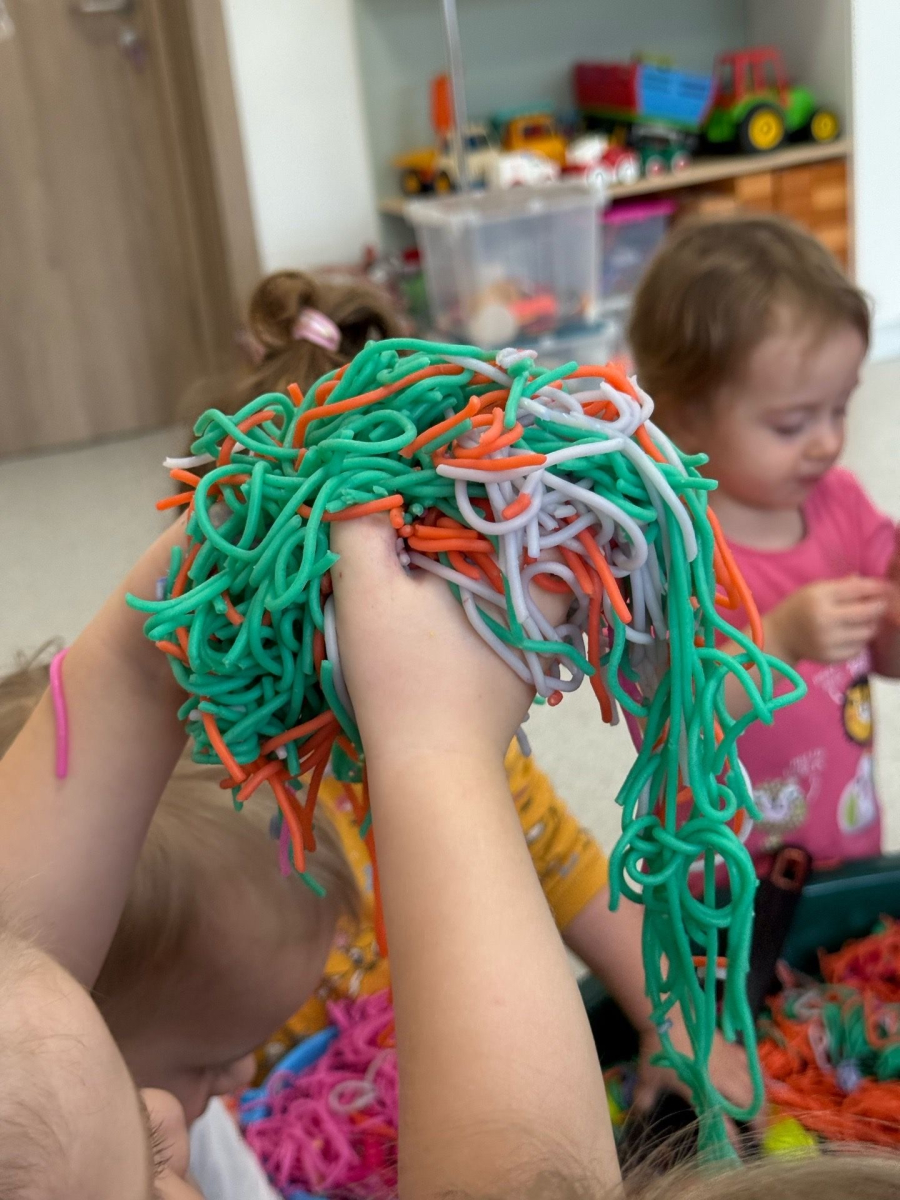 W naszym Żłobku królował makaron! Dzieci przeżyły wspaniałe chwile pełne radości i sensorycznych odkryć. Poznawały różne faktury i kolory makaronu, przesypywały go, chwytały szczypcami oraz korzystały z łyżek i sitek, rozwijając przy tym sprawność małych rączek i koordynację.