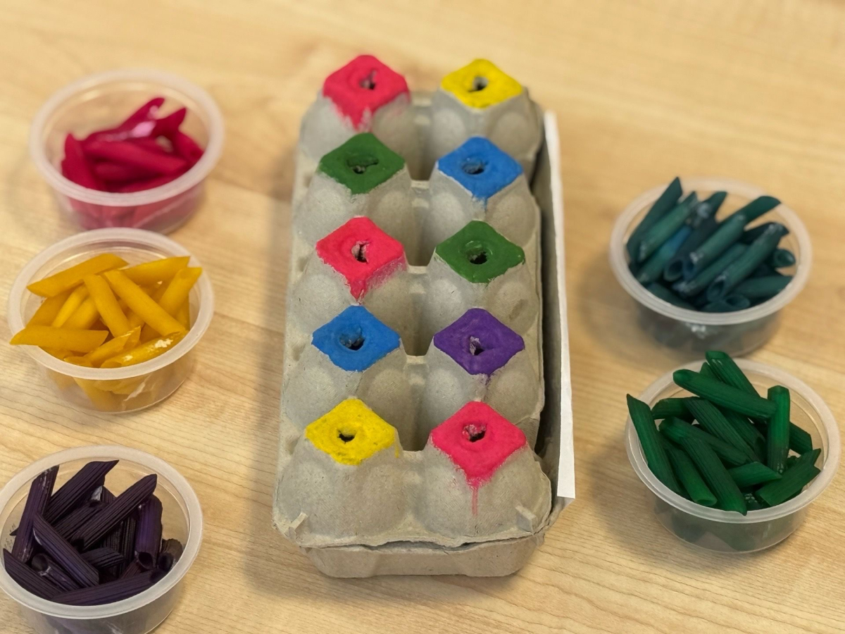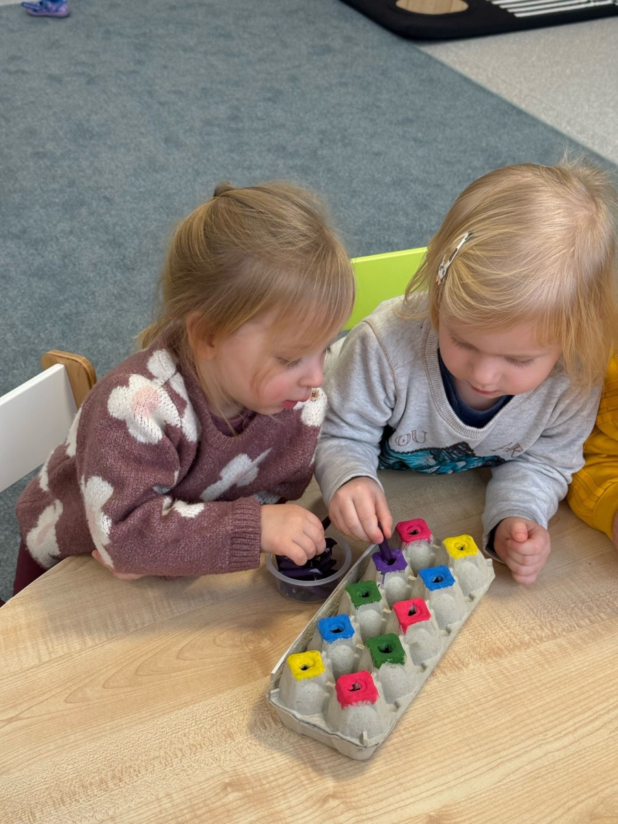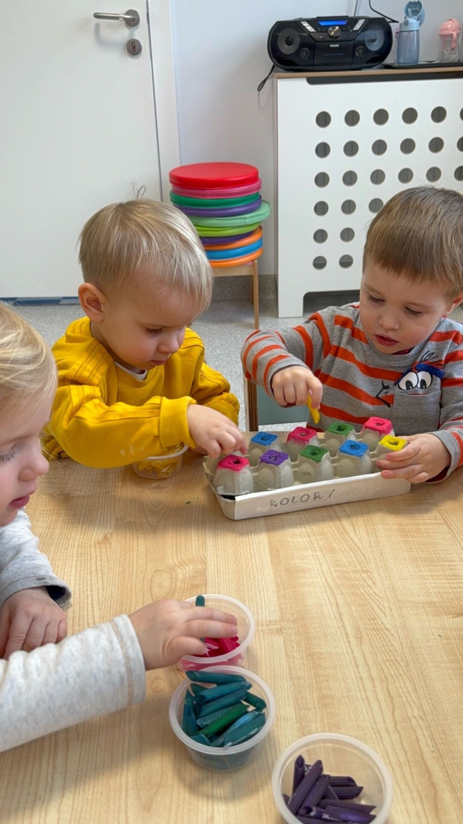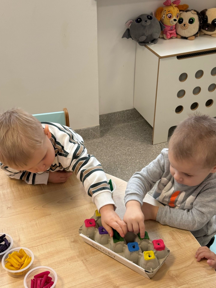 Po zabawach sensorycznych przyszedł czas na segregowanie suchego, kolorowego makaronu – dzieci z zaangażowaniem wkładały odpowiednie kolory do właściwych otworów w pudełkach. Takie aktywności uczą sprawczości, koncentracji oraz dają bogactwo doznań sensorycznych, stymulując zmysły w naturalny i radosny sposób.