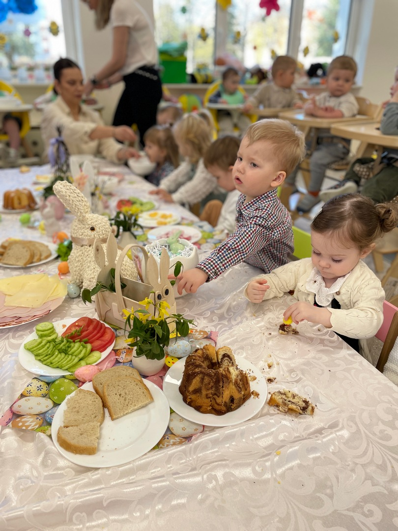 Nasze maluszki już świętują! Nasze najmłodsze grupy – Pszczółki i Misie – zasiadły razem do wspólnego, wielkanocnego śniadania. Było pysznie, kolorowo i bardzo uroczyście! Na stołach zagościły tradycyjne przysmaki, a radosny gwar i uśmiechy naszych maluchów wypełniły całą salę. To był czas dzielenia się radością i wspólnego celebrowania nadchodzącej wiosny.