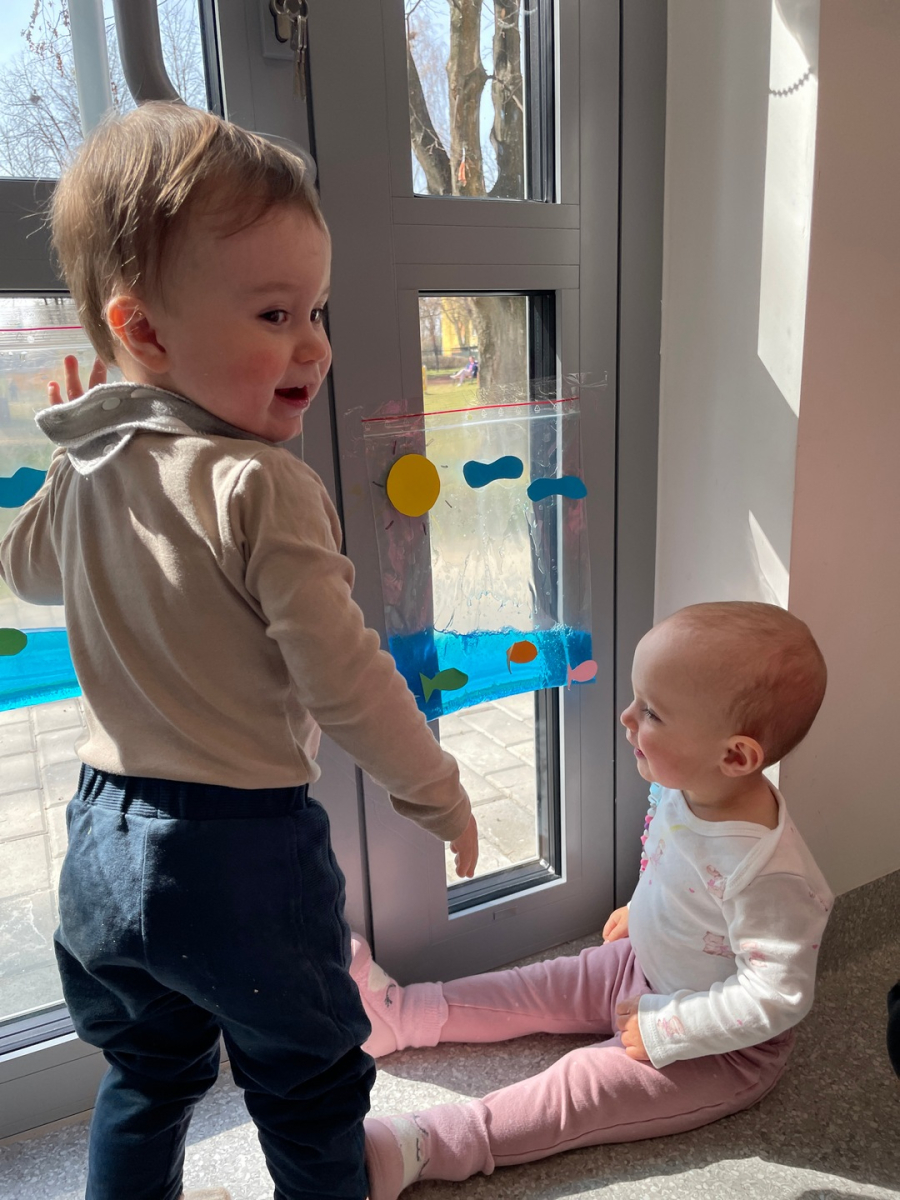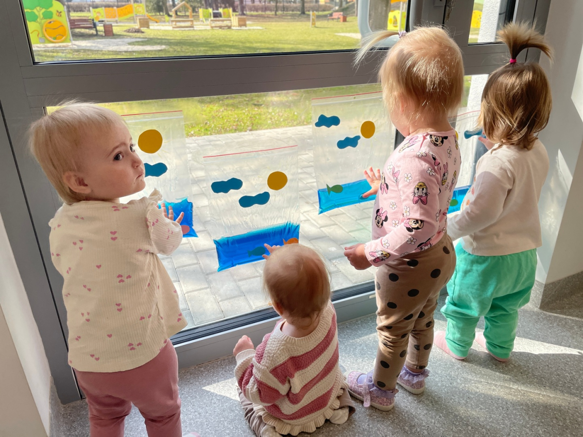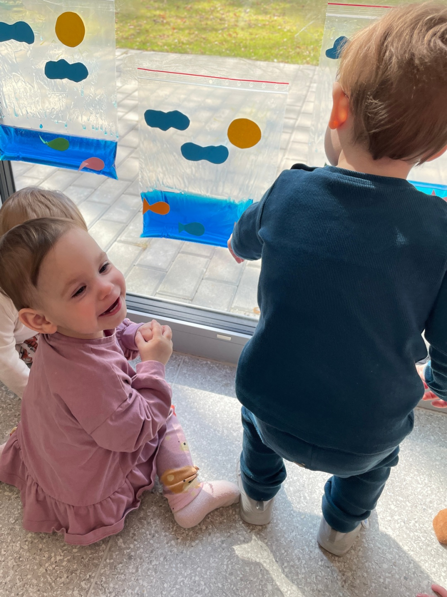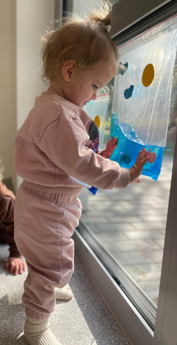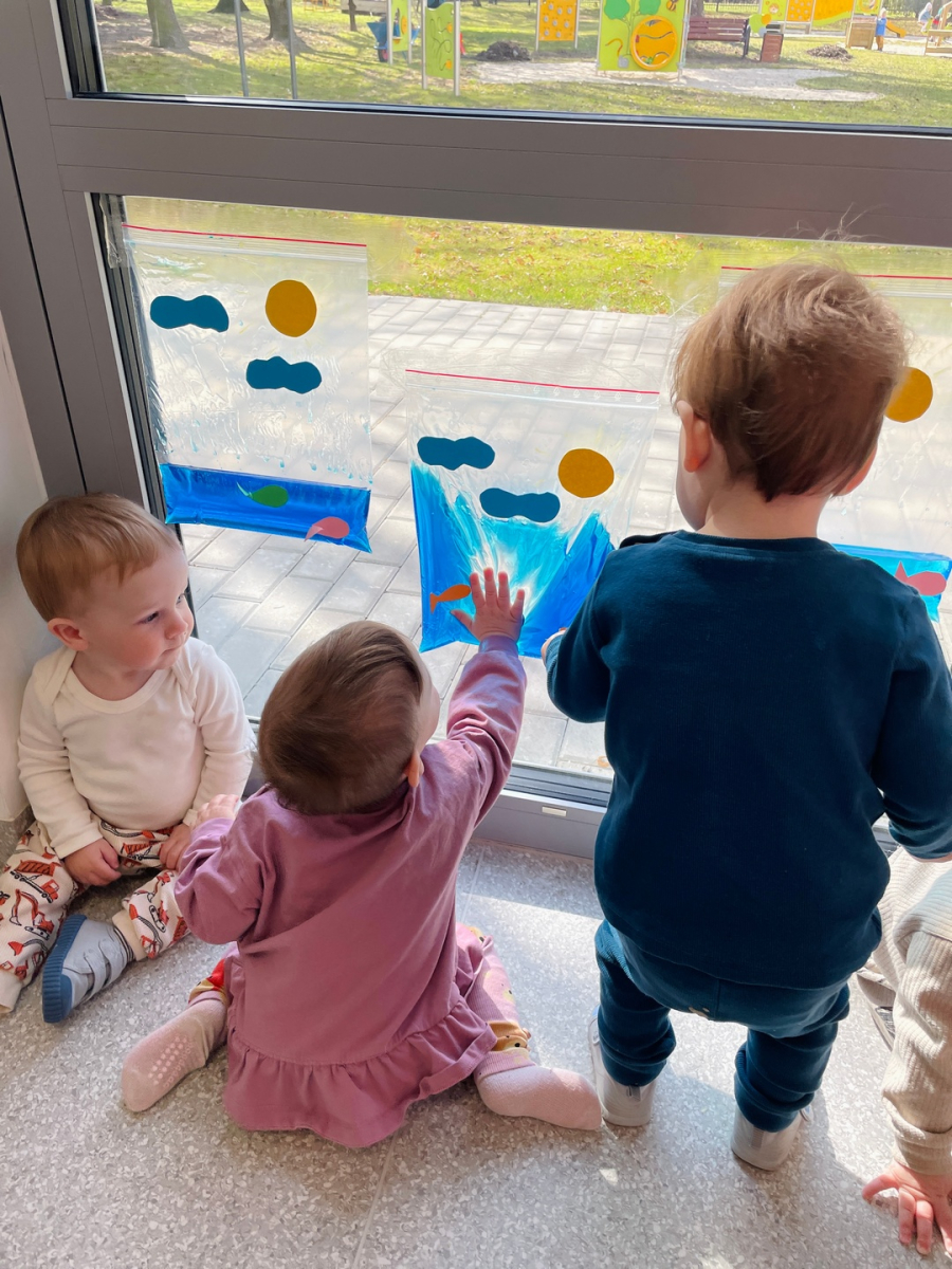 Nasze maluszki zamieniły się w małych badaczy! Wykorzystaliśmy wodne woreczki sensoryczne, by odkrywać świat kolorów i tekstur prosto na żłobkowej szybie. Było mnóstwo skupienia, ciekawskich spojrzeń i radosnego "pluskania" na sucho! Ale była zabawa :D.