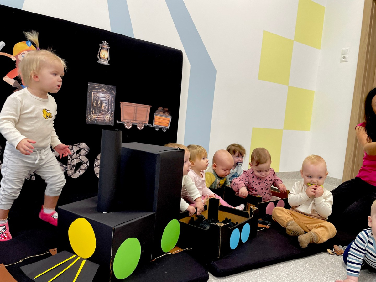 Dzień w naszej najmłodszej grupie Pszczółek rozpoczął się wyjątkowo – pod żłobkiem pojawiła się prawdziwa orkiestra górnicza, która zagrała specjalnie dla dzieci. Maluszki z zaciekawieniem obserwowały muzyków i ich kolorowe pióropusze. Następnie Pszczółki odwiedził górnik w galowym stroju przywitał się z naszymi maluszkami. Dzieci poczuły się jak prawdziwi górnicy, bo mogły wrzucać „węgiel” do lokomotywy i świetnie się przy tym bawić.