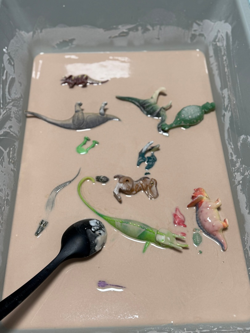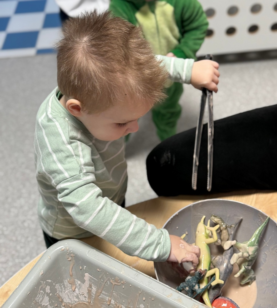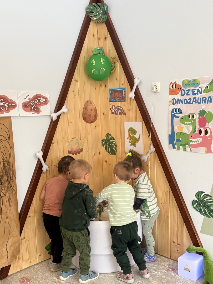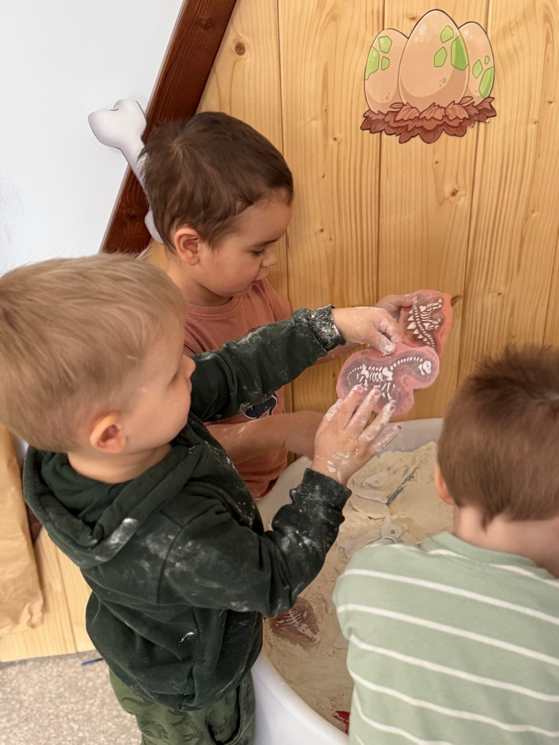 Dziś przenieśliśmy się w niezwykły, prehistoryczny świat pełen przygód! Nasze dzieci zamieniły się w małych odkrywców i z ogromnym zaangażowaniem poszukiwały „skarbów”, wykopując ukryte części dinozaurów niczym prawdziwi paleontolodzy. Powstały też piękne obrazki rysowane węglem, inspirowane dawnymi czasami, a mali pomocnicy z radością ratowali dinozaury z błotnych kąpieli. To był dzień pełen śmiechu, współpracy i fascynujących odkryć. Nauka poprzez zabawę to najlepsza przygoda - zwłaszcza gdy towarzyszą jej dinozaury i tyle dziecięcej radości!