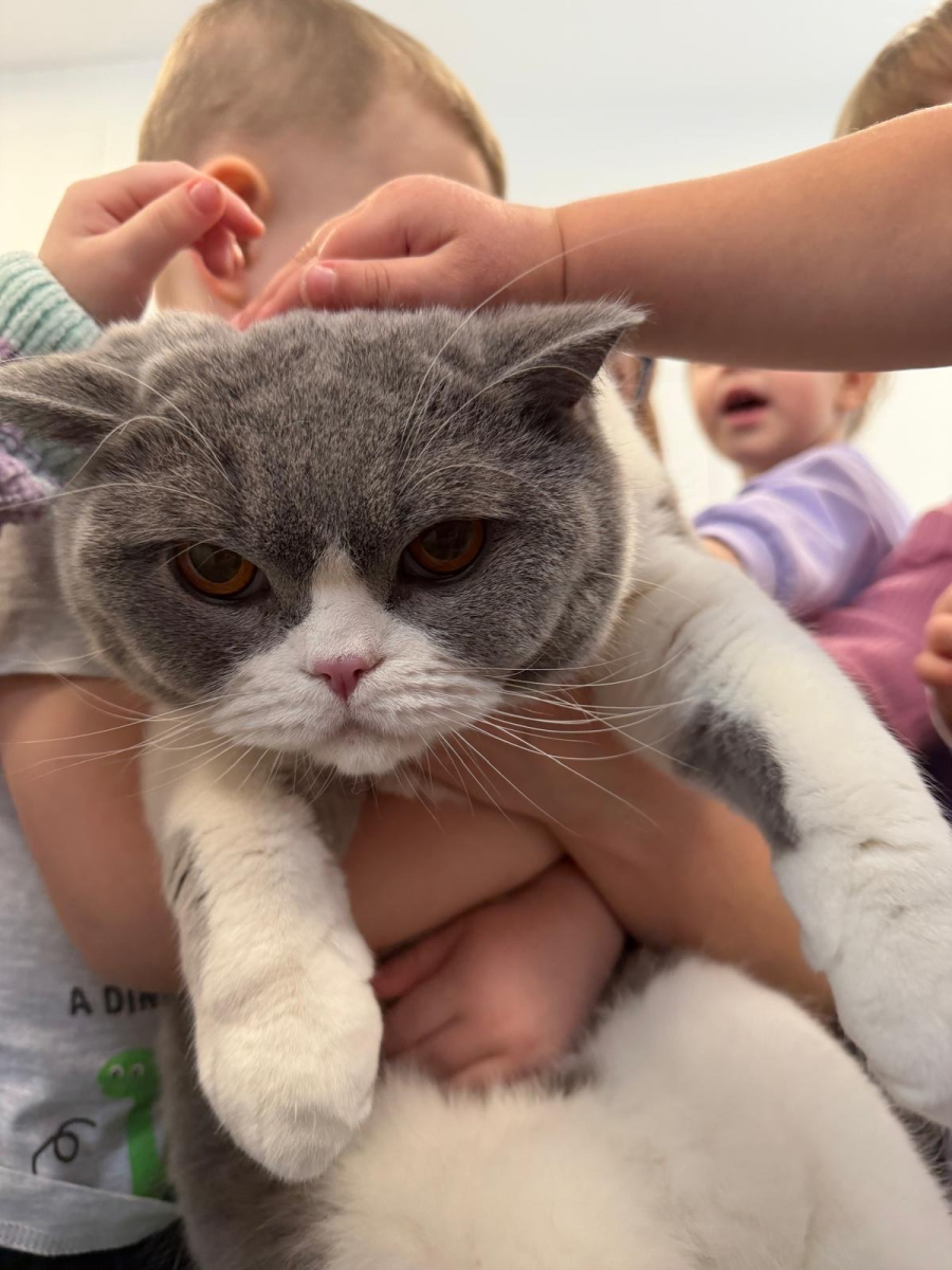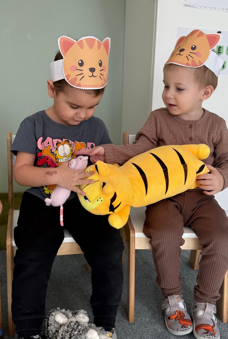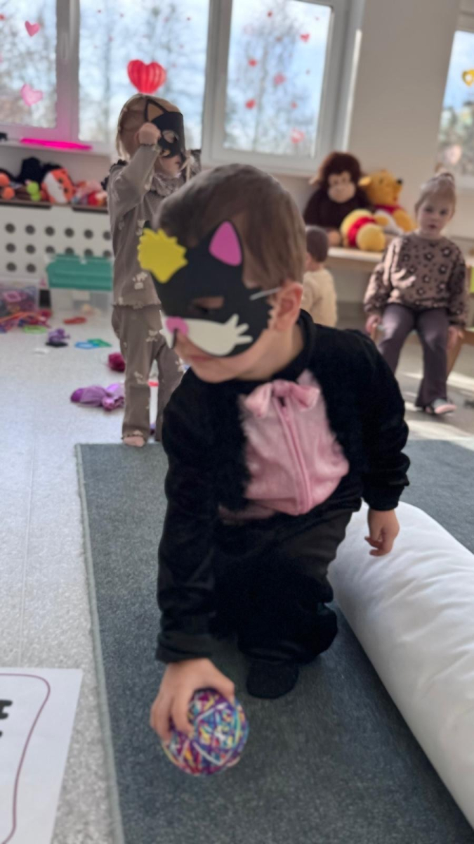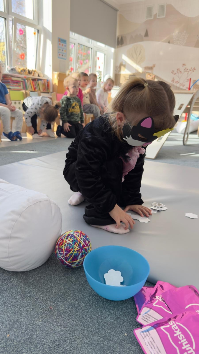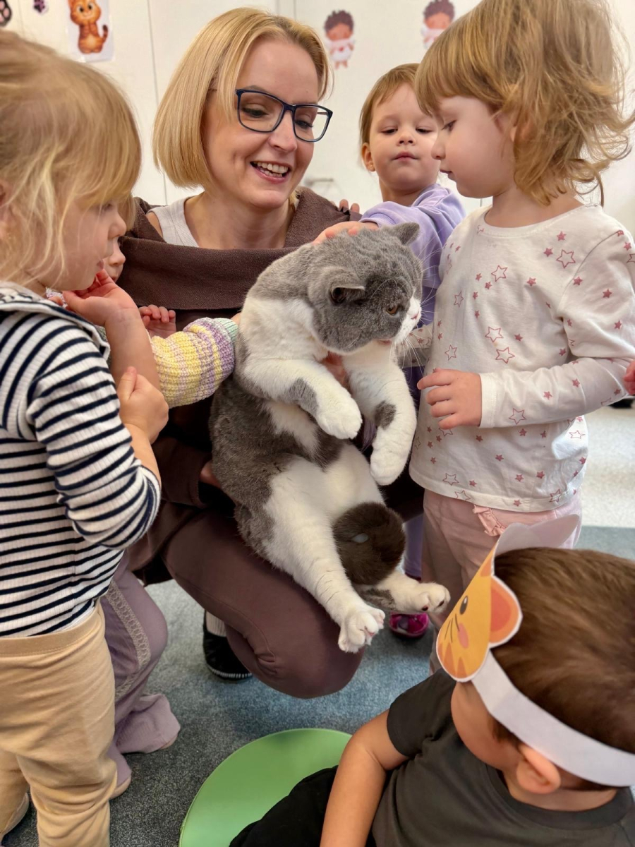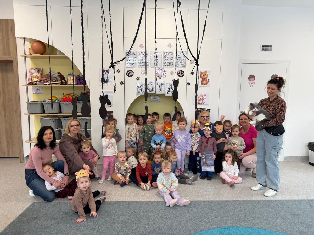 W naszym żłobku mieliśmy wyjątkowego gościa - odwiedził nas kot o imieniu Chips. To była wspaniała okazja do nauki i bliskiego spotkania z prawdziwym kotkiem. To była wspaniała okazja do nauki i bliskiego spotkania z prawdziwym mruczkiem. Dzieci utrwaliły informacje o tym, jak wygląda i jak żyje. Dowiedzieliśmy się, co jedzą koty, jak należy się przy nich zachowywać, oraz jak dbać o ich bezpieczeństwo. To spotkanie było nie tylko edukacyjne, ale też bardzo ważne wychowawczo. Kształtowaliśmy empatię , wrażliwość i szacunek wobec zwierząt. Najwięcej emocji wzbudziła jednak zabawa ruchowa! Maluszki miały możliwość przebrać się za kotki i wziąć udział w specjalnie przygotowanym torze przeszkód. Podczas tej aktywności ćwiczyły swoją sprawność, równowagę oraz koordynację ruchową.
