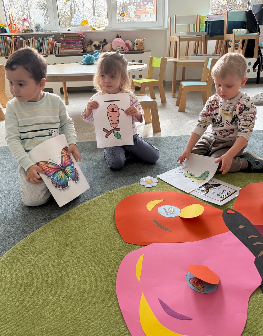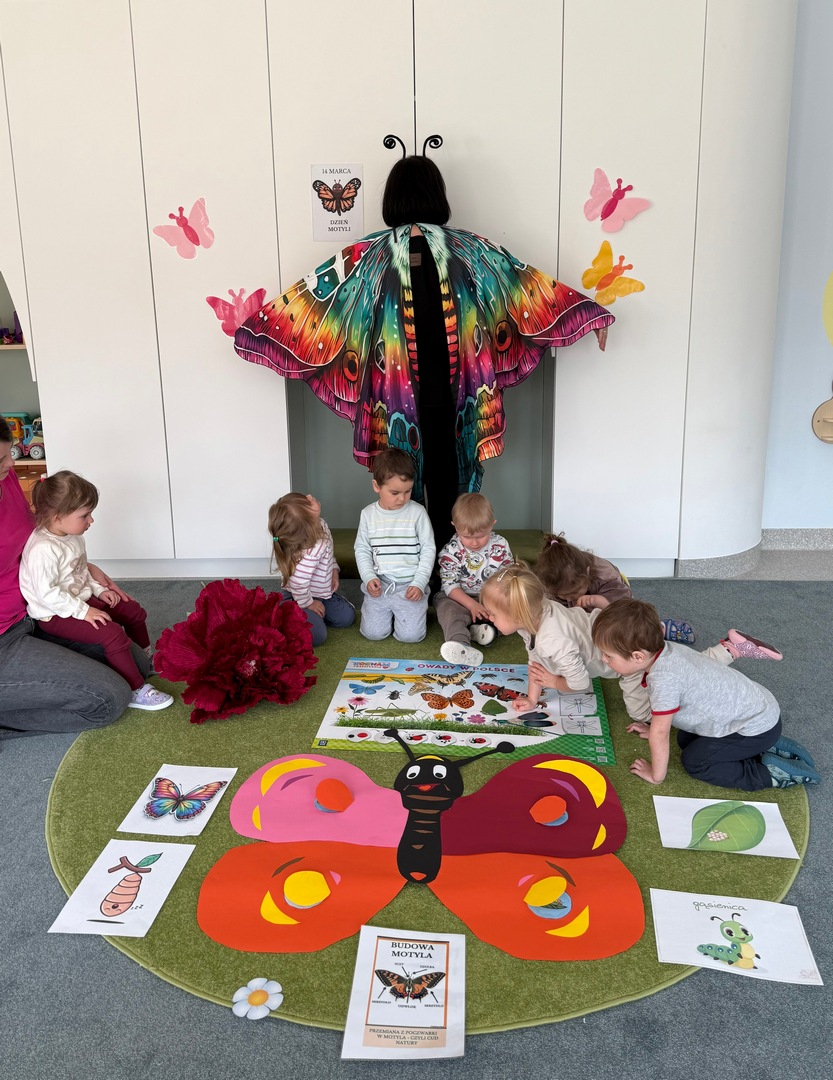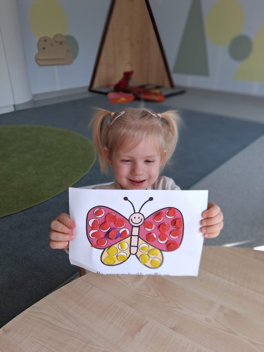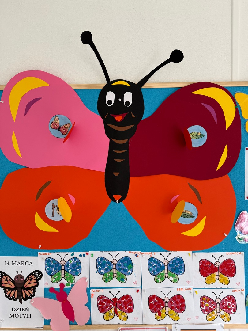 Podczas zajęć dzieci miały okazję poznać fascynujący cykl życia motyla - od małego jajeczka, przez gąsienicę i poczwarkę, aż po pięknego, kolorowego motyla. Było to nie tylko ciekawe, ale także inspirujące doświadczenie! Maluszki z wielkim zaangażowaniem tworzyły swoje własne prace plastyczne. Ćwicząc sprawność rączek, ugniatały plastelinę i komponowały z niej barwne motyle. Każda praca była wyjątkowa i pełna dziecięcej wyobraźni. Na zakończenie, na pamiątkę tego wyjątkowego dnia, wykonaliśmy piękne motylkowe bransoletki, które dzieci z dumą zabrały do domu. To był dzień pełen radości, kreatywności i nowych odkryć!