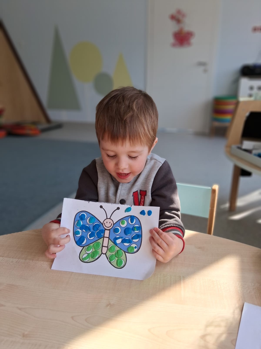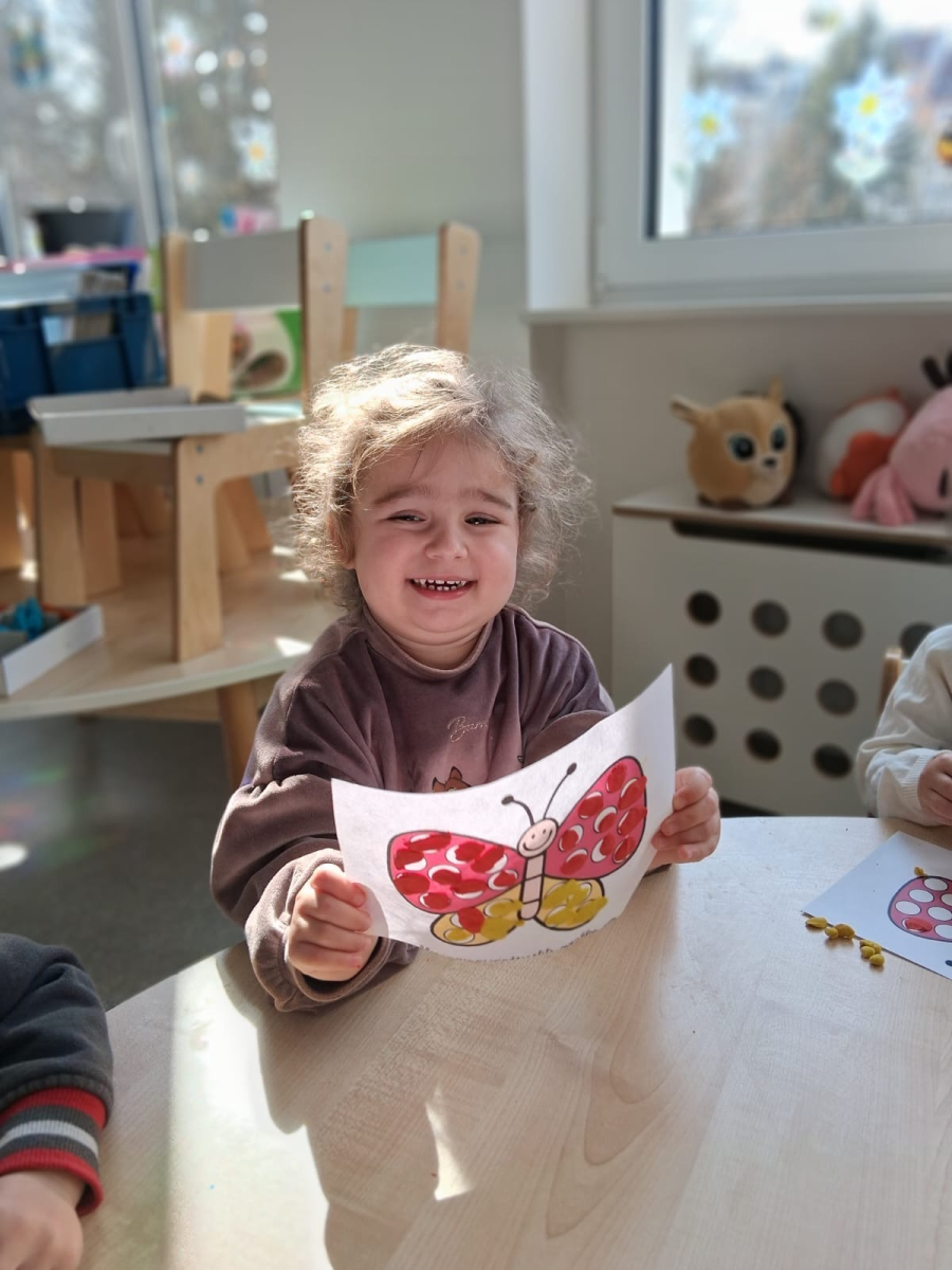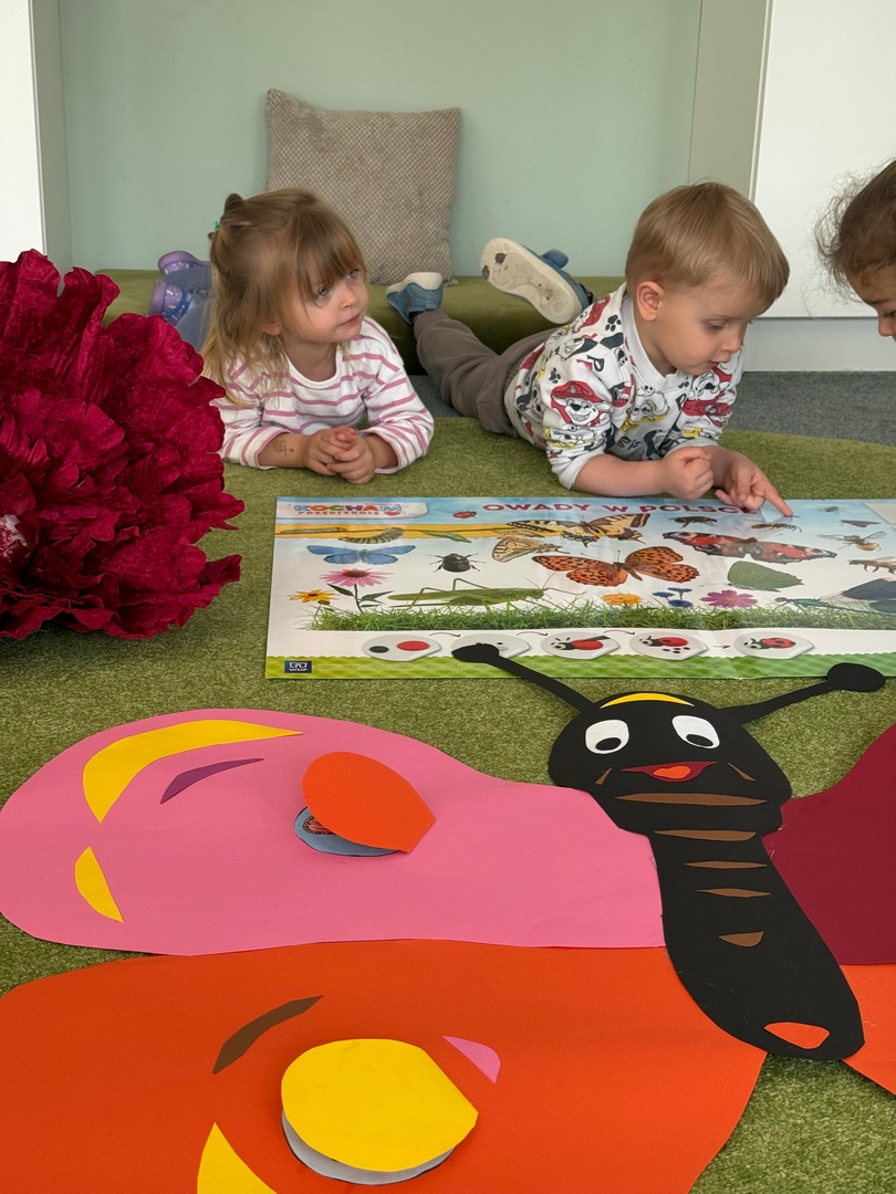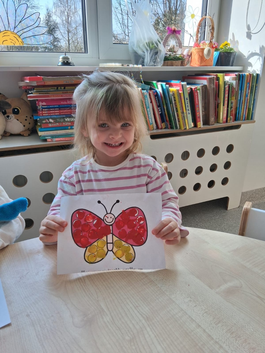 Podczas zajęć dzieci miały okazję poznać fascynujący cykl życia motyla - od małego jajeczka, przez gąsienicę i poczwarkę, aż po pięknego, kolorowego motyla. Było to nie tylko ciekawe, ale także inspirujące doświadczenie! Maluszki z wielkim zaangażowaniem tworzyły swoje własne prace plastyczne. Ćwicząc sprawność rączek, ugniatały plastelinę i komponowały z niej barwne motyle. Każda praca była wyjątkowa i pełna dziecięcej wyobraźni. Na zakończenie, na pamiątkę tego wyjątkowego dnia, wykonaliśmy piękne motylkowe bransoletki, które dzieci z dumą zabrały do domu. To był dzień pełen radości, kreatywności i nowych odkryć!