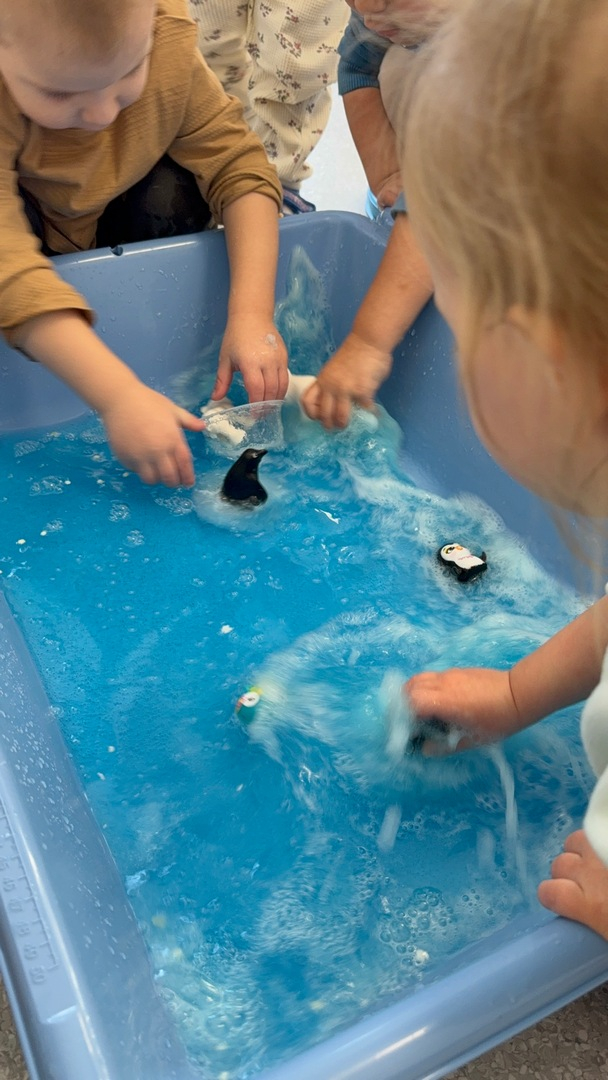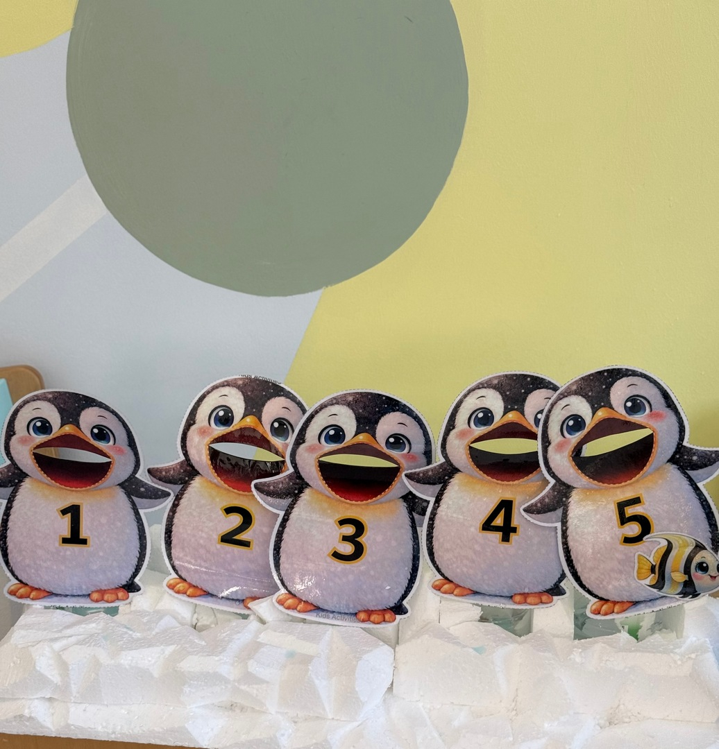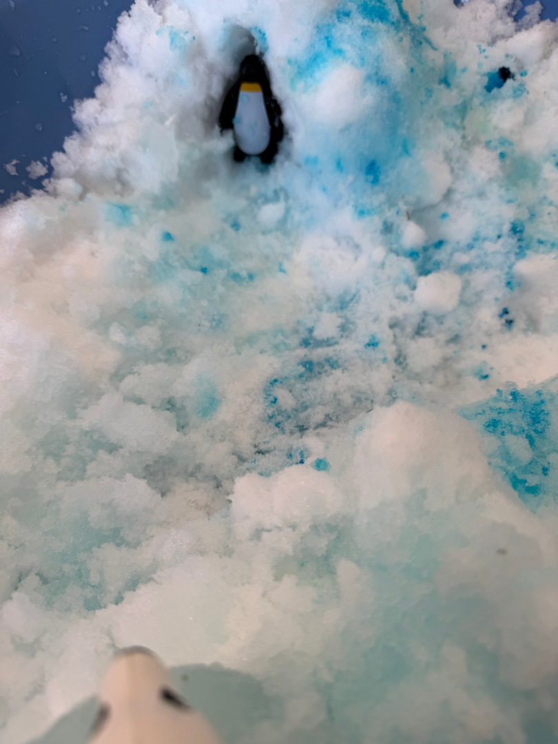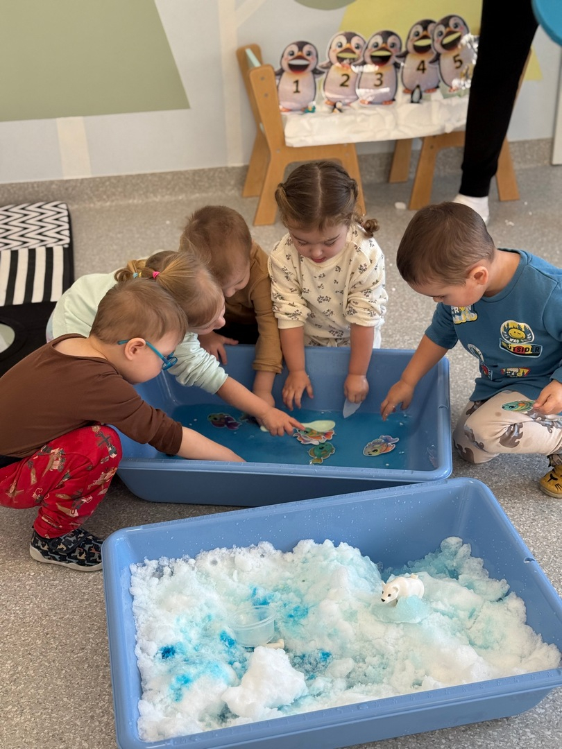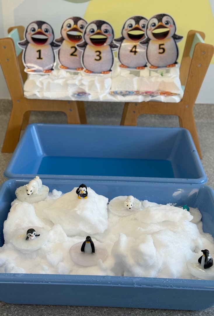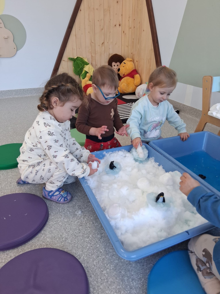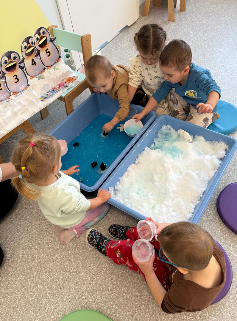 Dzień Pingwina w grupie Sówki był pełen radości i wspaniałej zabawy. Dzieci z ogromnym zainteresowaniem poznawały życie pingwinów poprzez zabawy sensoryczne z prawdziwą krą, lodowcem oraz śniegiem. Mogły dotknąć, poczuć i doświadczyć „zimnego świata” tych niezwykłych ptaków. Na zakończenie maluchy karmiły pingwiny złowionymi rybkami, ucząc się przy tym pierwszych cyferek :).