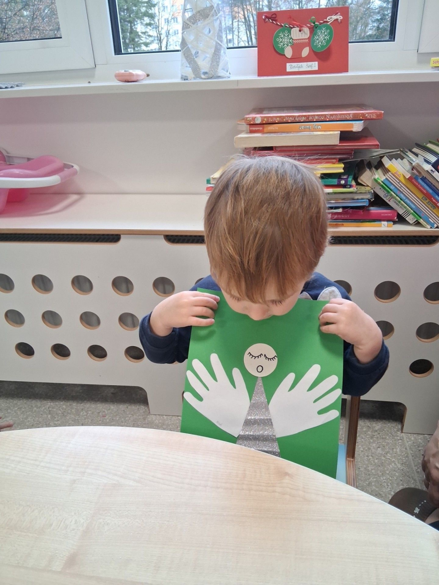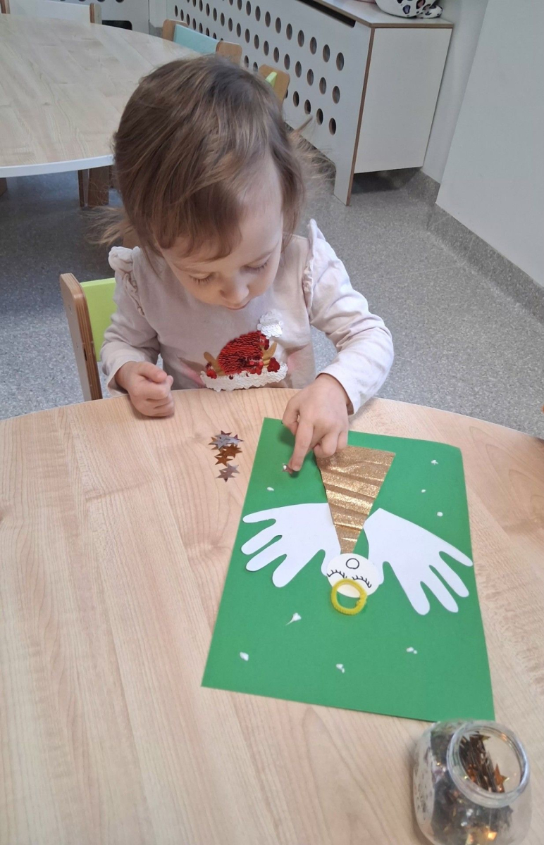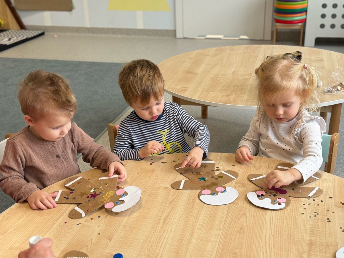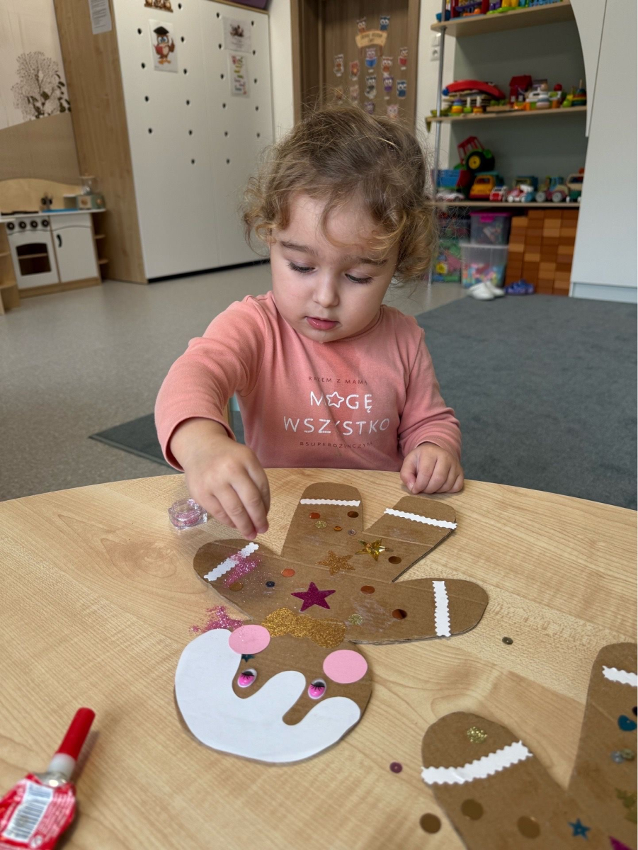 W grupie „Sówki” powstają kreatywne, świąteczne prace plastyczne – anioły, choinki i piernikowe ozdoby. Dzieci z zaangażowaniem tworzą małe dzieła sztuki, wprowadzając do sali prawdziwie magiczny, świąteczny nastrój.