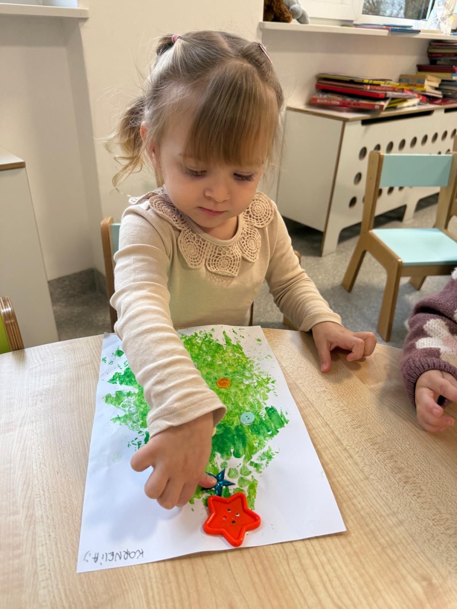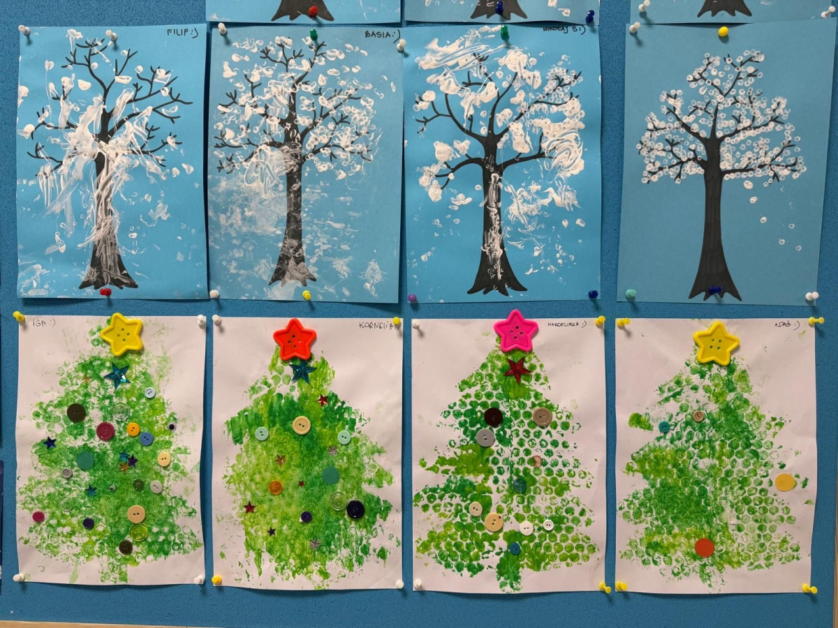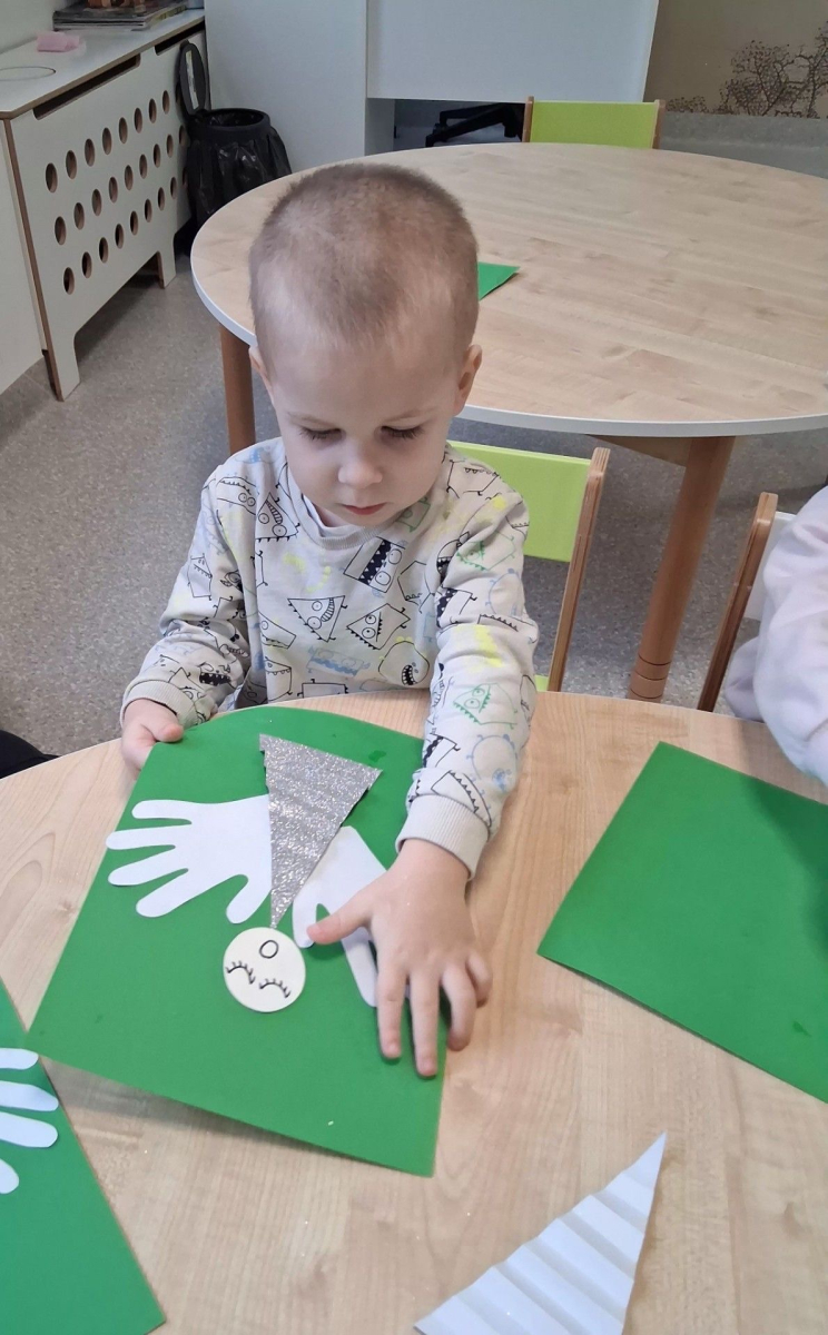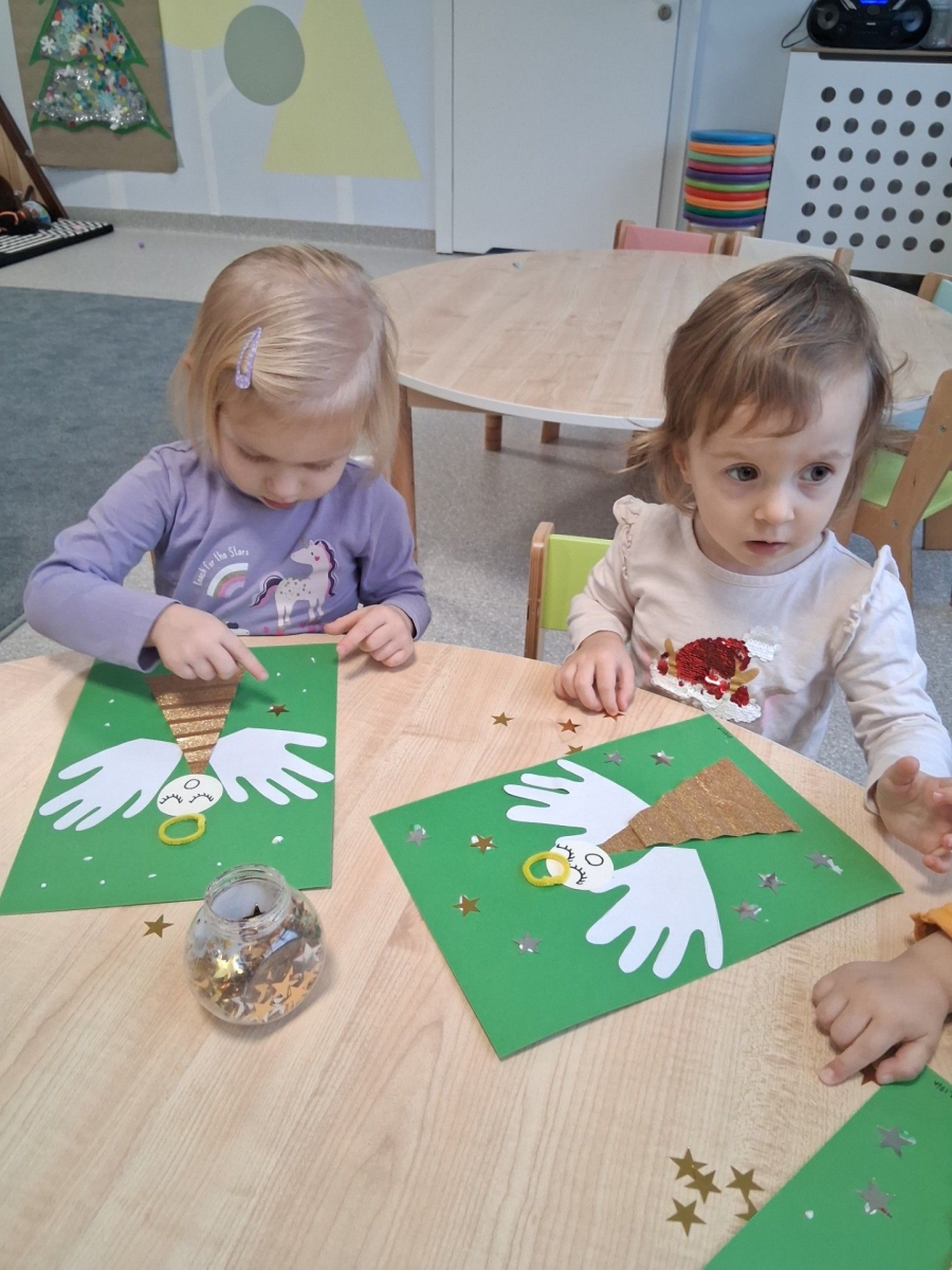 W grupie „Sówki” powstają kreatywne, świąteczne prace plastyczne – anioły, choinki i piernikowe ozdoby. Dzieci z zaangażowaniem tworzą małe dzieła sztuki, wprowadzając do sali prawdziwie magiczny, świąteczny nastrój.
