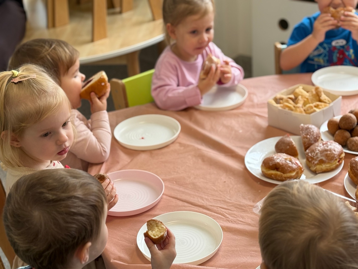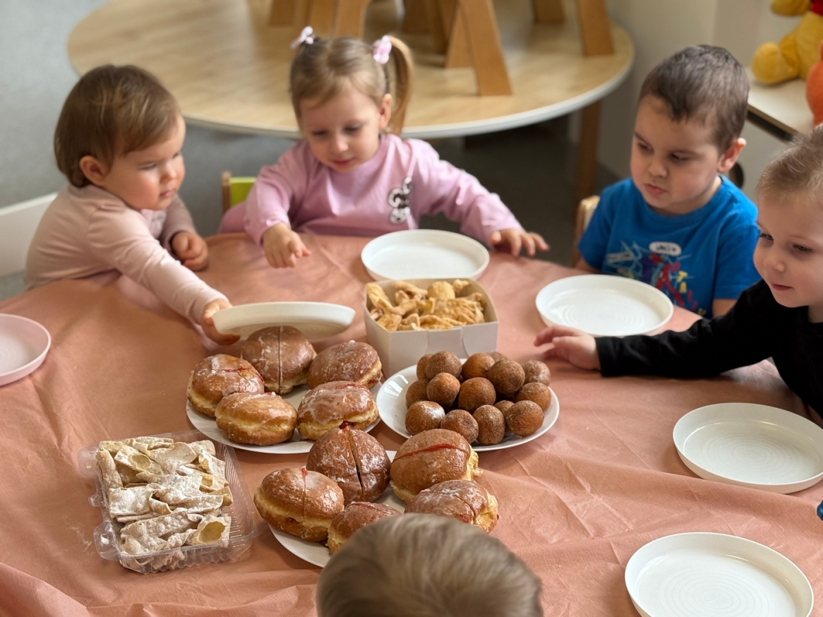 Tłusty Czwartek w naszej grupie był pełen radości i słodkich smaków. Dzieci z apetytem degustowały pyszne pączki, chrupiące faworki i inne smakołyki. Nie zabrakło też twórczej zabawy - Sówki wykonały piękne prace plastyczne, ozdabiając własne pączki kolorową posypką i lukrem. Było słodko, kreatywnie i bardzo wesoło!