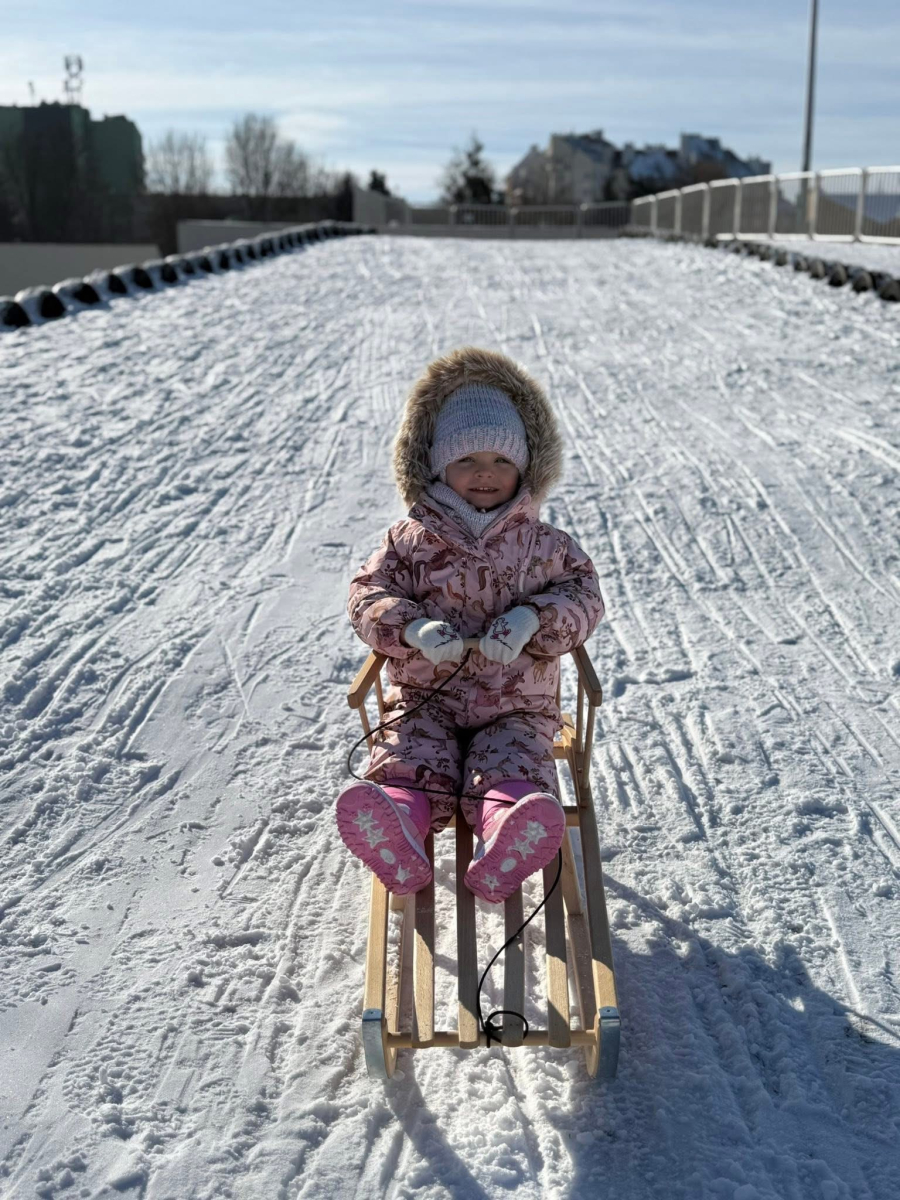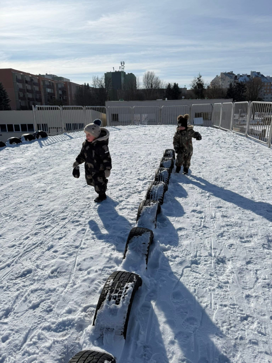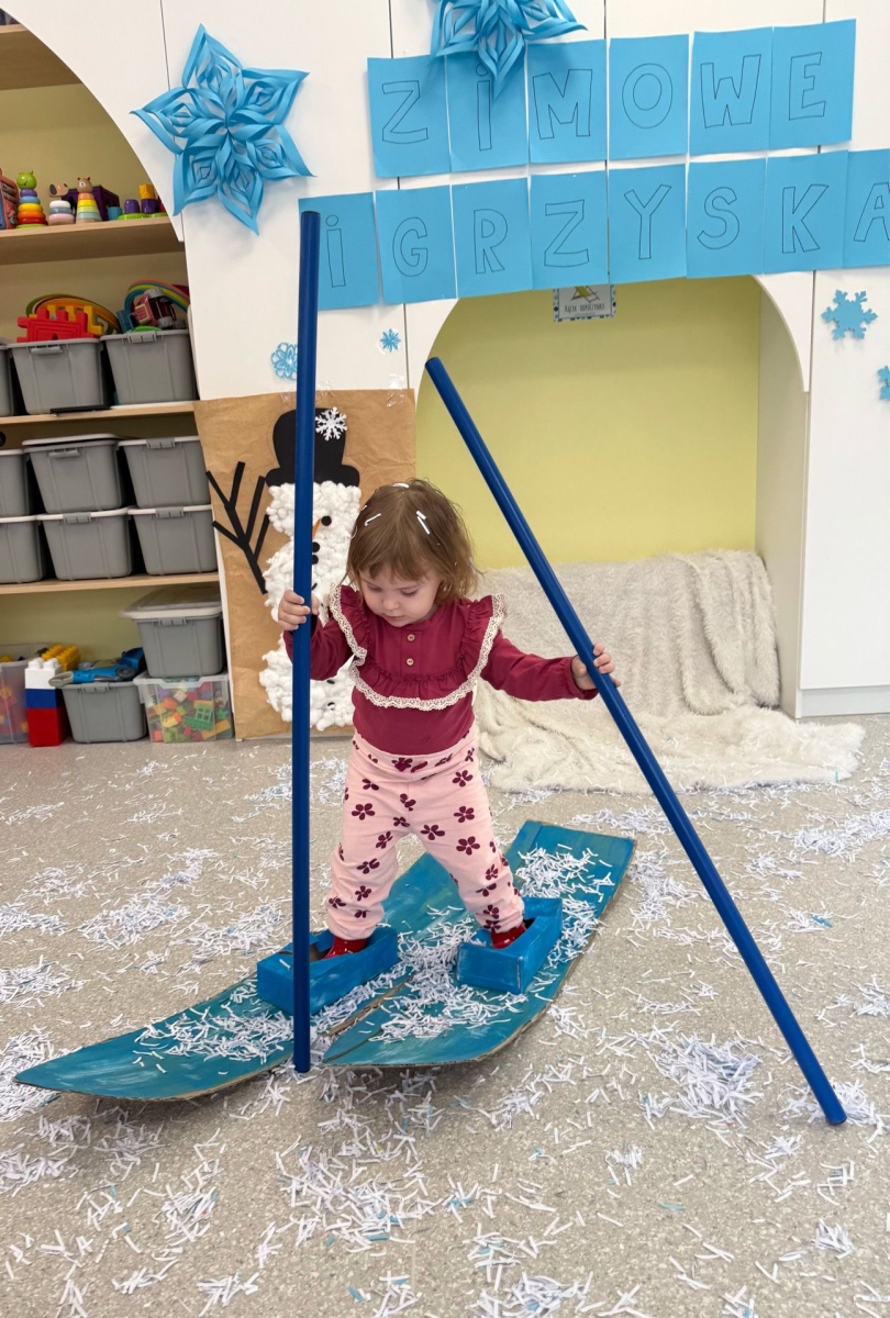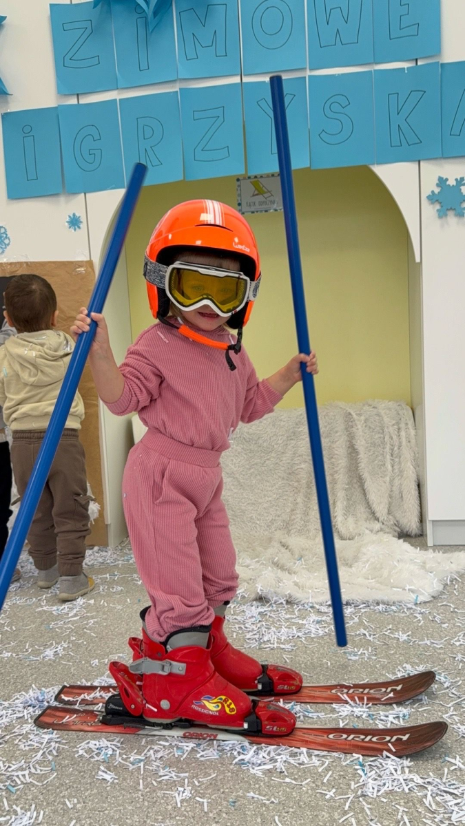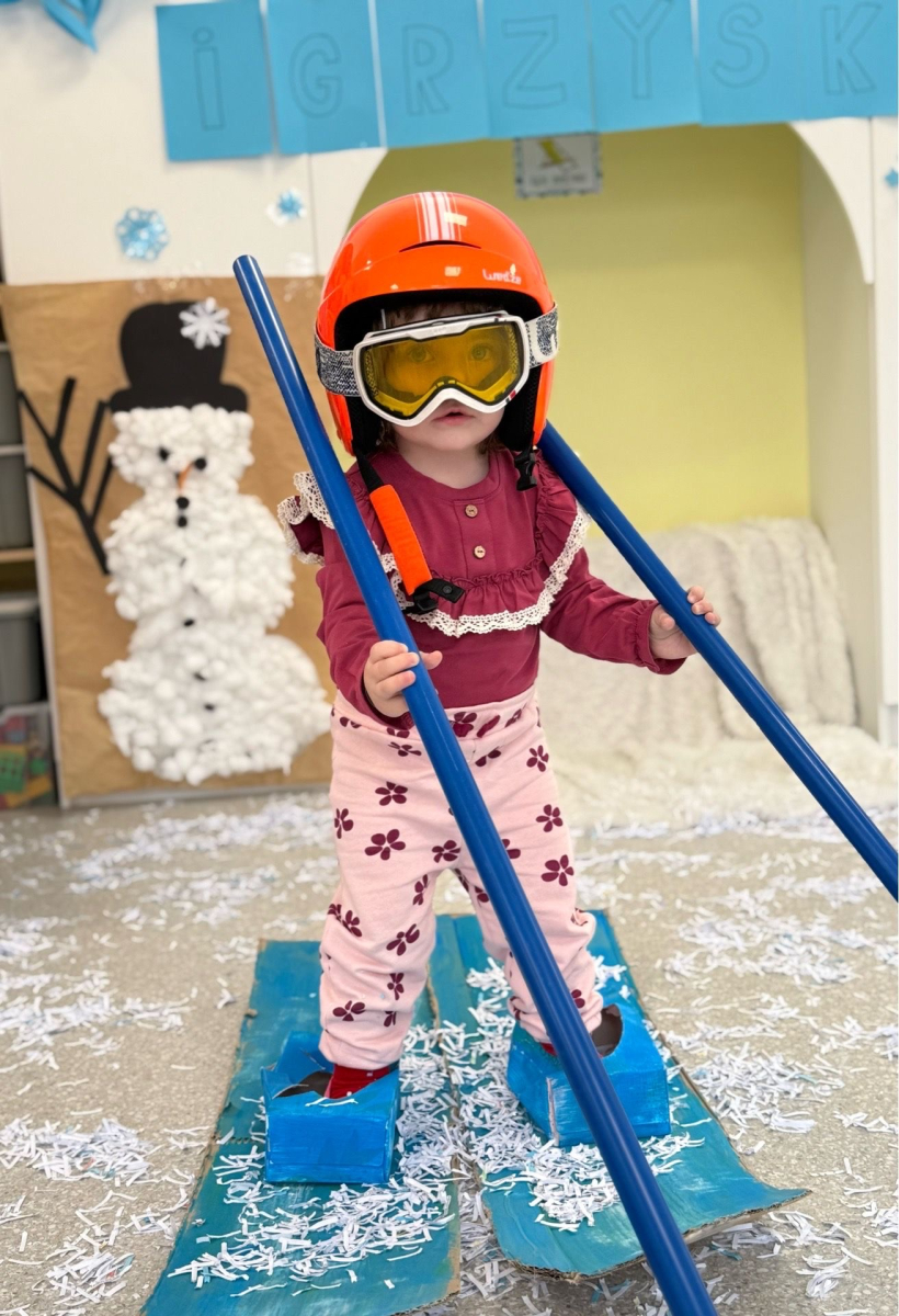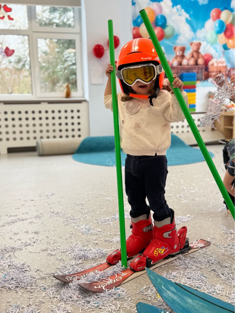Zimowa aura zachęciła nas do wyjścia na świeże powietrze, gdzie na górce czekała prawdziwa frajda - zjazdy na sankach, śmiech i rumiane policzki pełne szczęścia. Dzieci z radością bawiły się też się w sali na „śniegu”, stawiając swoje pierwsze, nieśmiałe kroki na nartach. To ciepłe i pełne uśmiechu chwile, które delikatnie zachęcają do ruchu i wspólnej zabawy i tworzą piękne wspomnienia.